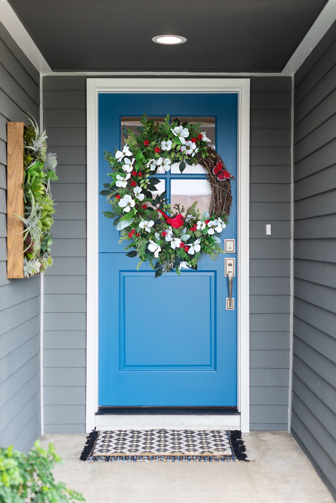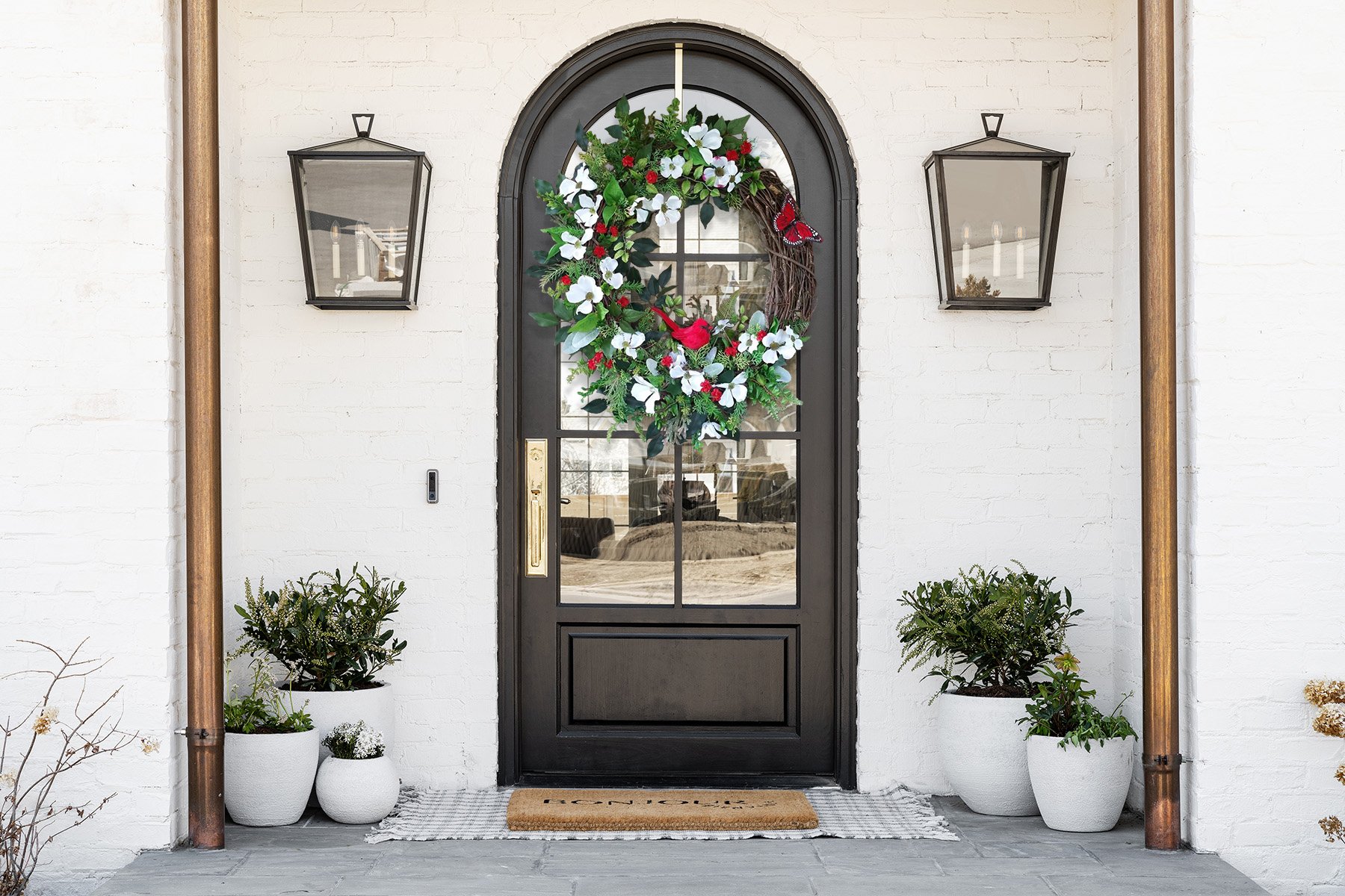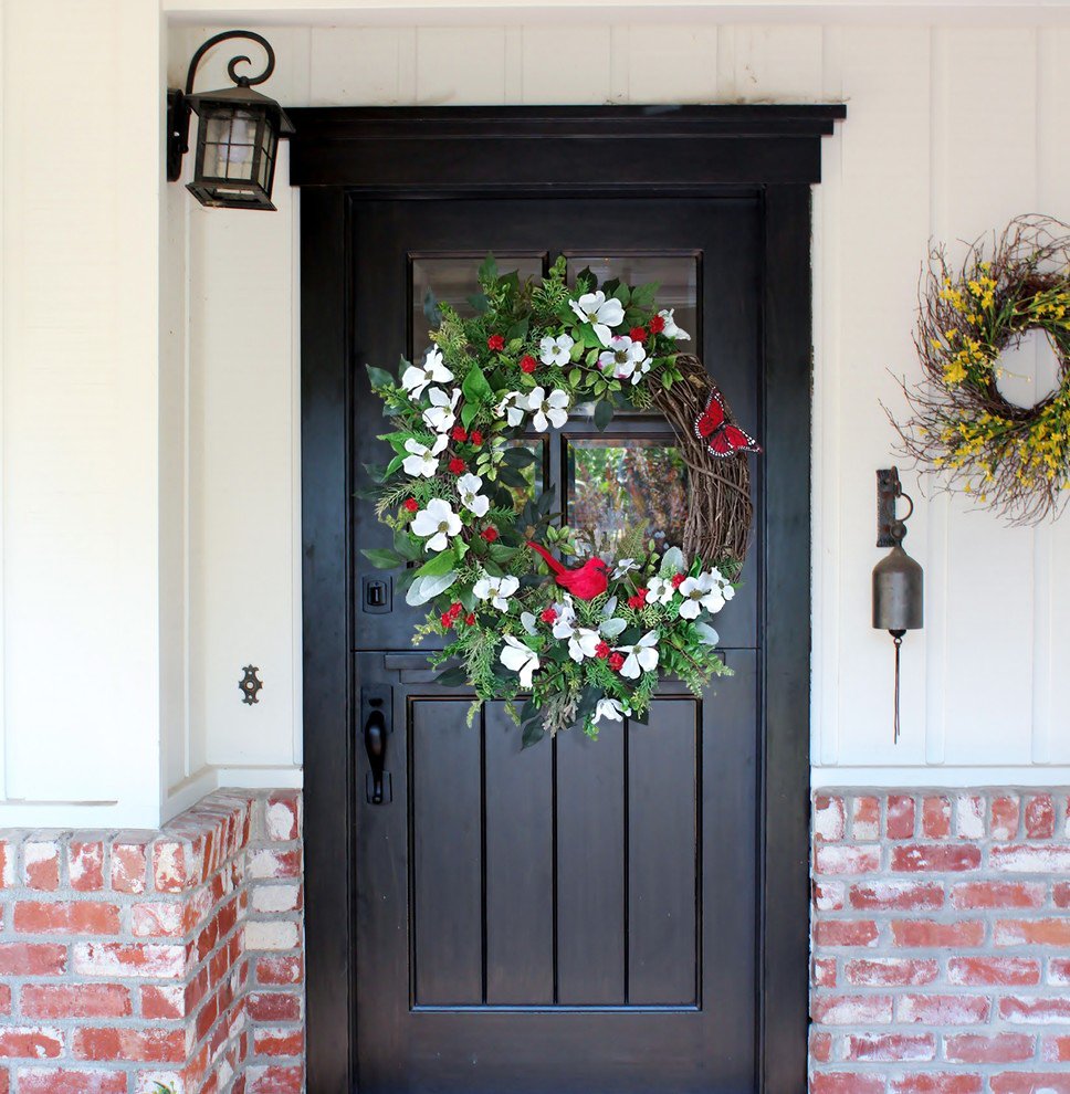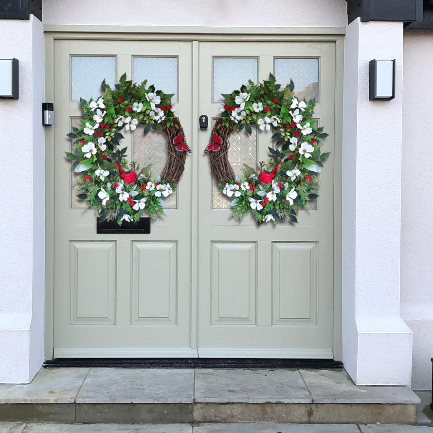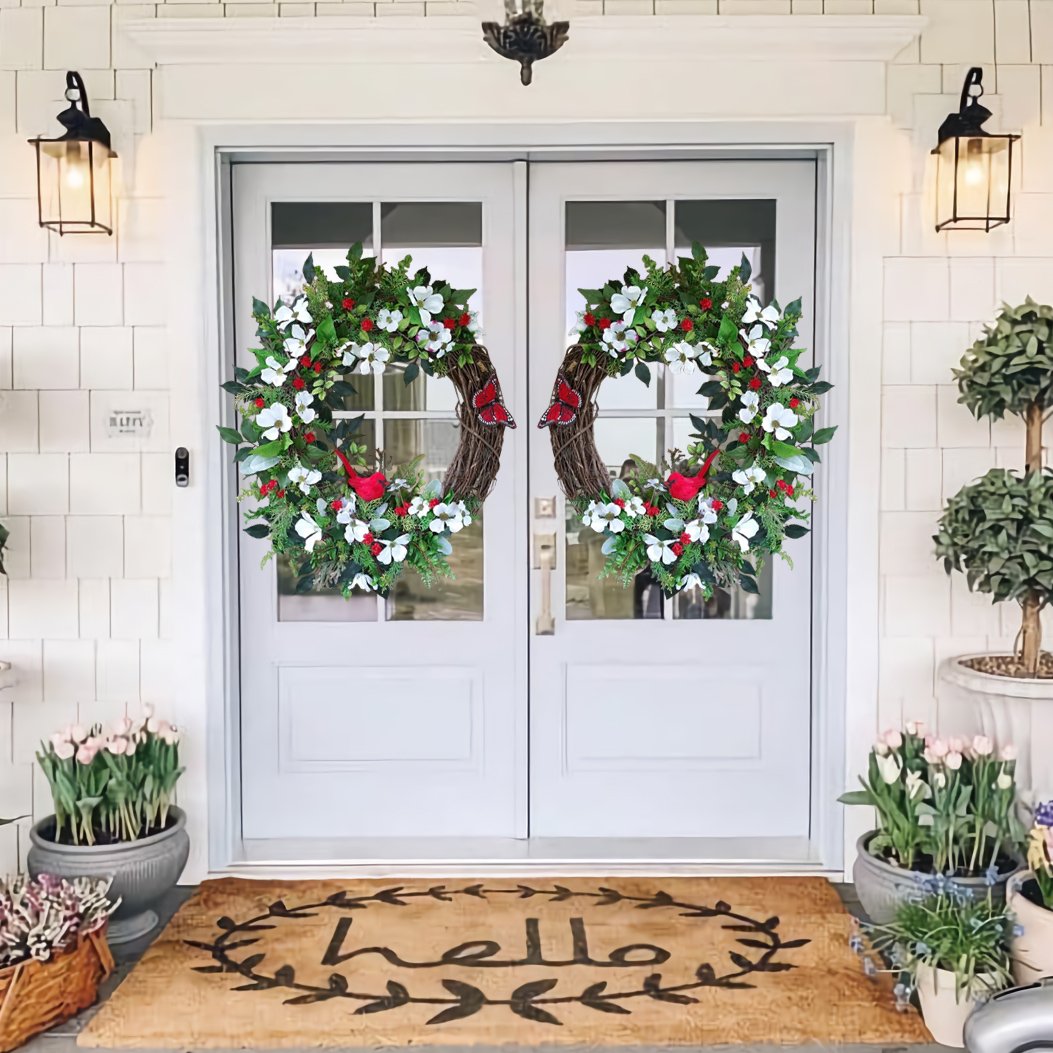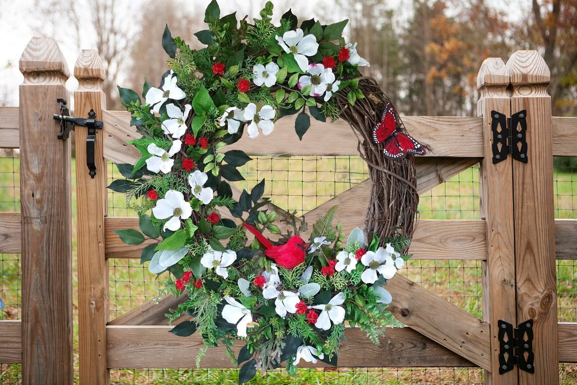 This beautiful and elegant Cardinal Butterfly Dogwood Wreath has a Cardinal surrounded by realistic white Dogwood Flowers, small red flowers, and many kinds of full, yet airy greenery.💐This Cardinal Dogwood Wreath Spring Wreath is a beautiful addition to any front door, mantle, wall, entryway. Adds rustic charm to your home during the spring.