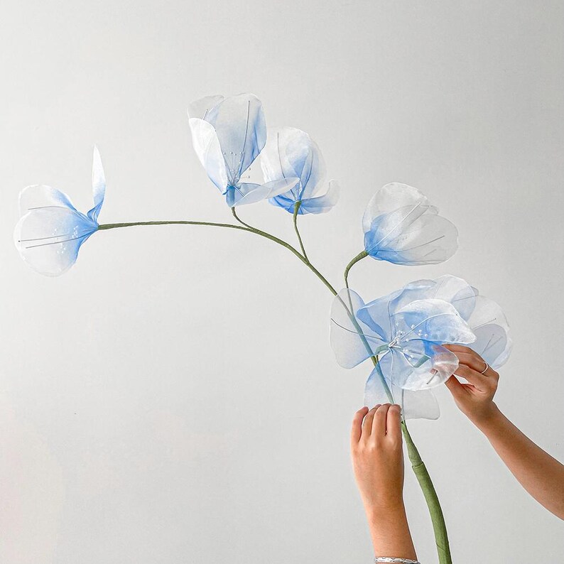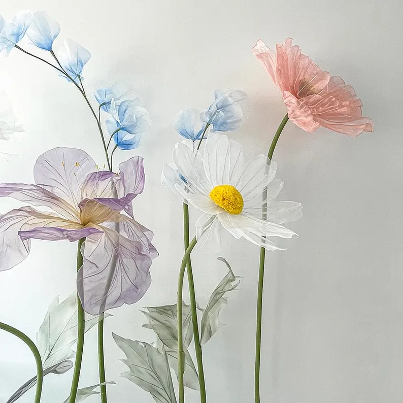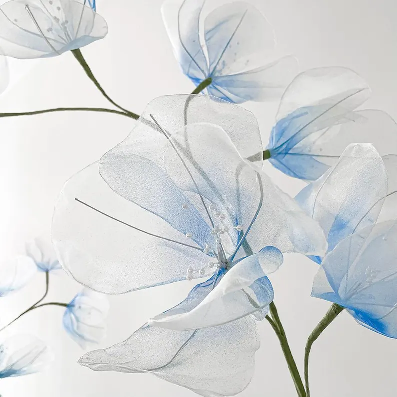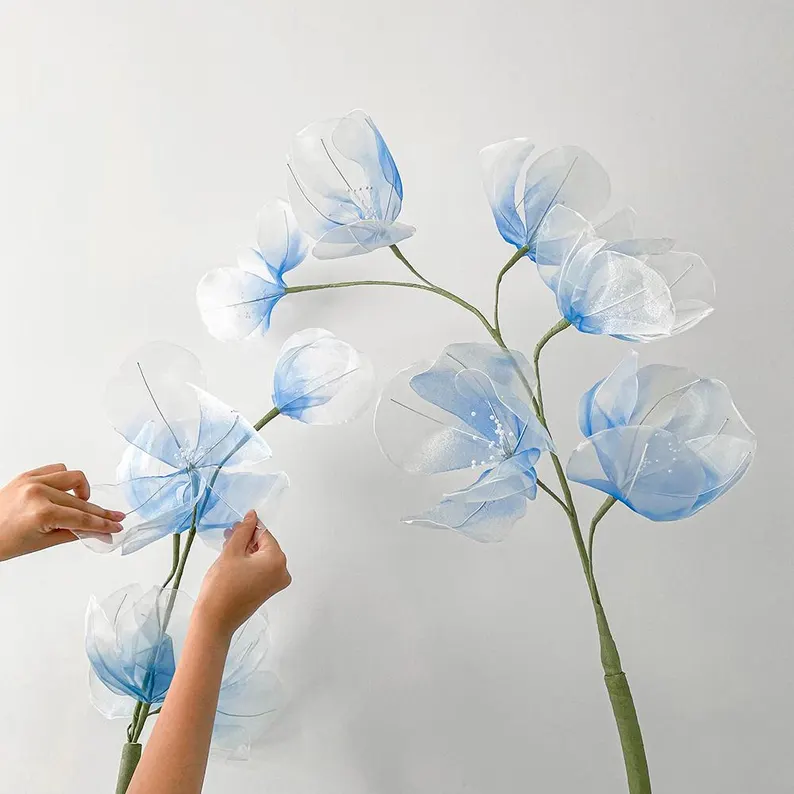Flowers crafted from organza fabrics, stems wrapped in crepe paper, leaves finished with either organza or crepe paper