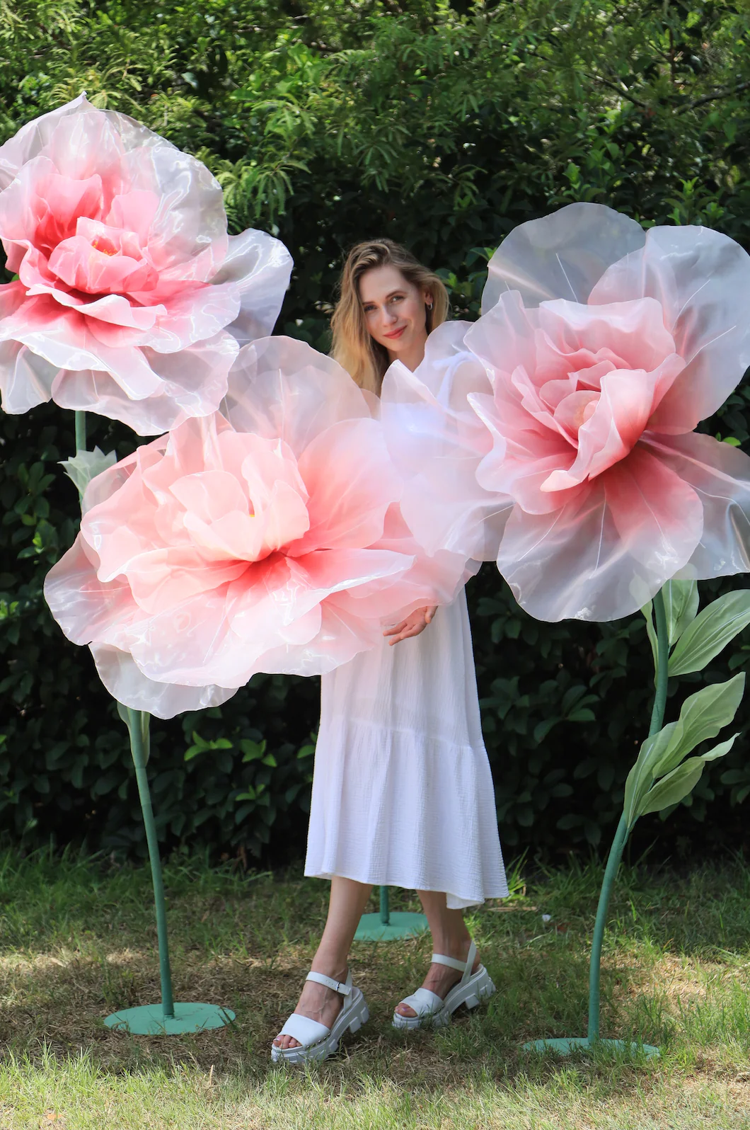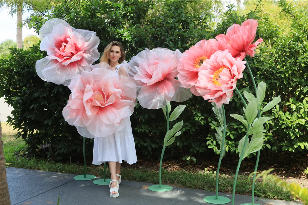 Our stunning giant flower decor has a beautiful shape and excellent workmanship. It can be disassembled at will for easy transportation. One person can complete the assembly. The height of the liftable base can be adjusted arbitrarily. The flower stem of the aluminum-plastic tube can be bent into the desired shape,outdoor waterproof.