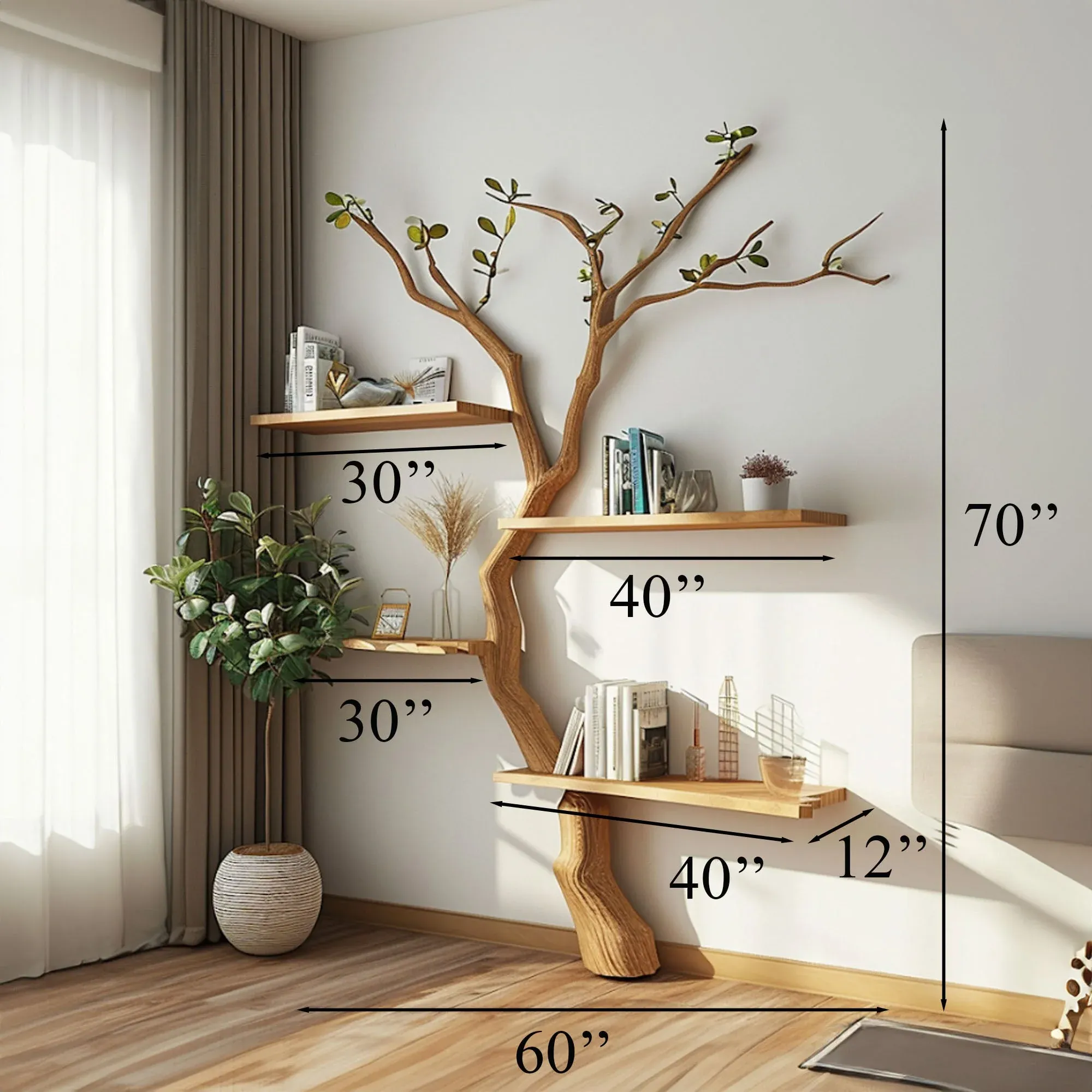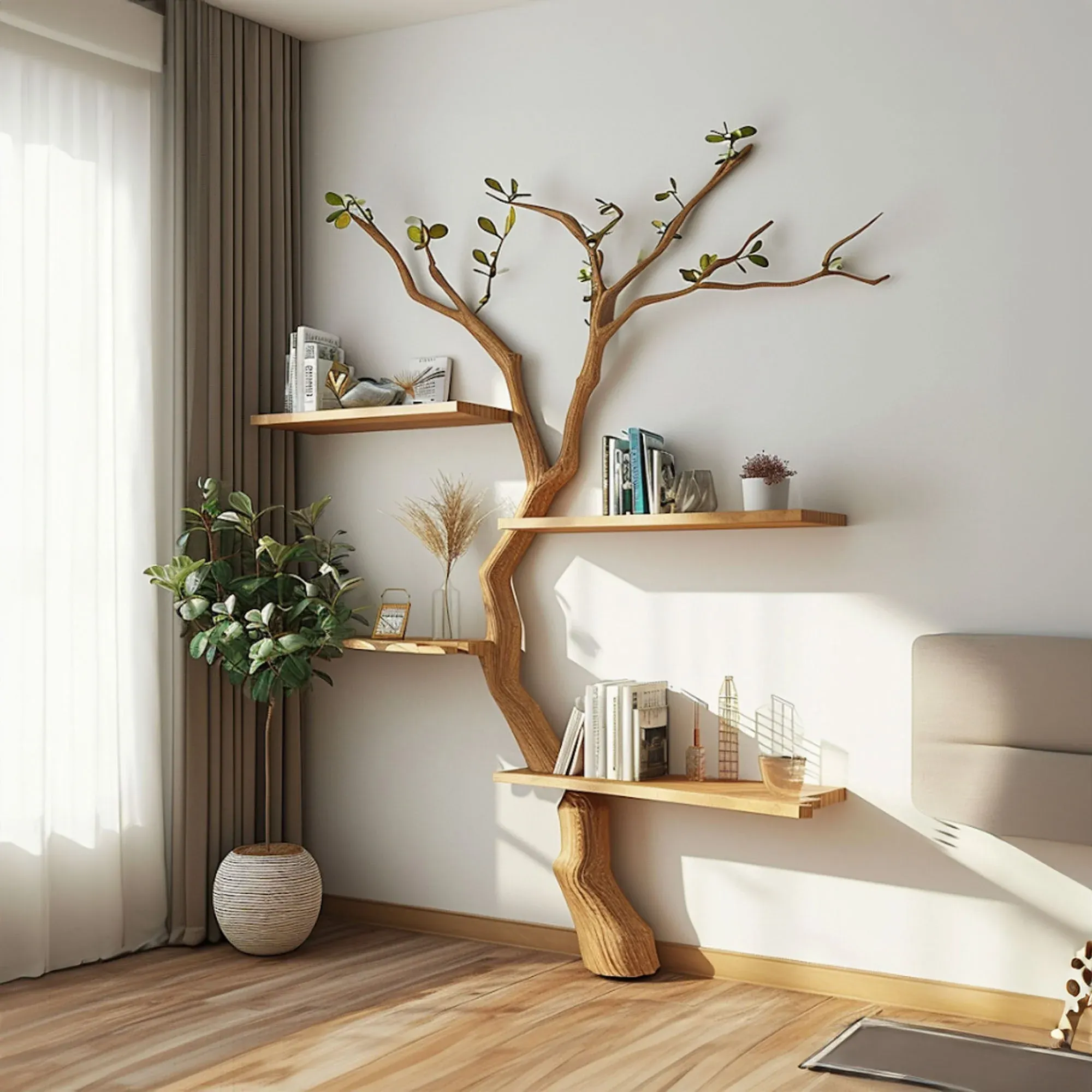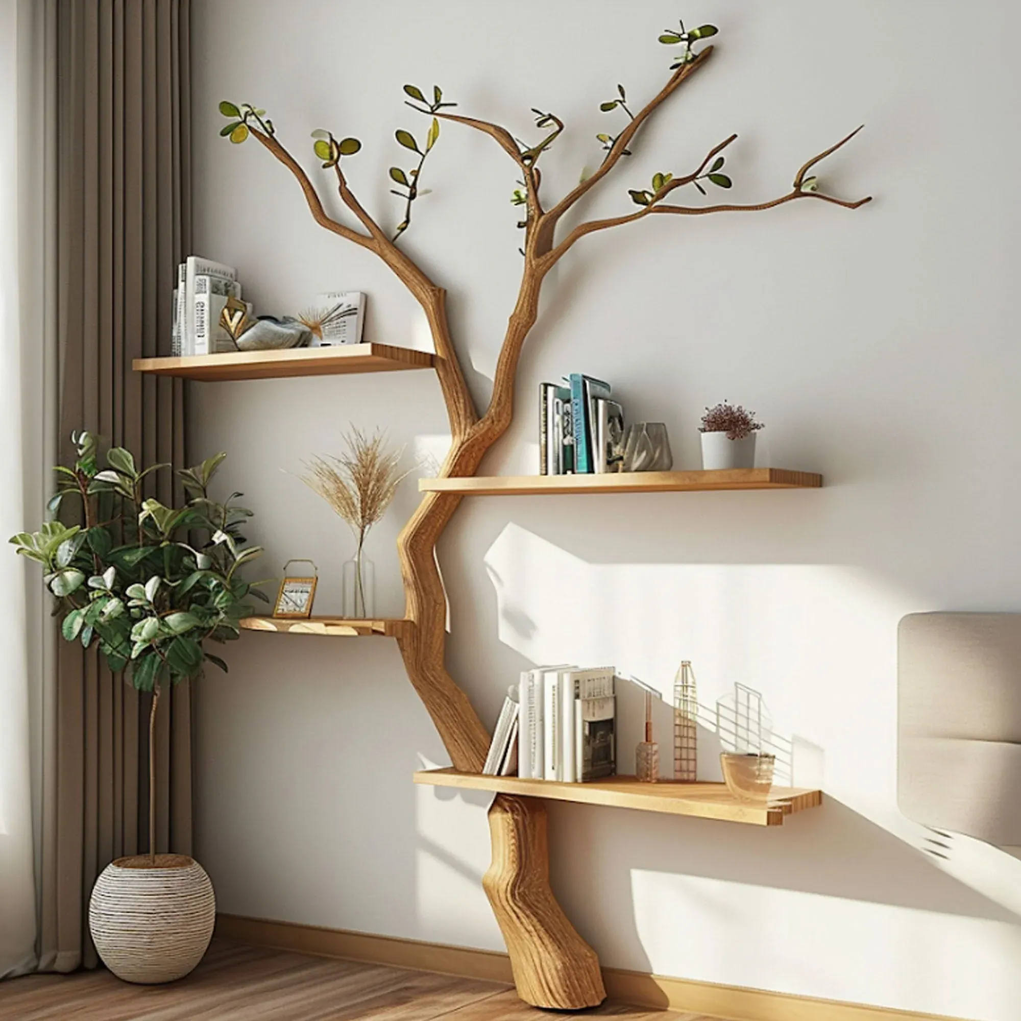 Harmonizing with the intimacy of nature and the flexibility of bookshelves, Spry Interior has created an artistic masterpiece - Treebook shelves. It offers an enhancement in the quality of living spaces, providing versatility to display various items and instilling complete confidence in its sturdiness.