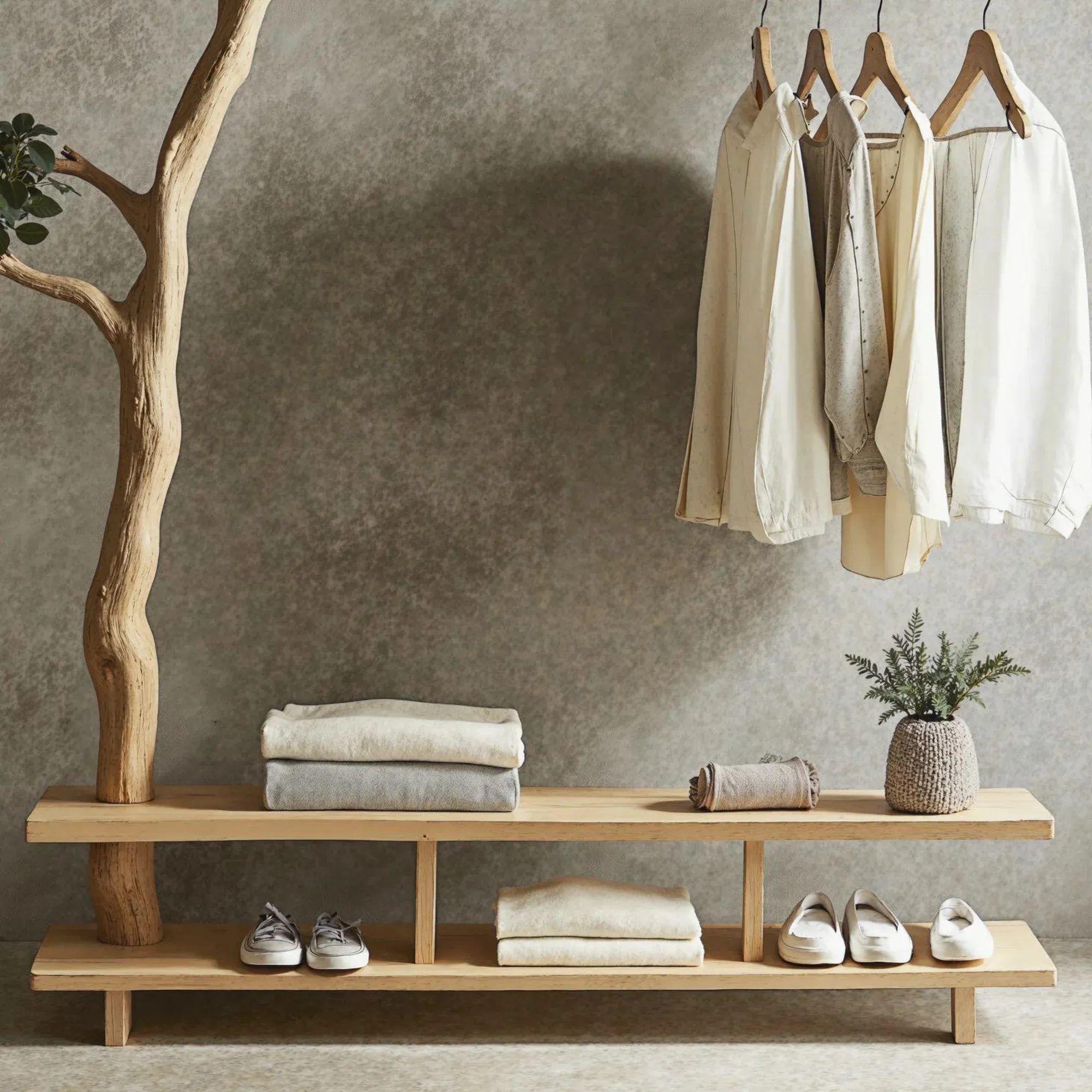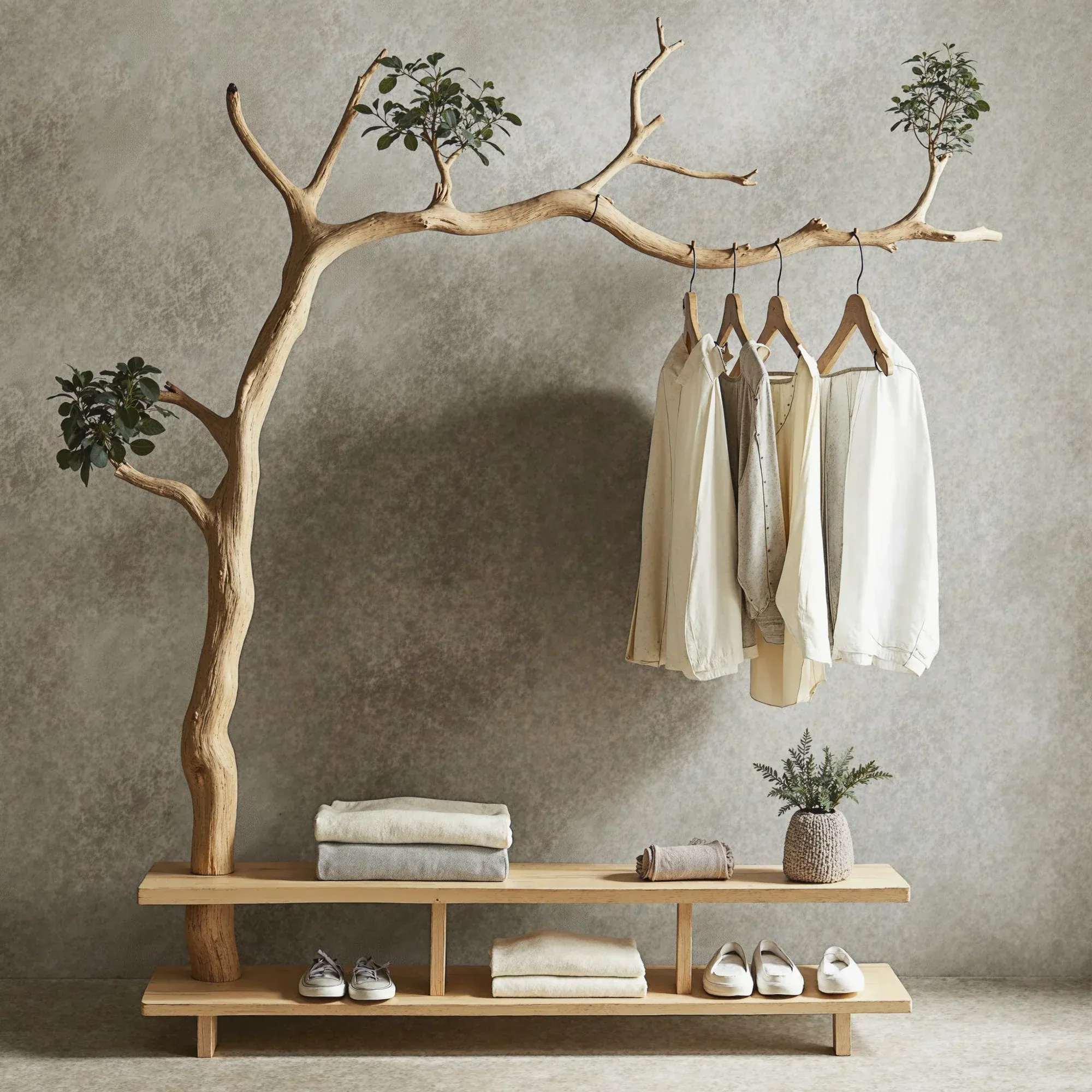 Bring a fresh and creative touch to your living space with a one-of-a-kind tree-shaped clothes and shoe rack. This product mimics the natural form of a tree, featuring soft, curving branches that add a stunning, unique element to any room.