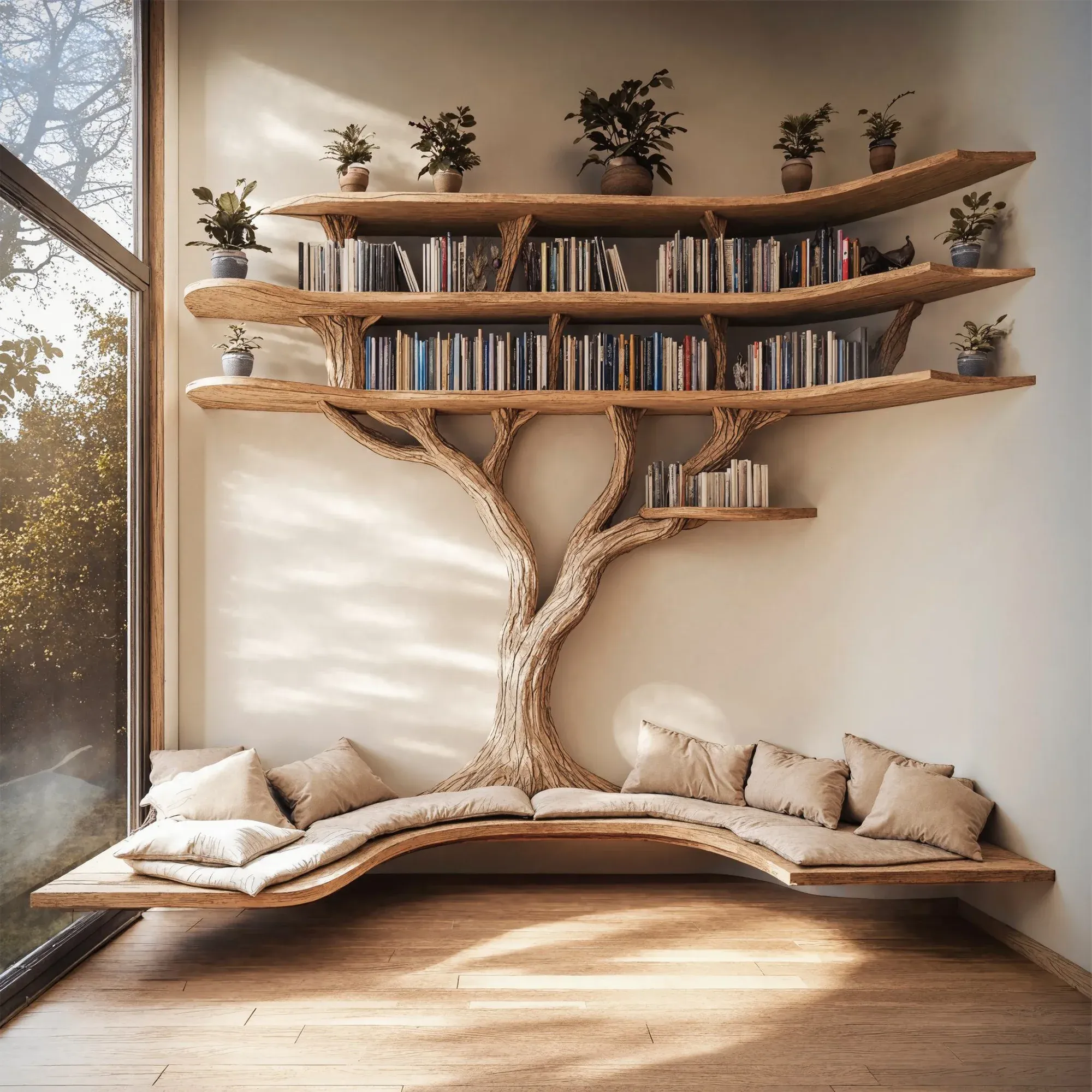 The Tree Branch Bookshelf with U-Shaped Bench combines style and storage, creating a striking focal point with space for books, decor, and comfortable seating.