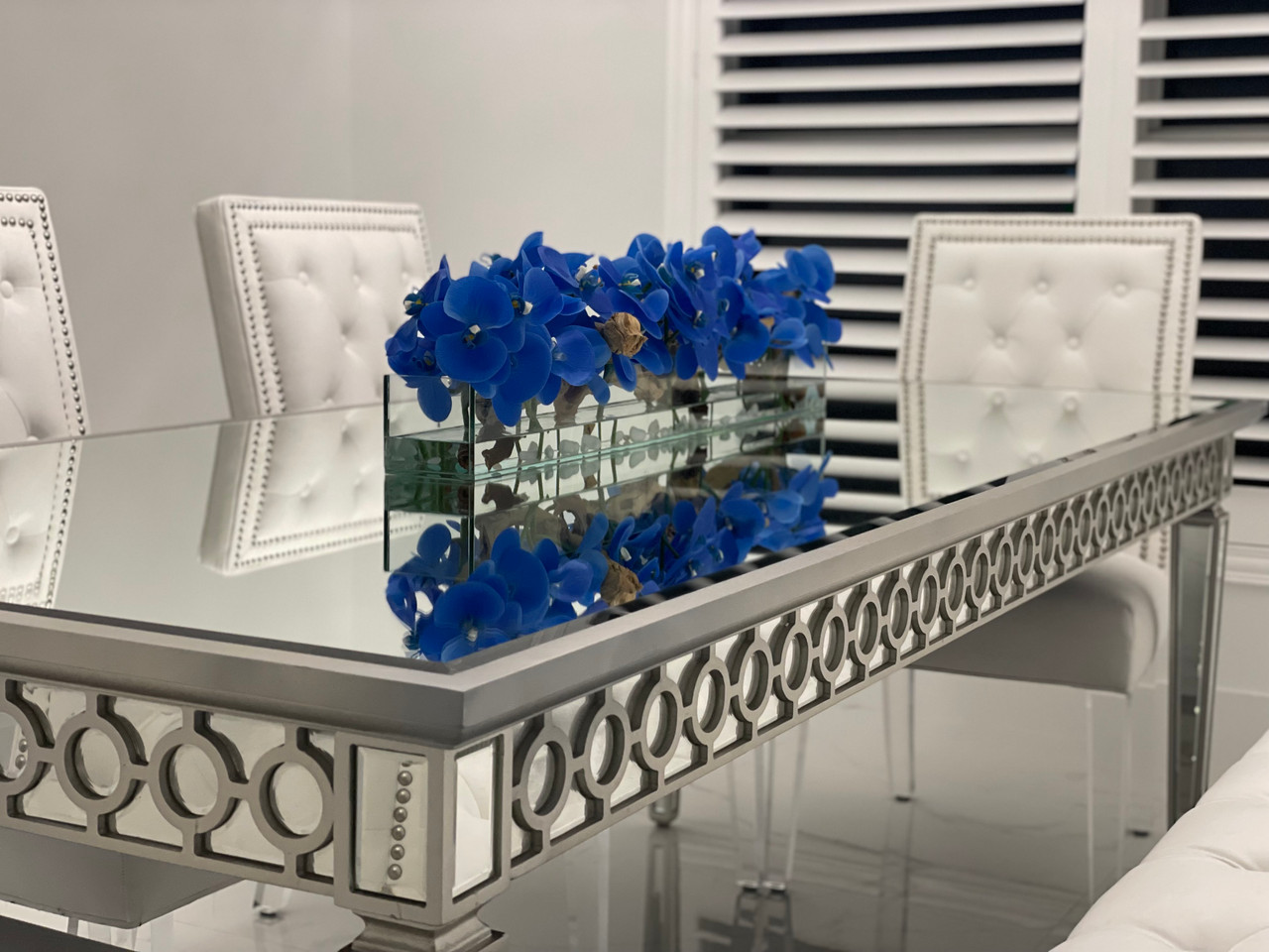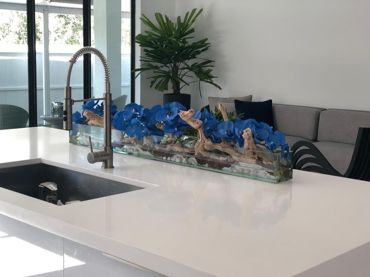 48″ Casa Moderna Glass Plate planter with blue Phalaenopsis orchids, sandblasted grape wood, white stones and our illusion water. The stunning sight of a Phalaenopsis orchids in full bloom is nothing less than breathtaking. Their huge, curving petals; double rows of gorgeous blooms march along our casa moderna glass plate planter. This translucent modern glass planter features 90 degree angles and a modern linear design. The sight of a massed display of Phalaenopsis orchids is so arresting that we have paired it with natural sandblasted grape wood to achieve a beautiful and organic contrast.