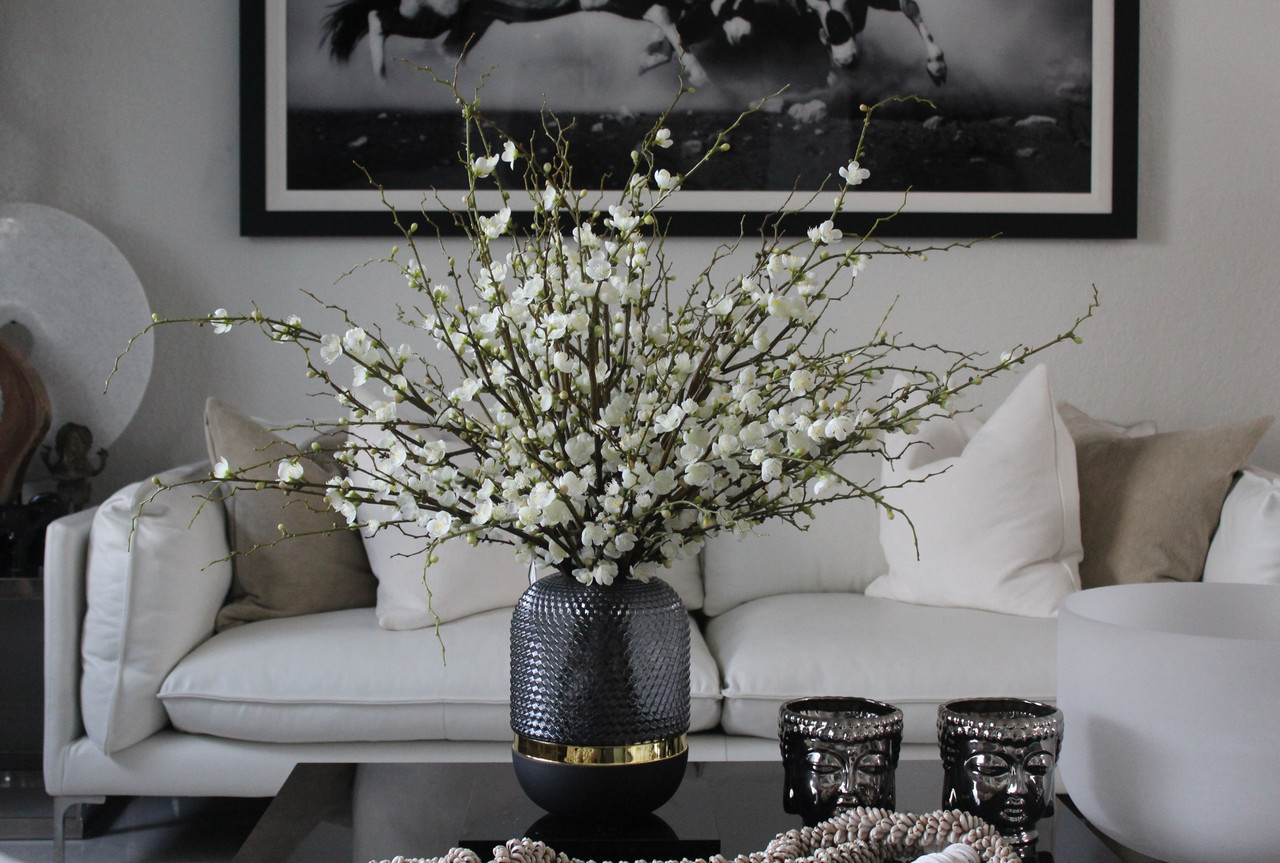 This large-scale cherry blossom flower arrangement makes a stunning dining table centerpiece; it also looks fabulous in an entryway or on a sofa or console table.