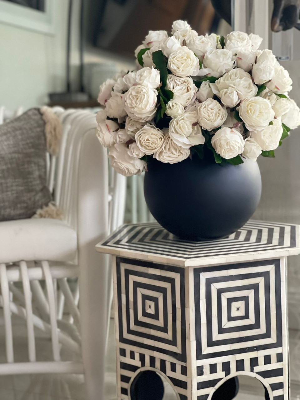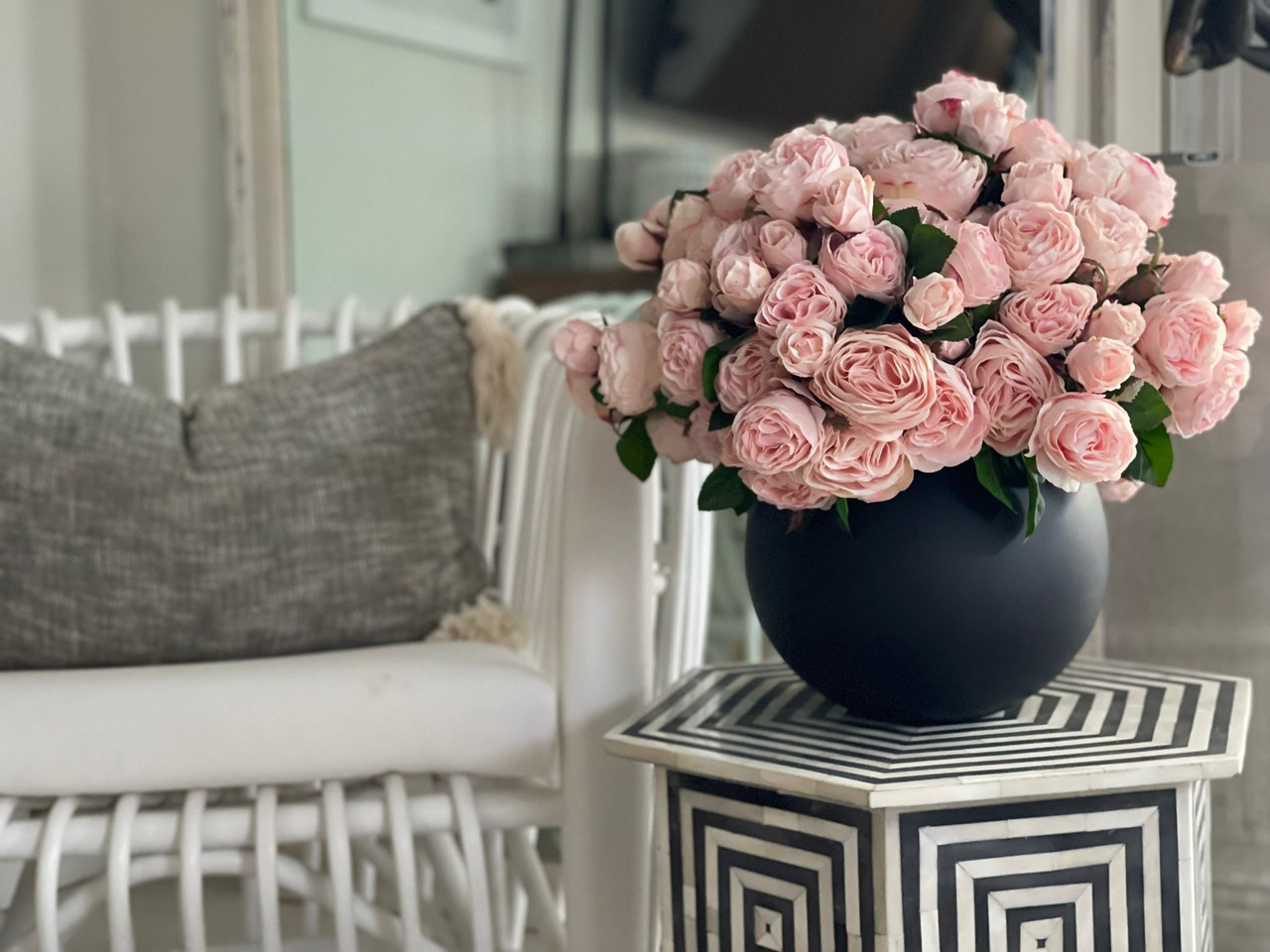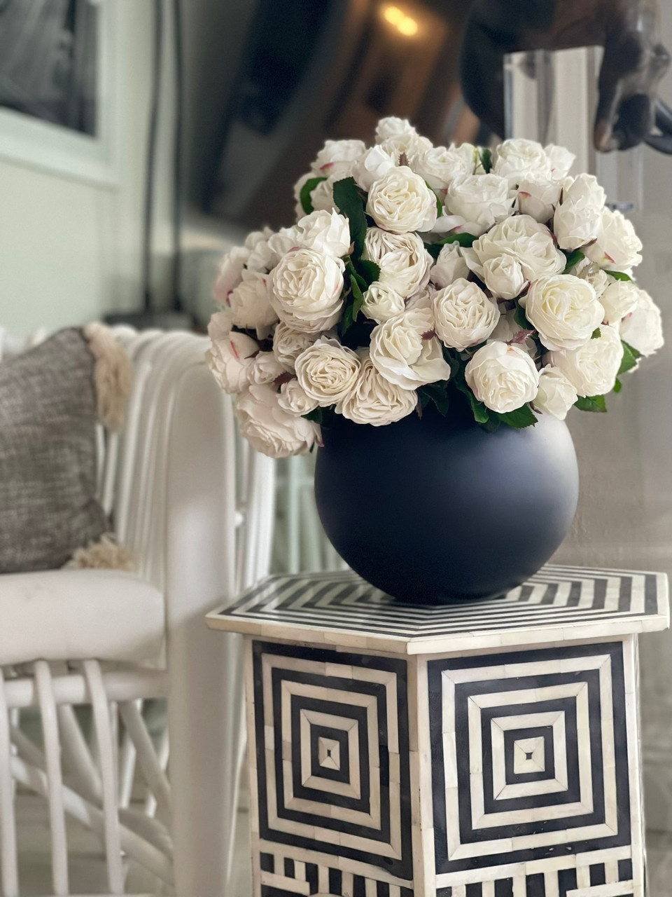 A bunch of blooming roses makes a stunning display. Blunt-cut stems are arranged in a matte black fishbowl vase for a classic touch of natural beauty. A mainstay of elegant bouquets and summer gardens, the rose is a flower with a rich history. It was first cultivated some 5,000 years ago, most likely in China, and it has come to represent many things. This arrangement captures the beauty and spirit of the world’s most universally loved flower; it features the real touch roses in different stages of bloom, known as a symbol of purity and innocence. This arrangement makes a stunning tabletop accent
