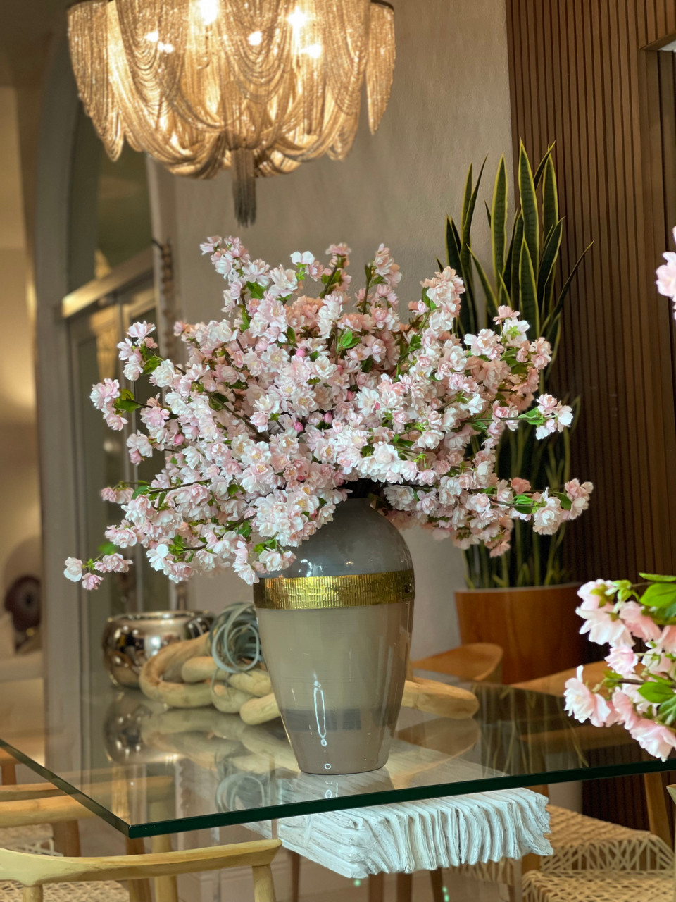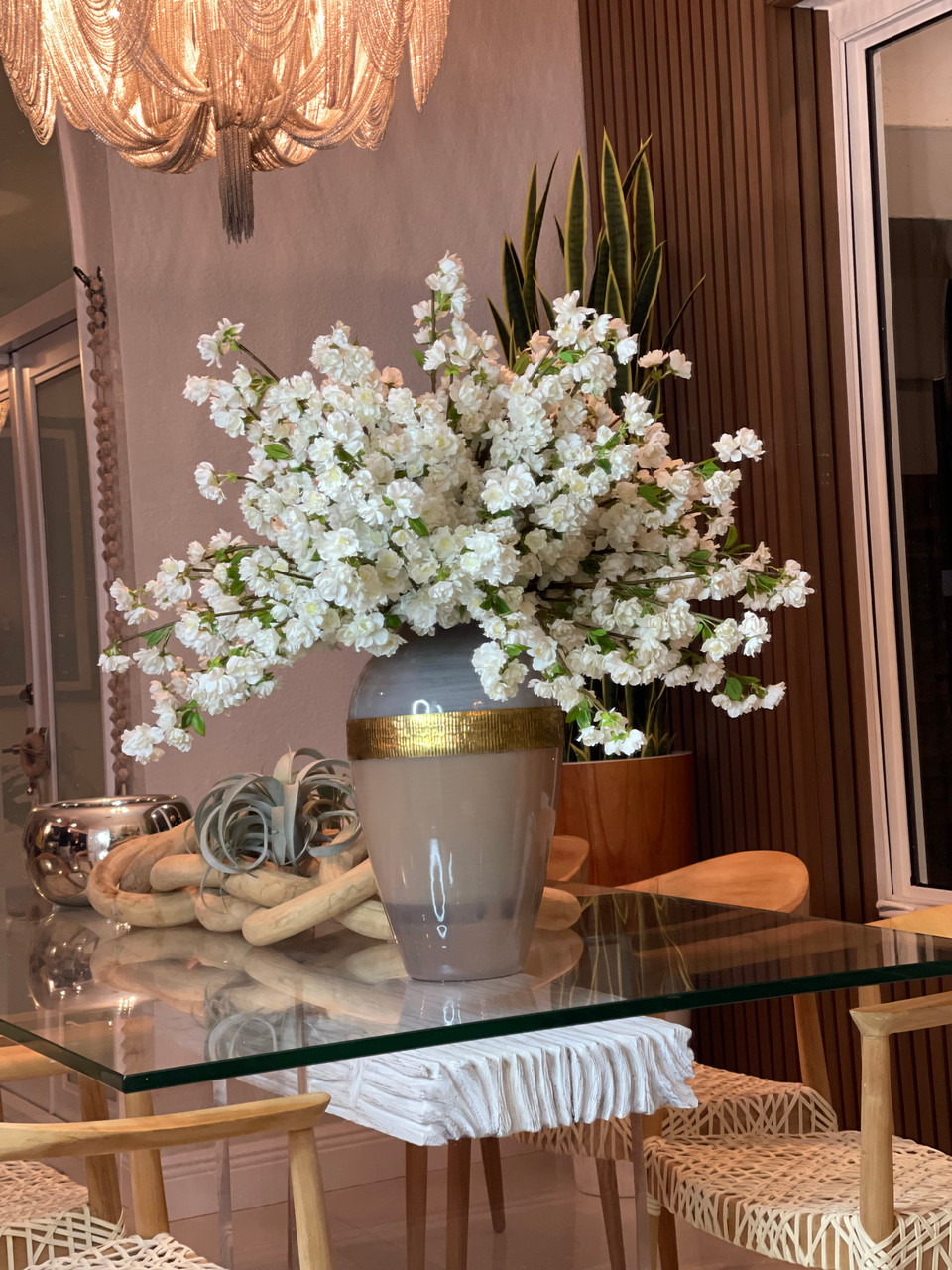 This bouquet of elegant white cherry a adds a fresh and stylish touch to any room. The branches are presented in a our goddess glass vase, anchored in illusion water and are the perfect decorative accent for a large coffee table or dining room console.