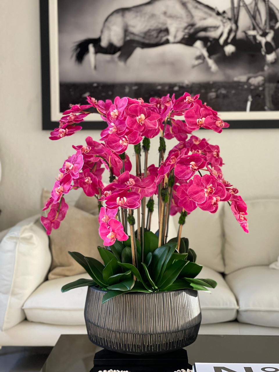 Graceful and exotic, our enduring, pink phalaenopsis arrangement captures the artistry and spirit of natural orchids. It’s prized for its profusion of perfect blooms. Vertical bamboo stakes, broad green leaves, paired with our Black Jeva bowl, add to the realism of this arrangement. This arrangement is just the right size and is versatile enough to use as a coffee table centerpiece, a dining room or console table. It has a luscious tropical feel that will add vibrancy and elegance to any room.