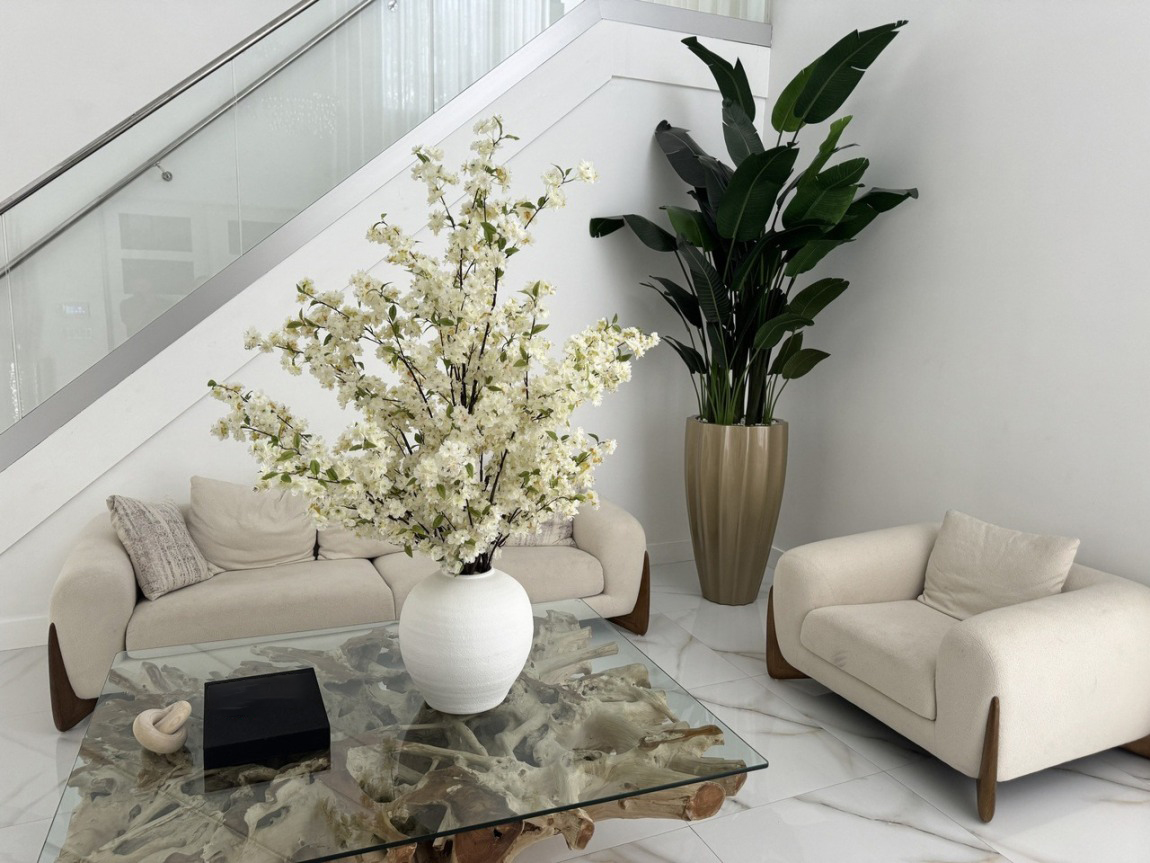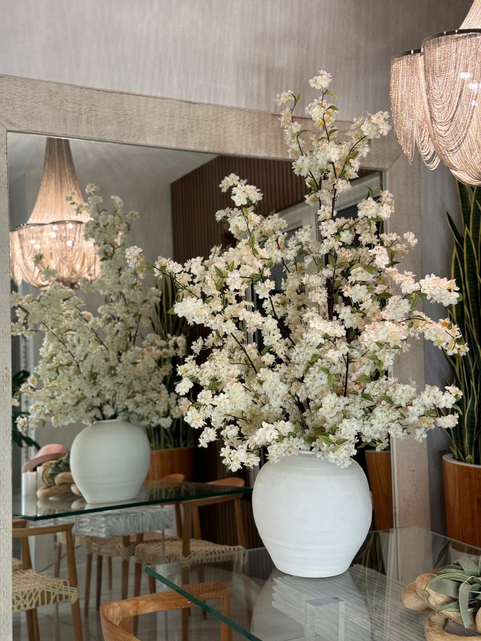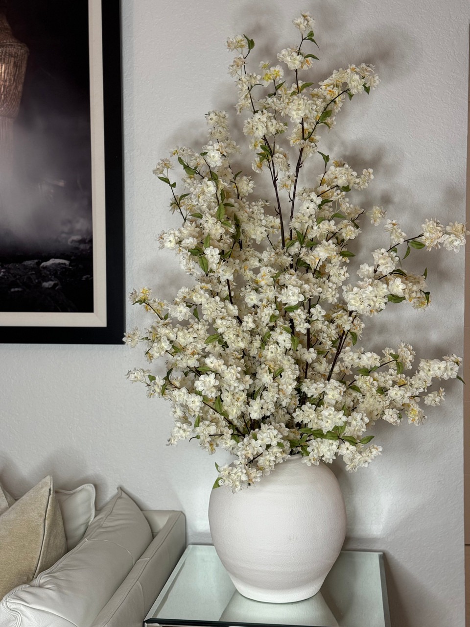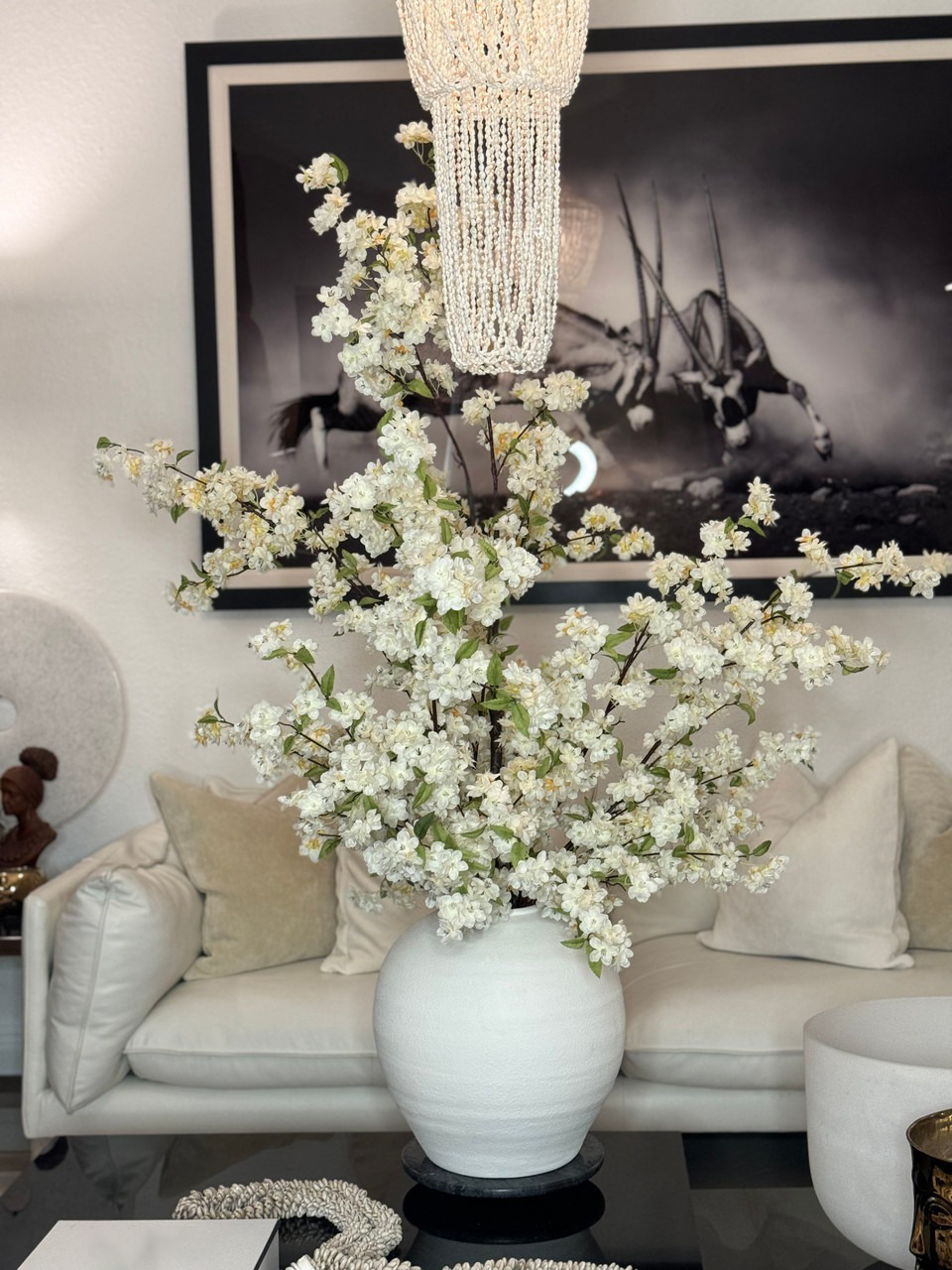 Cherry blossoms are a symbolic flower of the spring, a time of renewal, and the fleeting nature of life. Anchored in the Konos Vase which is a round bellied cement vase in bright textural white. Its size and shape provide a perfect canvas for a our large white cherry blossom stems. This bouquet of elegant white cherry a adds a fresh and stylish touch to any room.