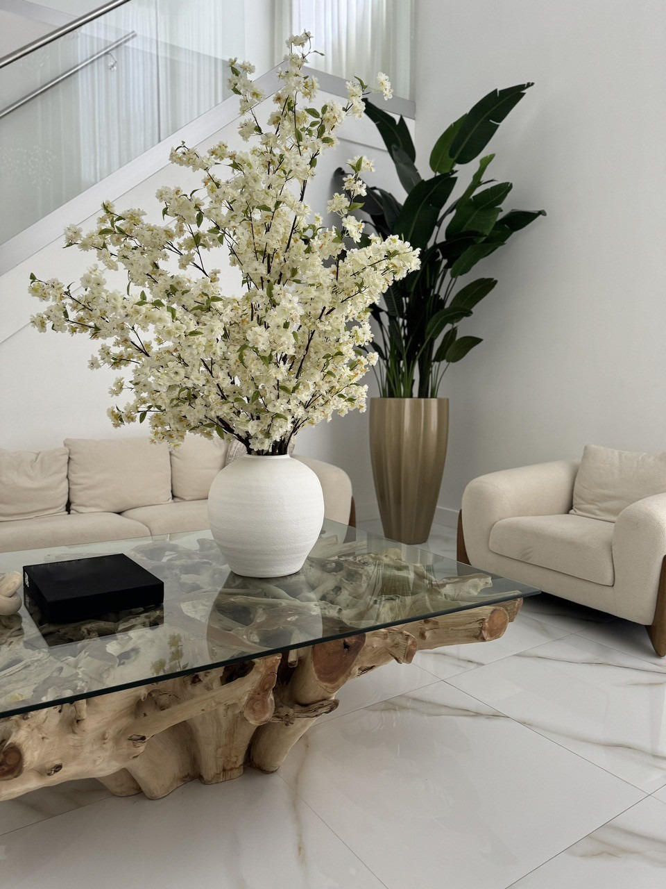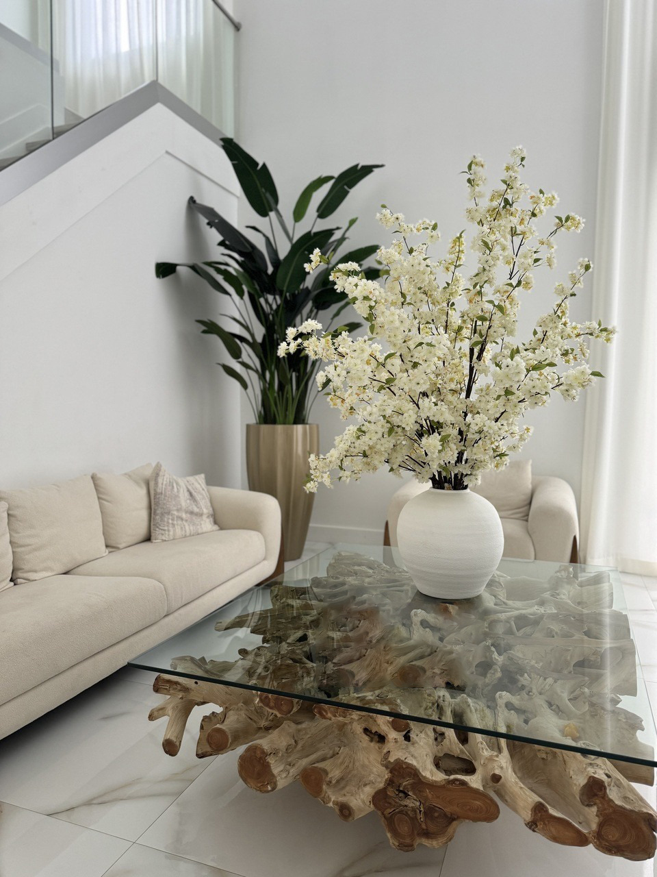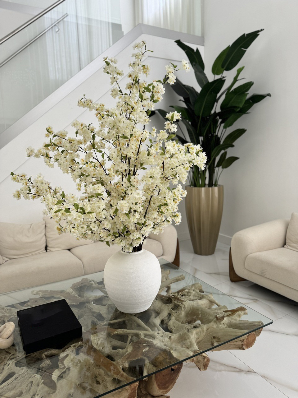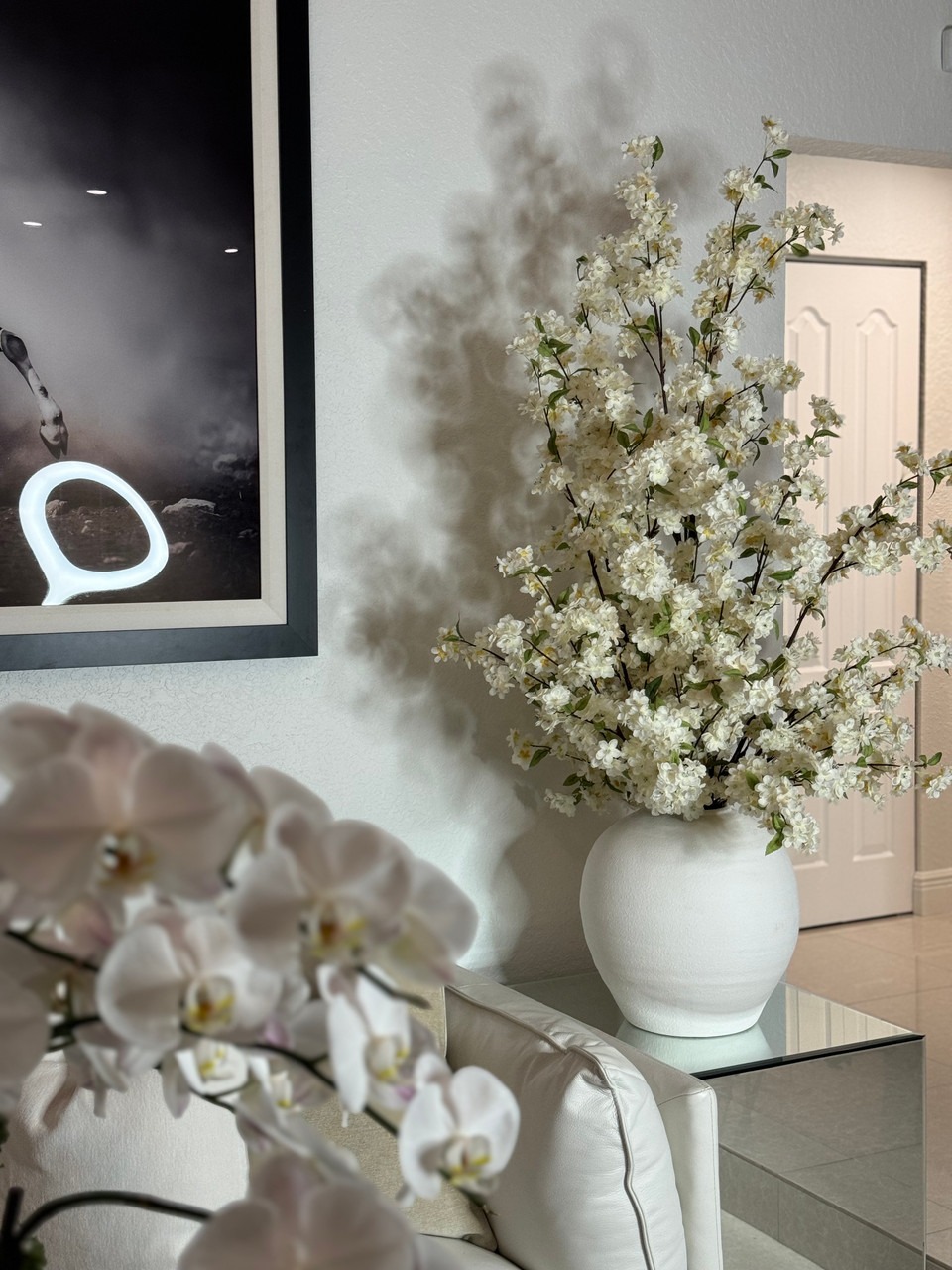Cherry blossoms are a symbolic flower of the spring, a time of renewal, and the fleeting nature of life. Anchored in the Konos Vase which is a round bellied cement vase in bright textural white. Its size and shape provide a perfect canvas for a our large white cherry blossom stems. This bouquet of elegant white cherry a adds a fresh and stylish touch to any room.