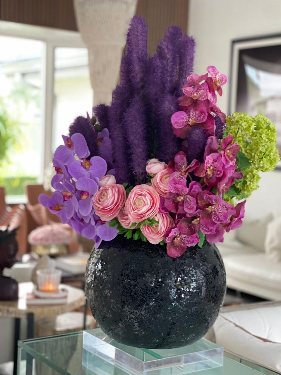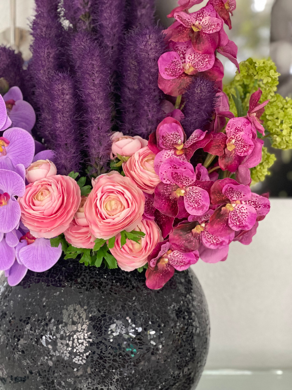 A bountiful and beautiful bouquet of “real touch” flowers take center stage on our black mosaic vase. This stunning round vase is made of hundreds of carefully placed black mosaic glass pieces . This show stopping selection of flowers include purple liatris mixed with fucsia mokara orchids, phaleanopsis orchids and vanda orchids accented with pink ranunculus and green snowball hydrangeas. This tropical bouquet of everlasting exotic flowers will brighten up any room. If you are looking for a statement piece for a coffee table, look no further. This gorgeous centerpiece is the perfect addition to any foyer or entrance table.