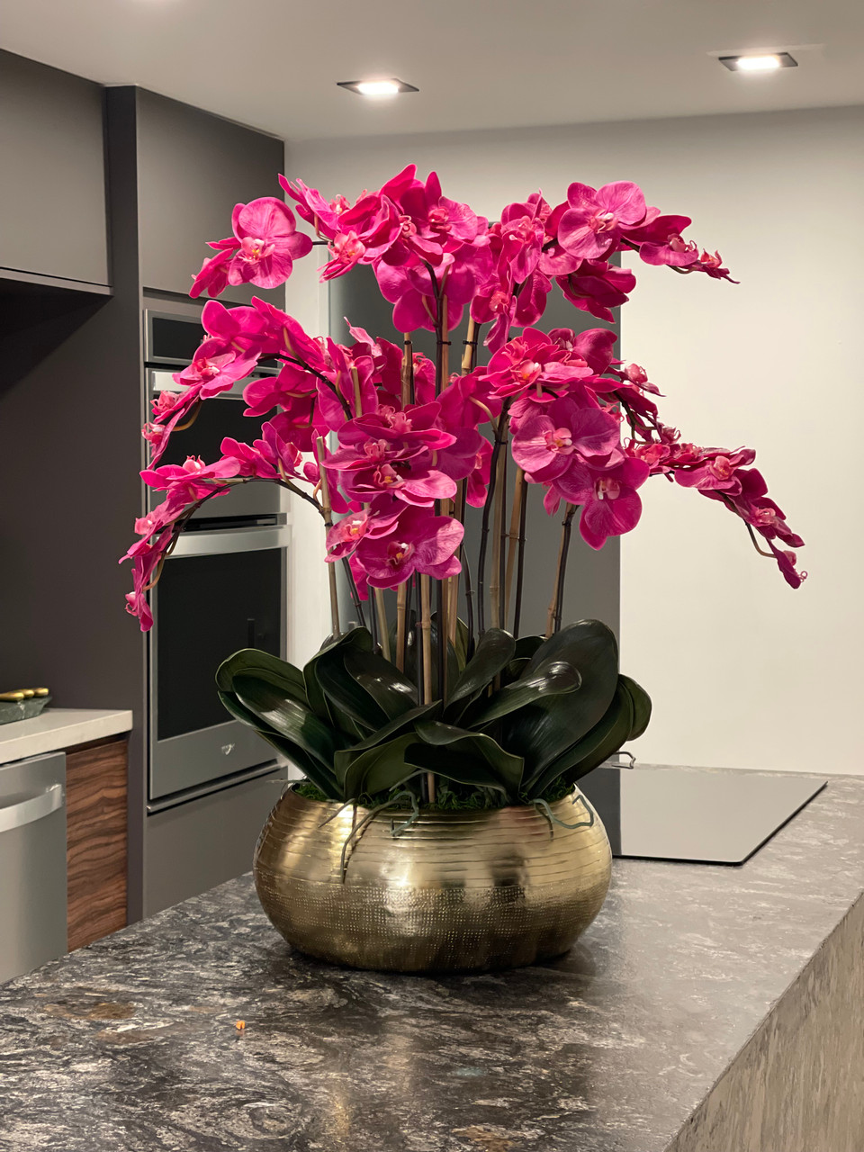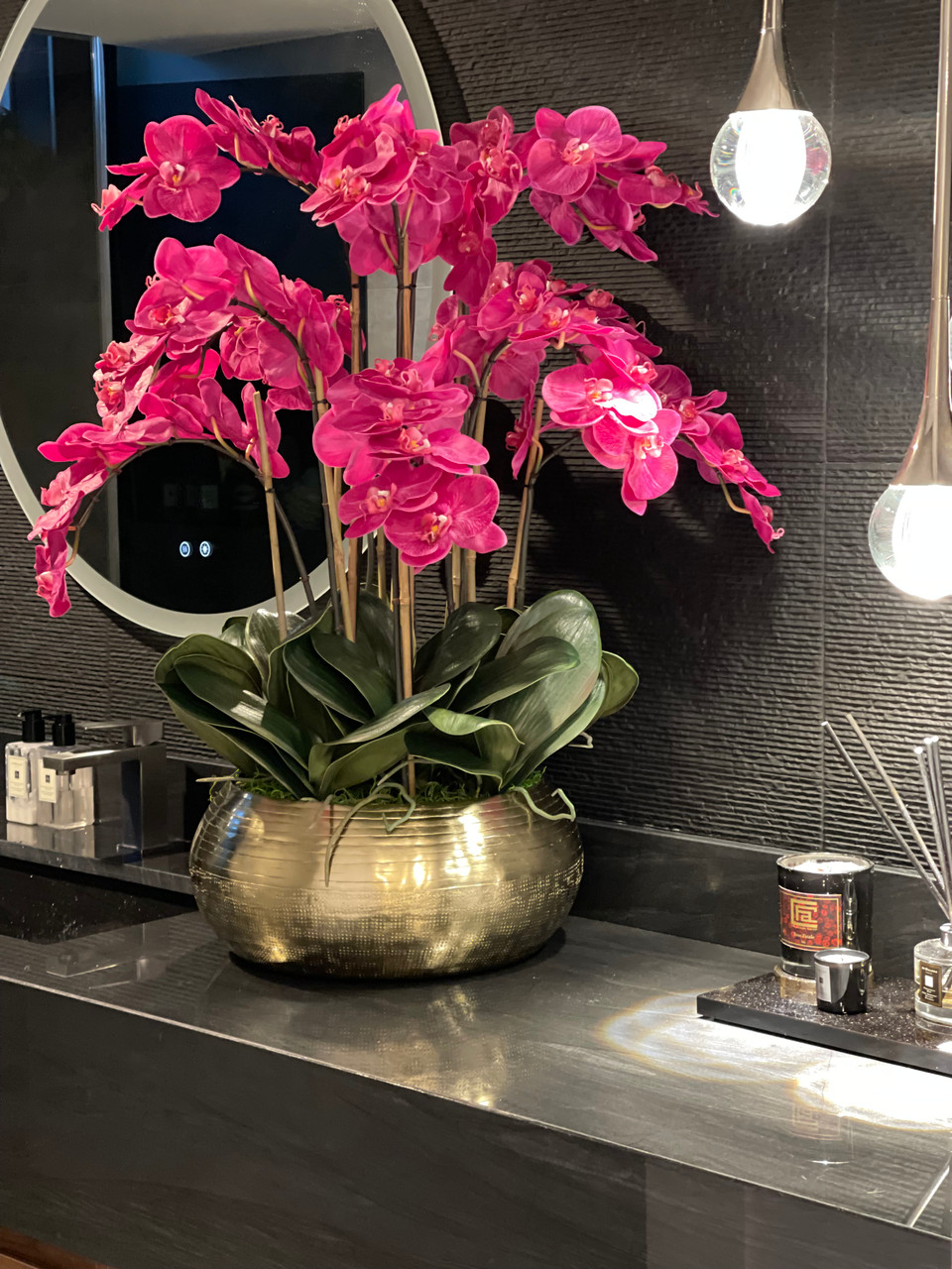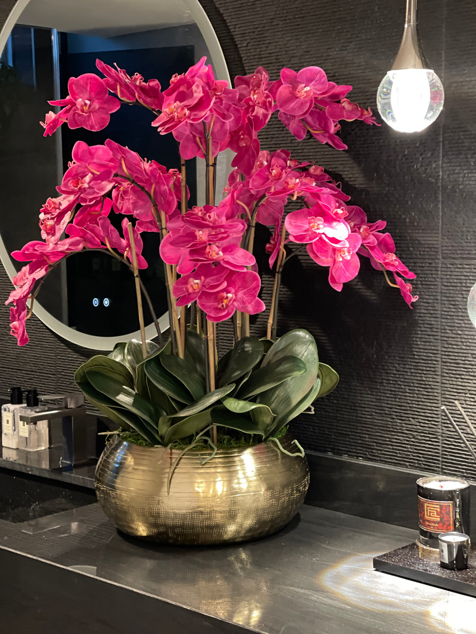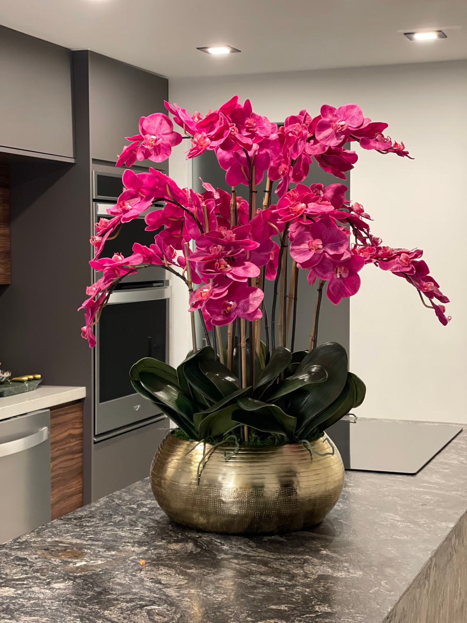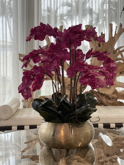 Graceful and exotic, the orchid has symbolized integrity, nobility, and luxury for centuries. Our enduring, bright pink phalaenopsis arrangement captures the artistry and spirit of natural orchids. It’s prized for its profusion of perfect blooms. Vertical bamboo stakes, broad green leaves, and a genuine moss base add to the realism of this arrangement. Set in our metal bowie bowl, a rounded silhouette and textured pattern finish, that is cast from aluminum, then polished and electro-plated for a gold finish, it makes an elegant tabletop accent. Display a pair for extra-lush sophistication.