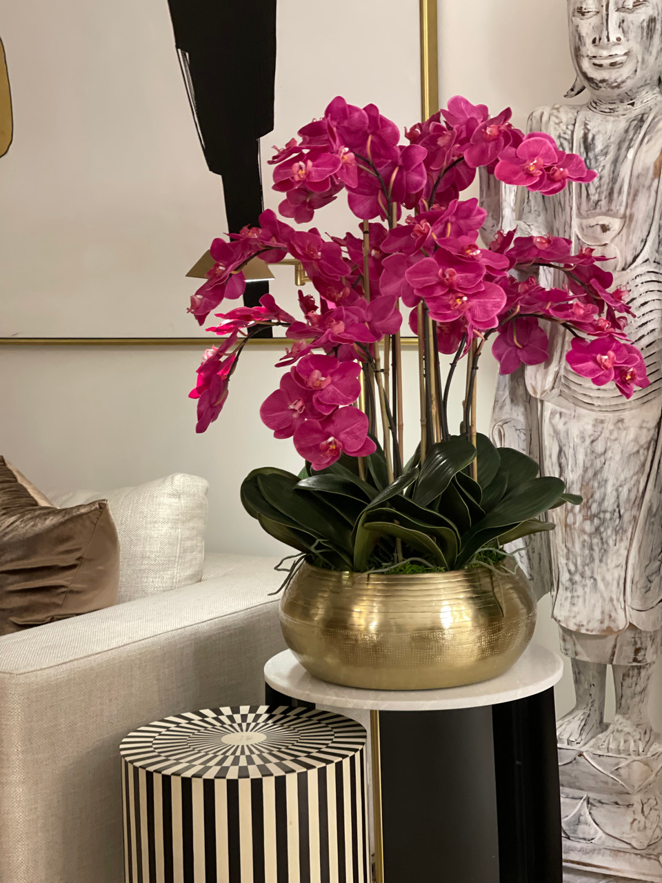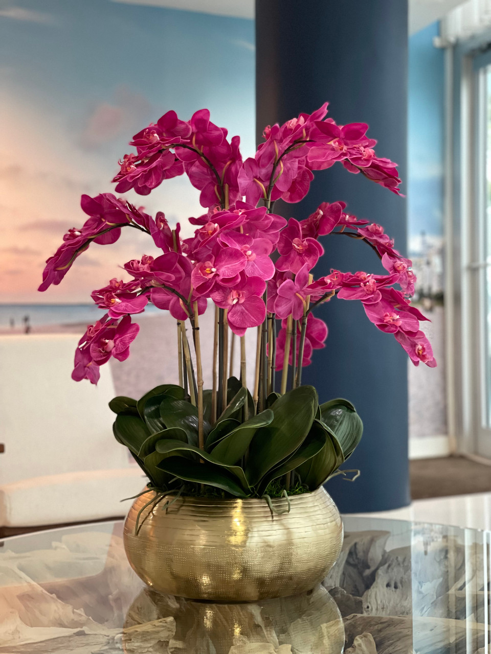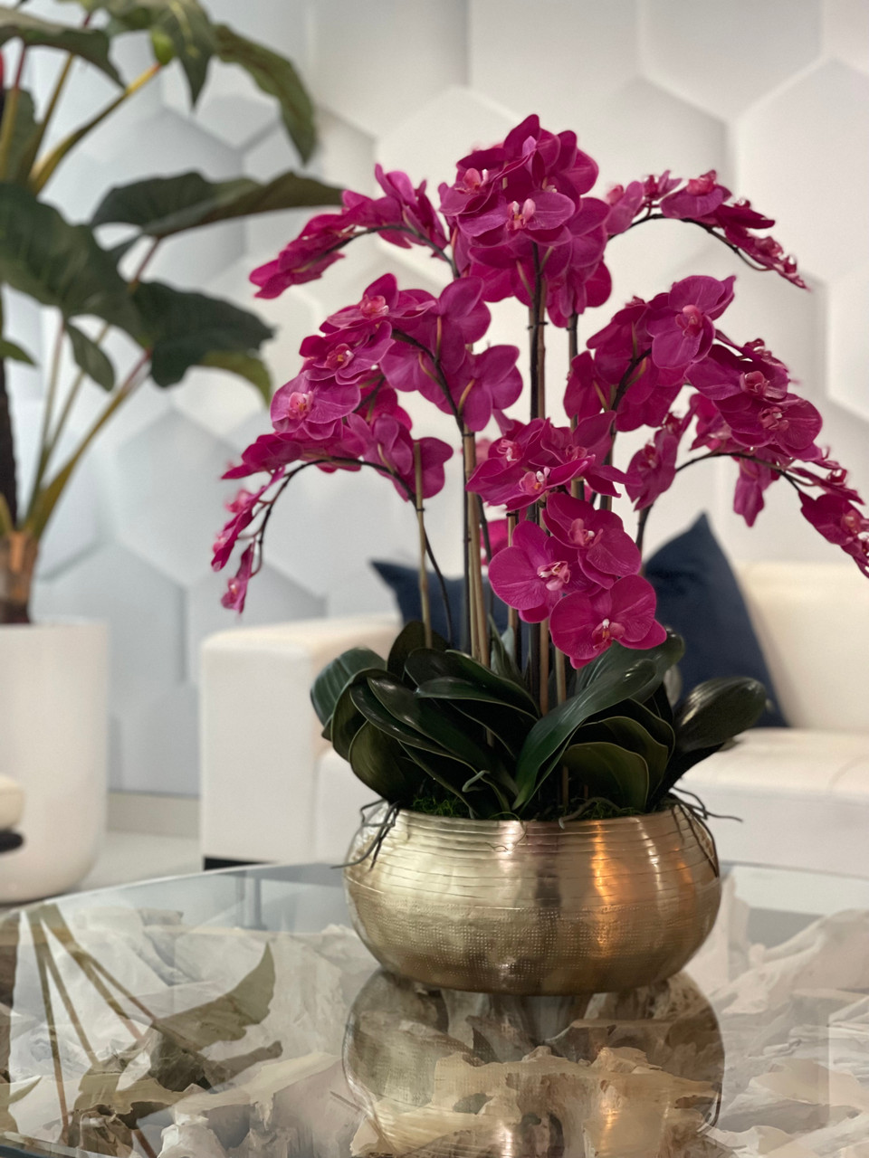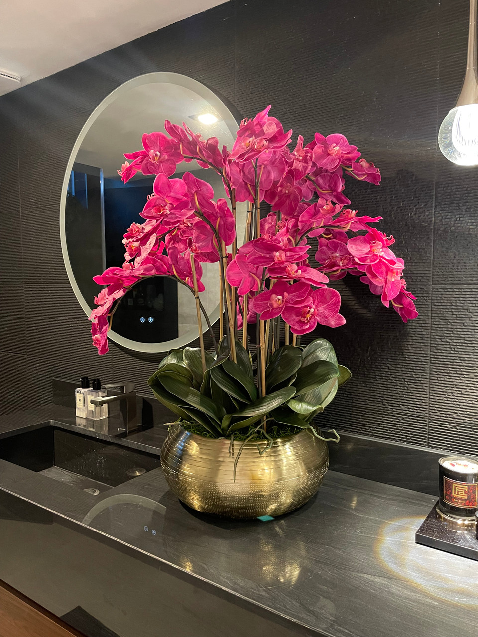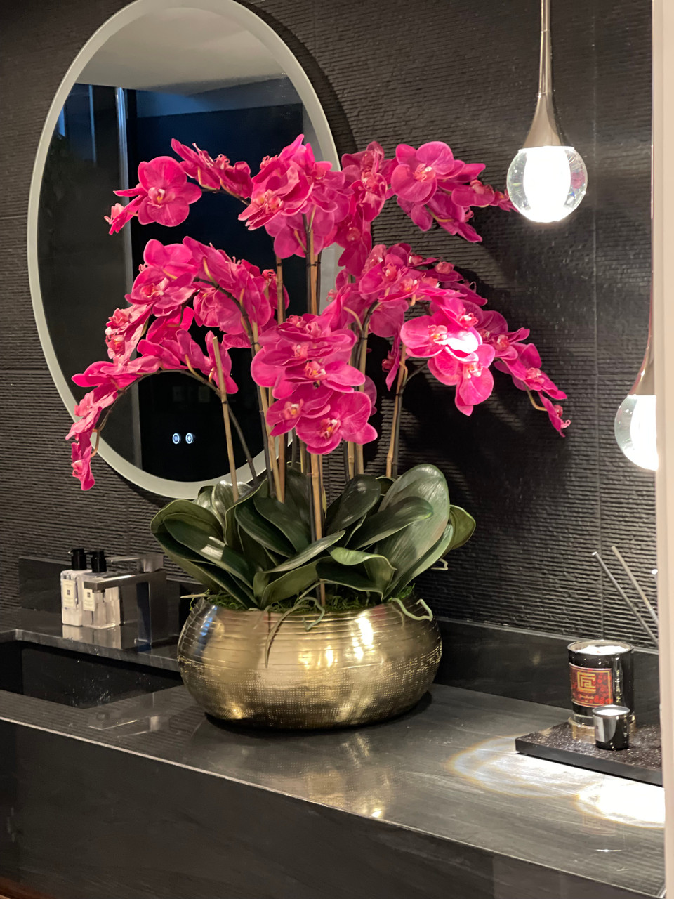Graceful and exotic, the orchid has symbolized integrity, nobility, and luxury for centuries. Our enduring, bright pink phalaenopsis arrangement captures the artistry and spirit of natural orchids. It’s prized for its profusion of perfect blooms. Vertical bamboo stakes, broad green leaves, and a genuine moss base add to the realism of this arrangement. Set in our metal bowie bowl, a rounded silhouette and textured pattern finish, that is cast from aluminum, then polished and electro-plated for a gold finish, it makes an elegant tabletop accent. Display a pair for extra-lush sophistication.