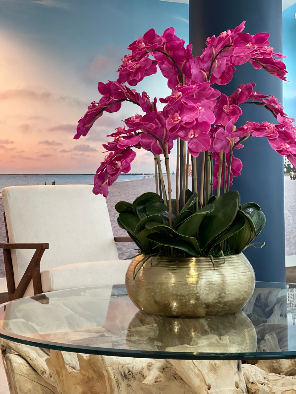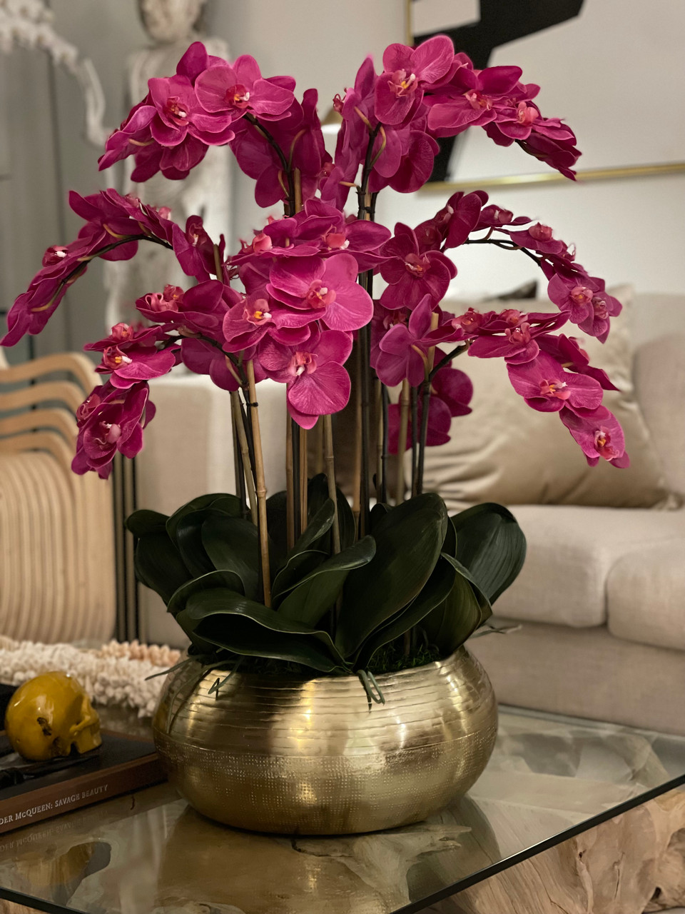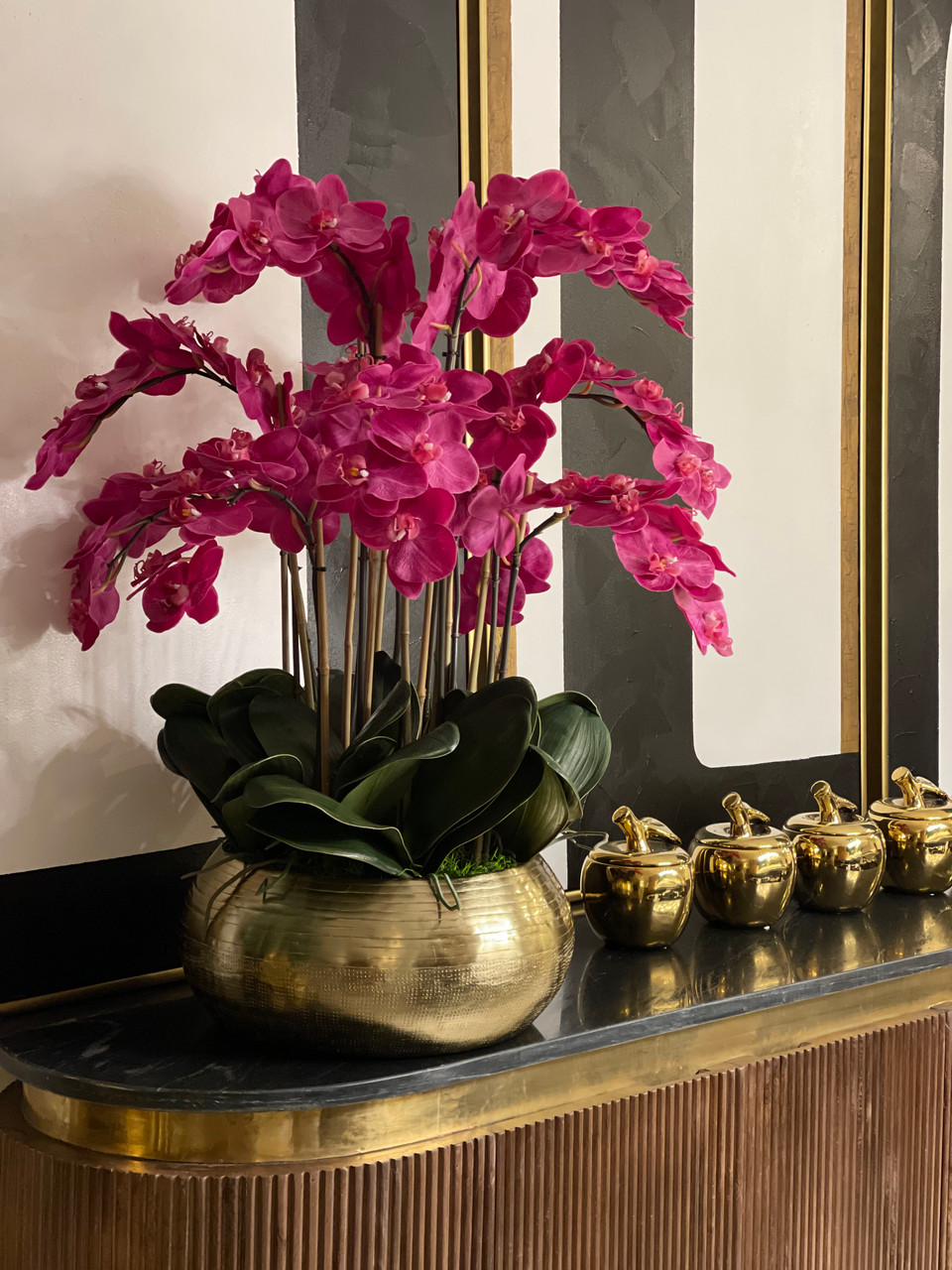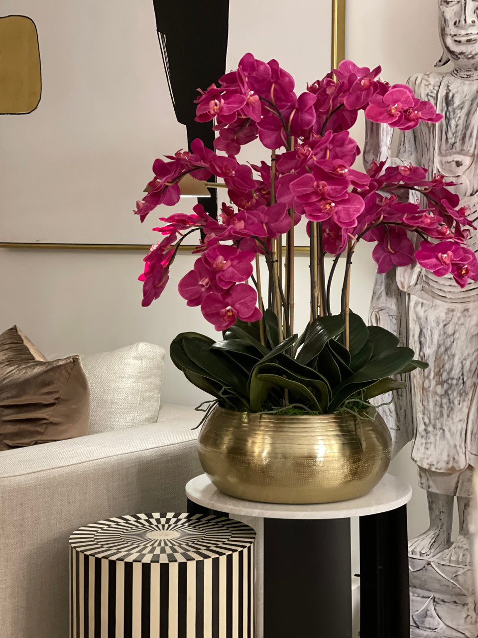 Graceful and exotic, the orchid has symbolized integrity, nobility, and luxury for centuries. Our enduring, bright pink phalaenopsis arrangement captures the artistry and spirit of natural orchids. It’s prized for its profusion of perfect blooms. Vertical bamboo stakes, broad green leaves, and a genuine moss base add to the realism of this arrangement. Set in our metal bowie bowl, a rounded silhouette and textured pattern finish, that is cast from aluminum, then polished and electro-plated for a gold finish, it makes an elegant tabletop accent. Display a pair for extra-lush sophistication.
