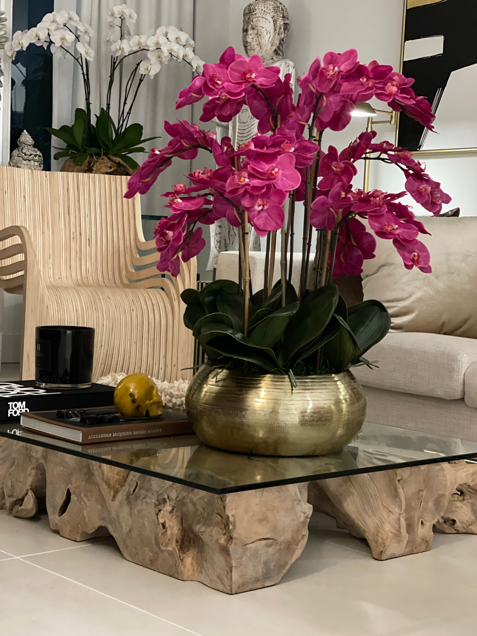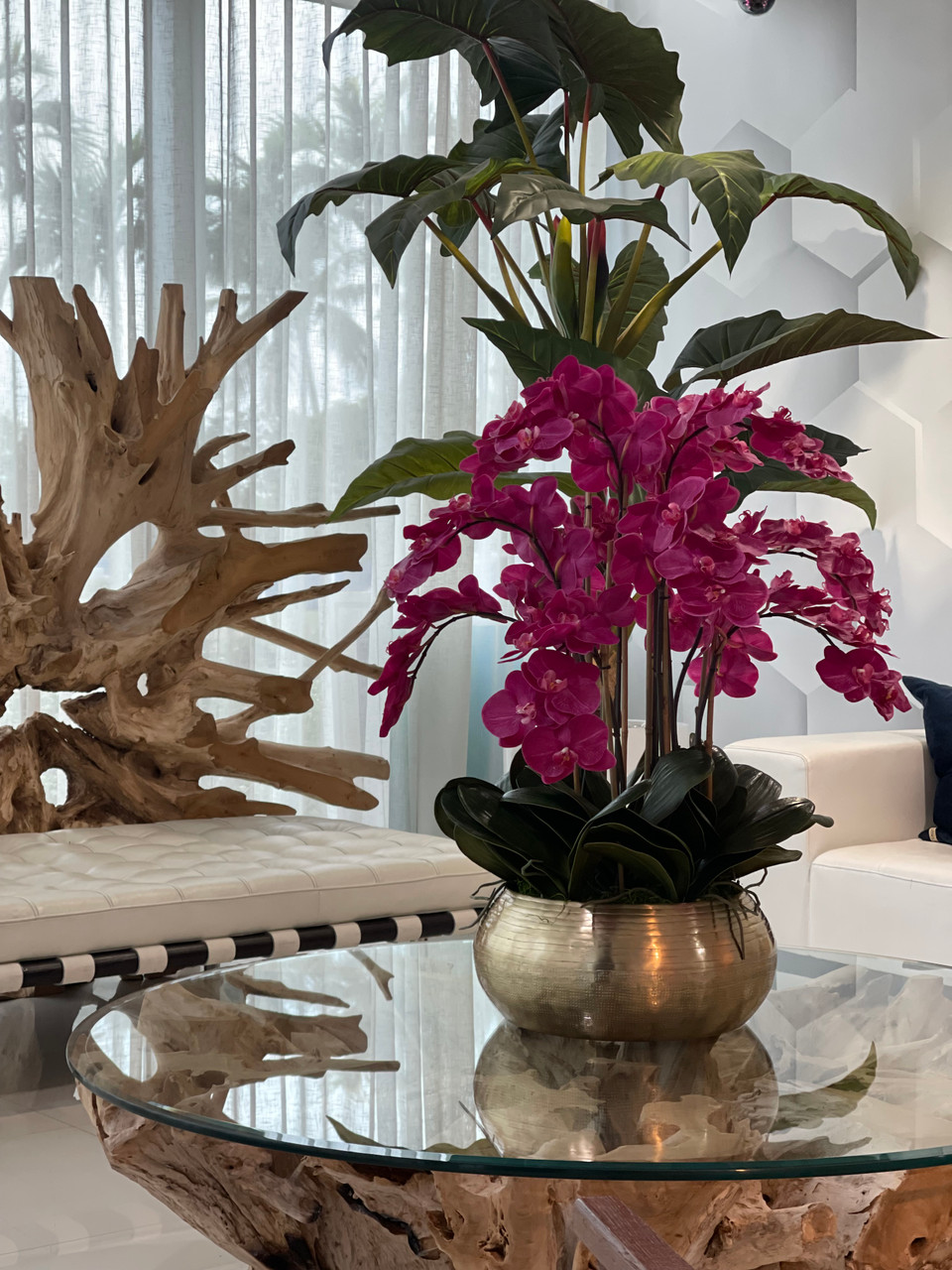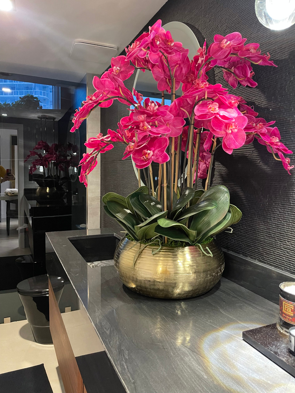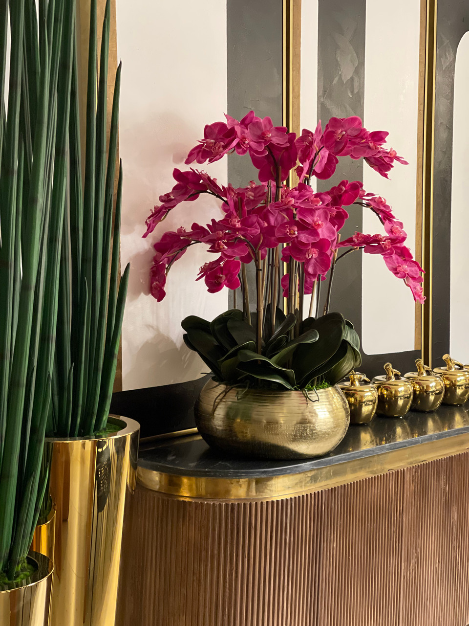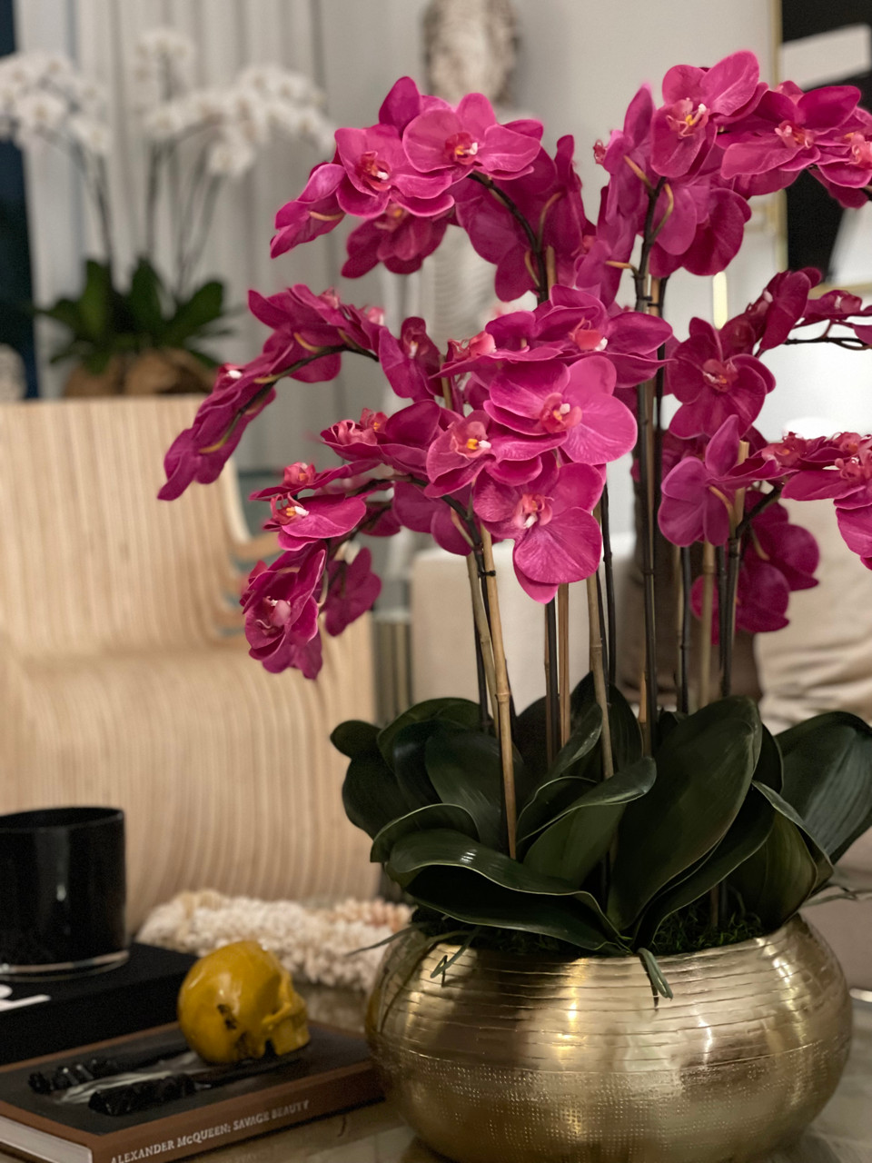 Graceful and exotic, the orchid has symbolized integrity, nobility, and luxury for centuries. Our enduring, bright pink phalaenopsis arrangement captures the artistry and spirit of natural orchids. It’s prized for its profusion of perfect blooms. Vertical bamboo stakes, broad green leaves, and a genuine moss base add to the realism of this arrangement. Set in our metal bowie bowl, a rounded silhouette and textured pattern finish, that is cast from aluminum, then polished and electro-plated for a gold finish, it makes an elegant tabletop accent. Display a pair for extra-lush sophistication.