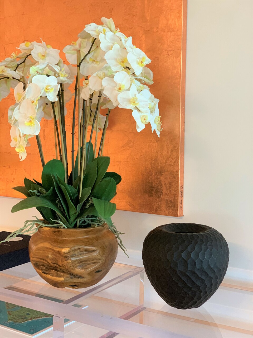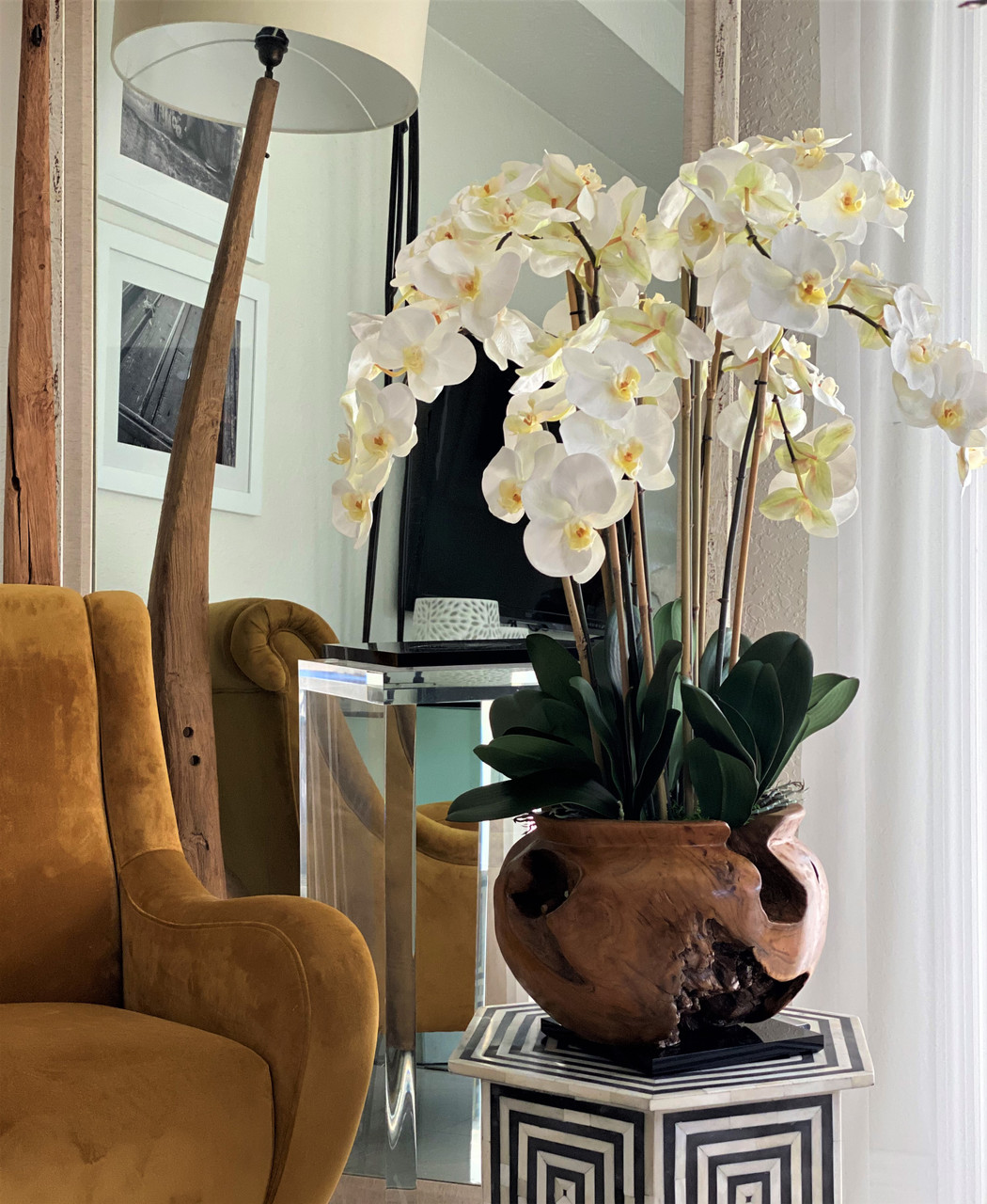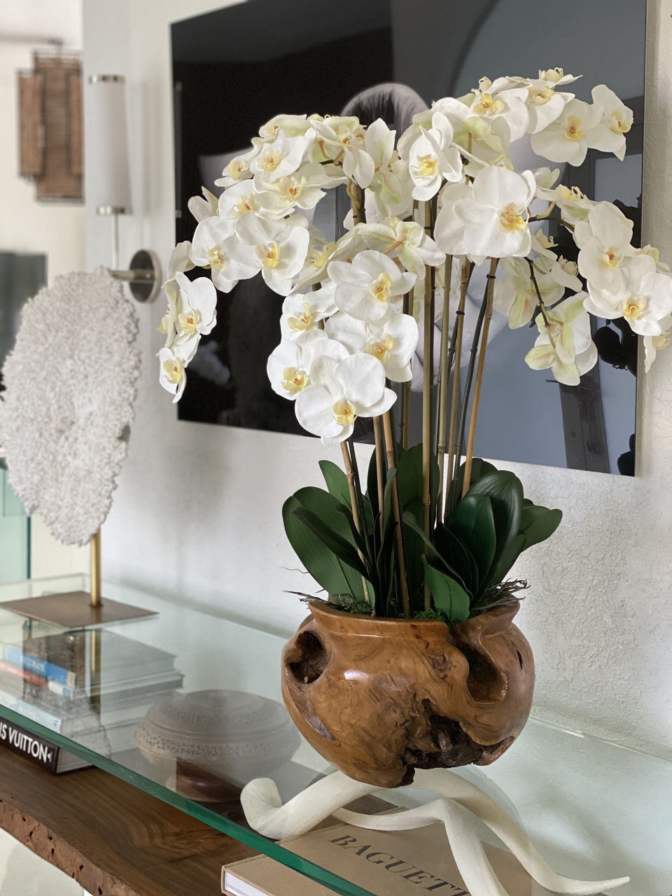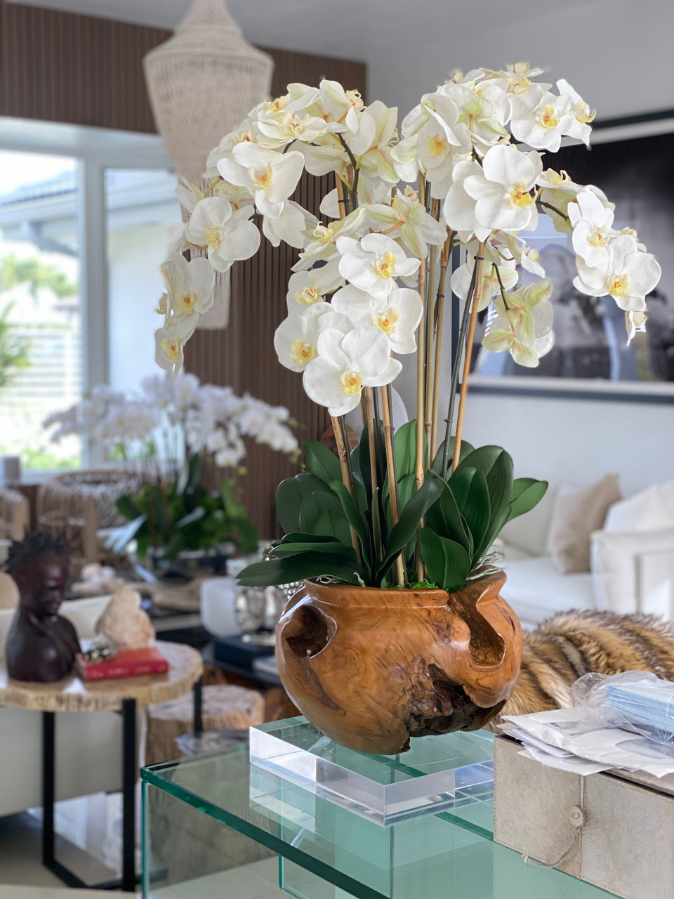 The timeless beauty and elegance of white orchids, paired with a unique one of kind hand made teak bowl from Indonesia. Each bowl has natural imperfections that add to the uniqueness and beauty of the arrangement. Give your space an impressive finishing touch with this Real Touch Phalaenopsis orchid arrangement. Presented in an elegant teak bowl, these natural-looking orchids provide an opportunity to enjoy the presence of fresh orchids all year-round without the hassle of watering.