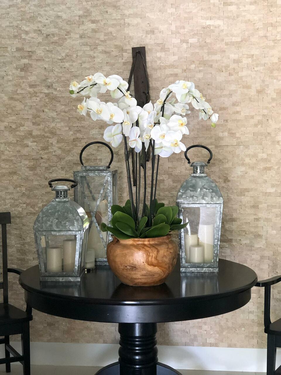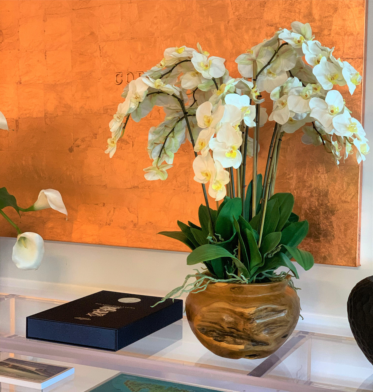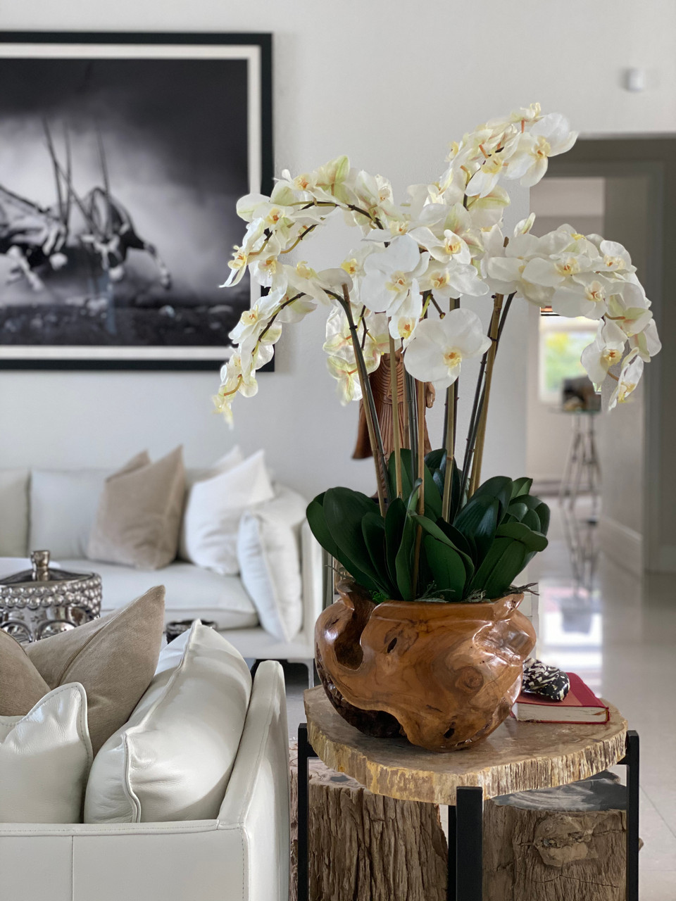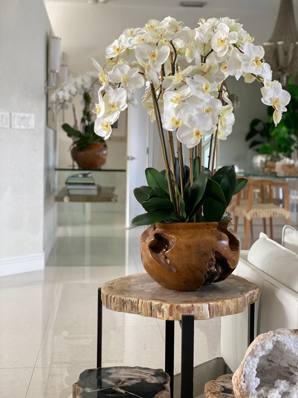 The timeless beauty and elegance of white orchids, paired with a unique one of kind hand made teak bowl from Indonesia. Each bowl has natural imperfections that add to the uniqueness and beauty of the arrangement. Give your space an impressive finishing touch with this Real Touch Phalaenopsis orchid arrangement. Presented in an elegant teak bowl, these natural-looking orchids provide an opportunity to enjoy the presence of fresh orchids all year-round without the hassle of watering.