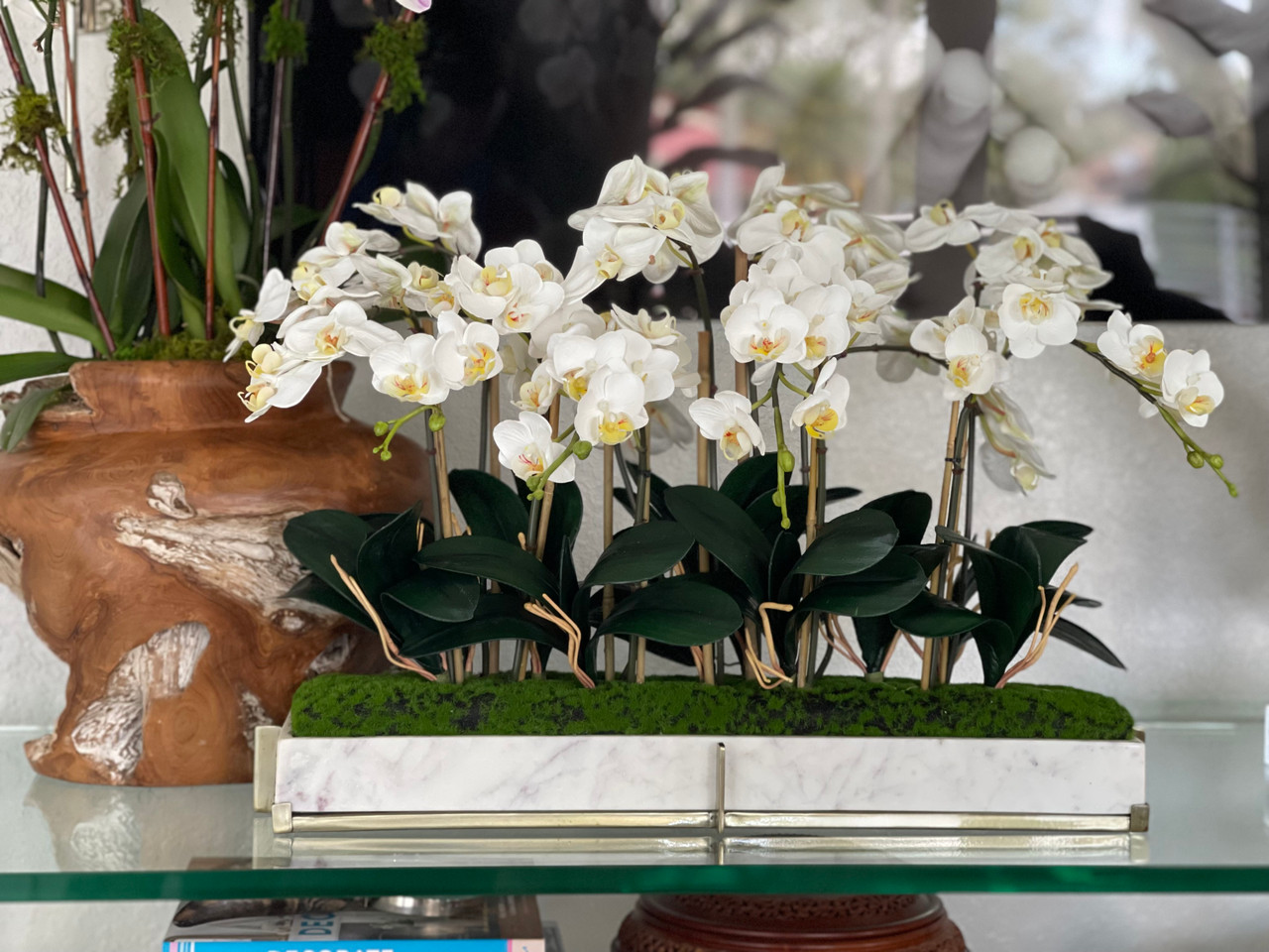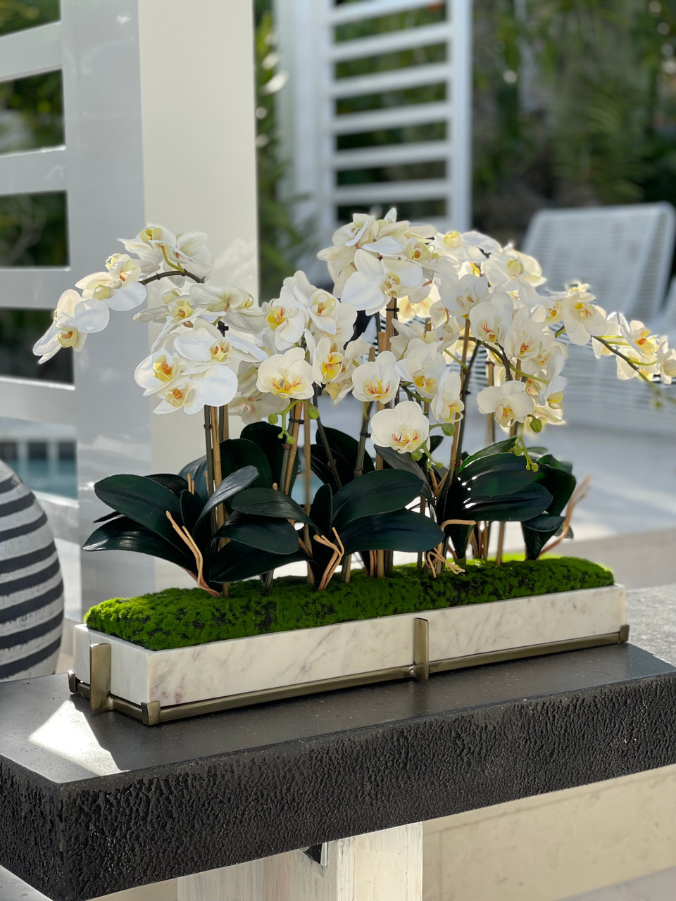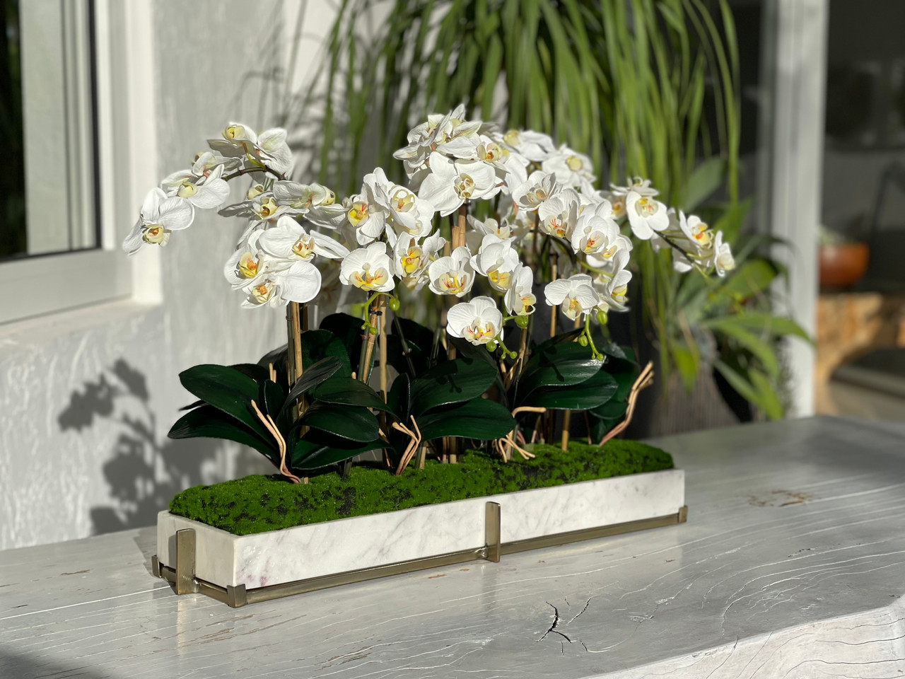 Graceful and exotic, the white orchid has symbolized integrity, nobility, and luxury for centuries. Our enduring, miniature phalaenopsis captures the artistry and spirit of natural orchids. It’s prized for its perfect blooms. The green leaves and a artificial moss base add realism. This striking orchid is set in an elegant, striated white white marble tray with metal legs.
