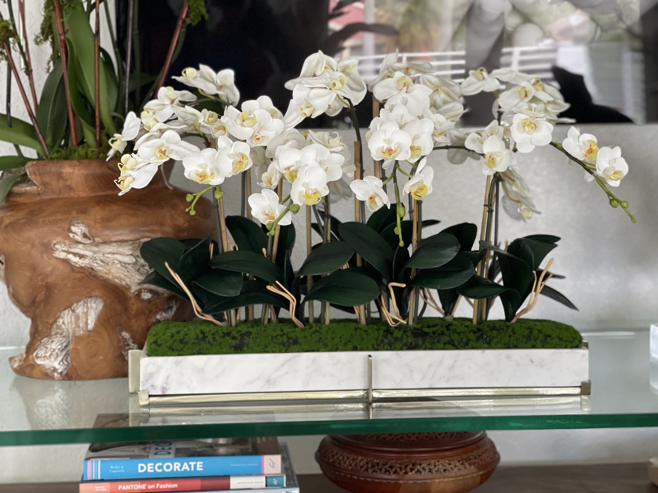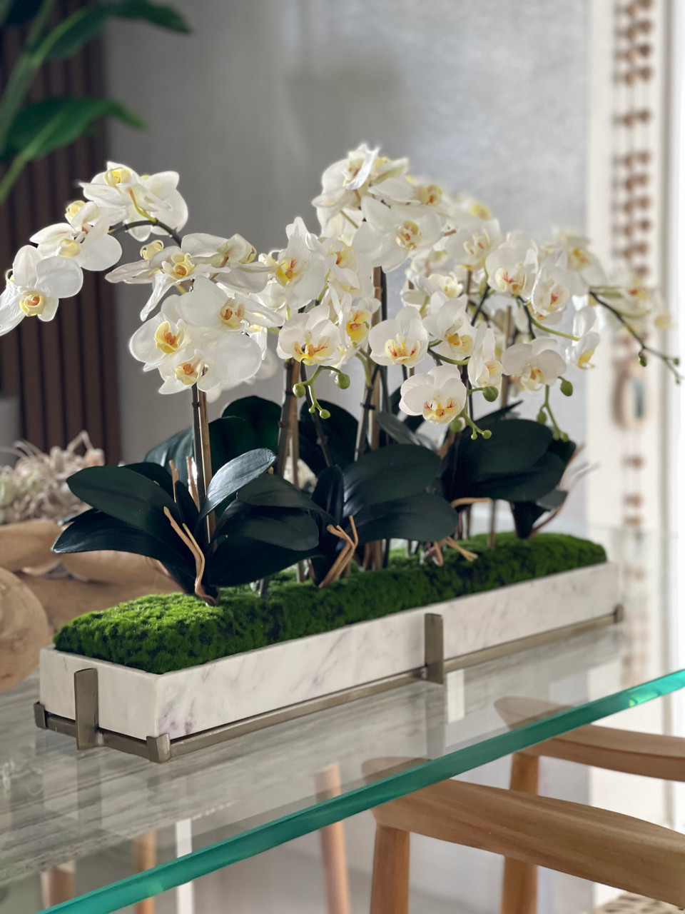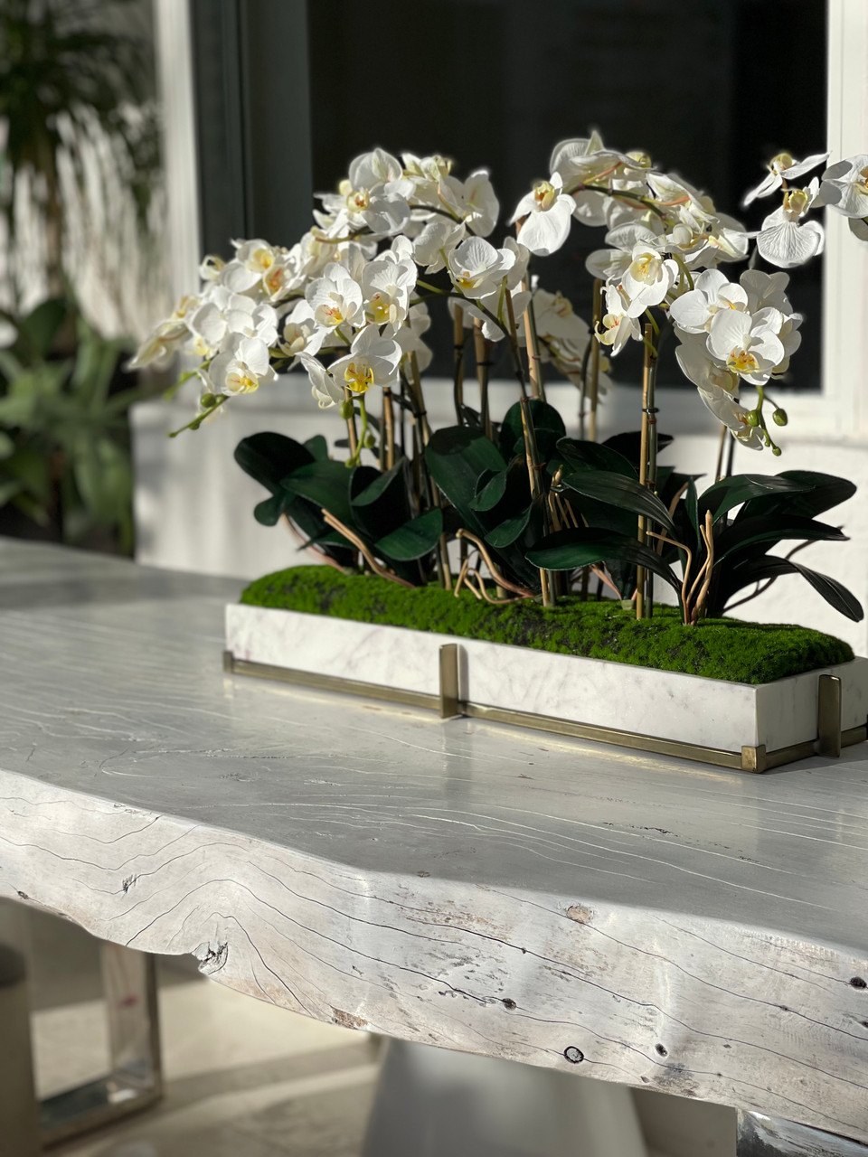 Graceful and exotic, the white orchid has symbolized integrity, nobility, and luxury for centuries. Our enduring, miniature phalaenopsis captures the artistry and spirit of natural orchids. It’s prized for its perfect blooms. The green leaves and a artificial moss base add realism. This striking orchid is set in an elegant, striated white white marble tray with metal legs.