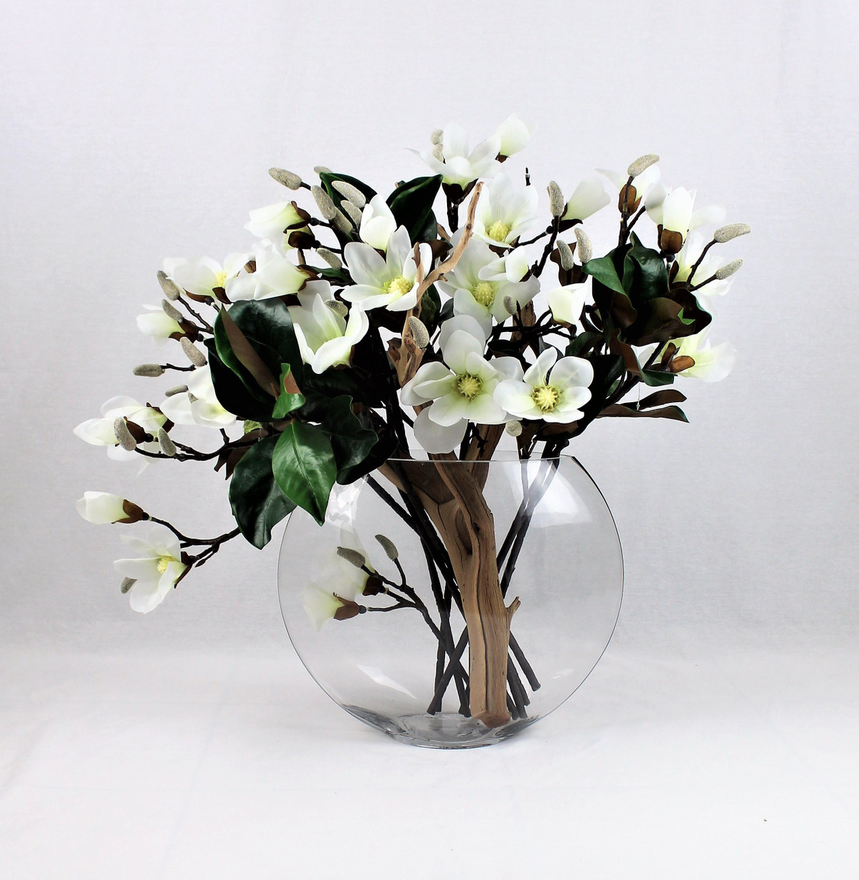 16″ Moon vase with multiple stems of white magnolia blossoms, foliage and sand blasted ghost wood anchored in our illusion water.