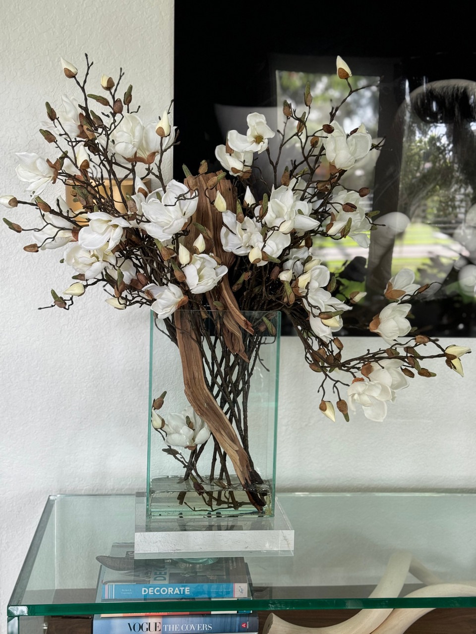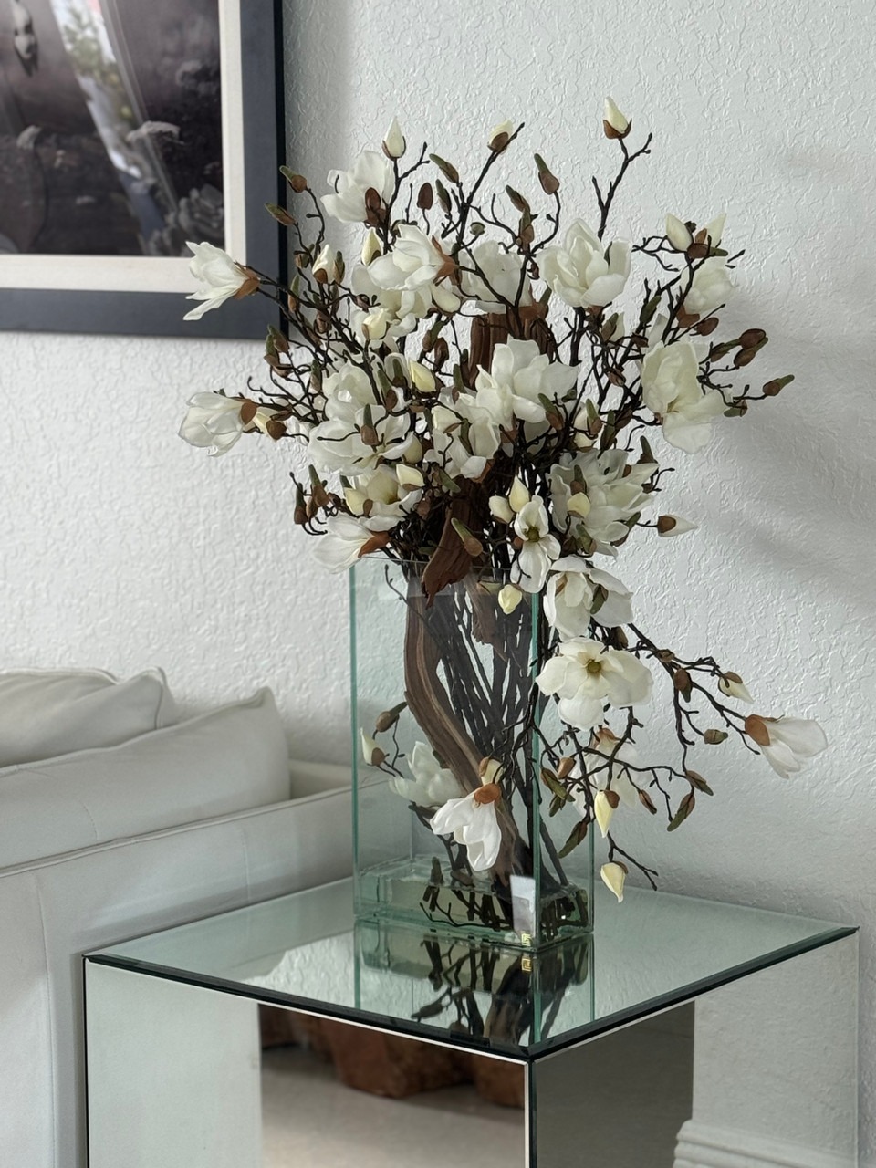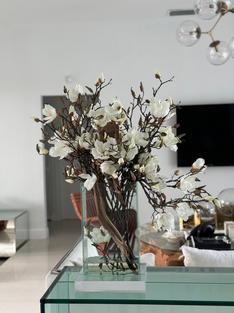 16″ tall Casa Moderna glass planter with multiple stems of white magnolia blossoms, foliage and sand blasted grape wood anchored in our illusion water. Enjoy beautiful, lifelike magnolia tree branches that won’t fade after spring awakens. Displayed here in a stylish clear glass planter, magnolia flowers are cheerful and elegant in any season. Each hand-placed blossom and leaf is crafted with vivid color and exceptional detail, a tribute to Mother Nature’s artistry. Showcase this lovely faux tree on your dining table or living room tabletop.