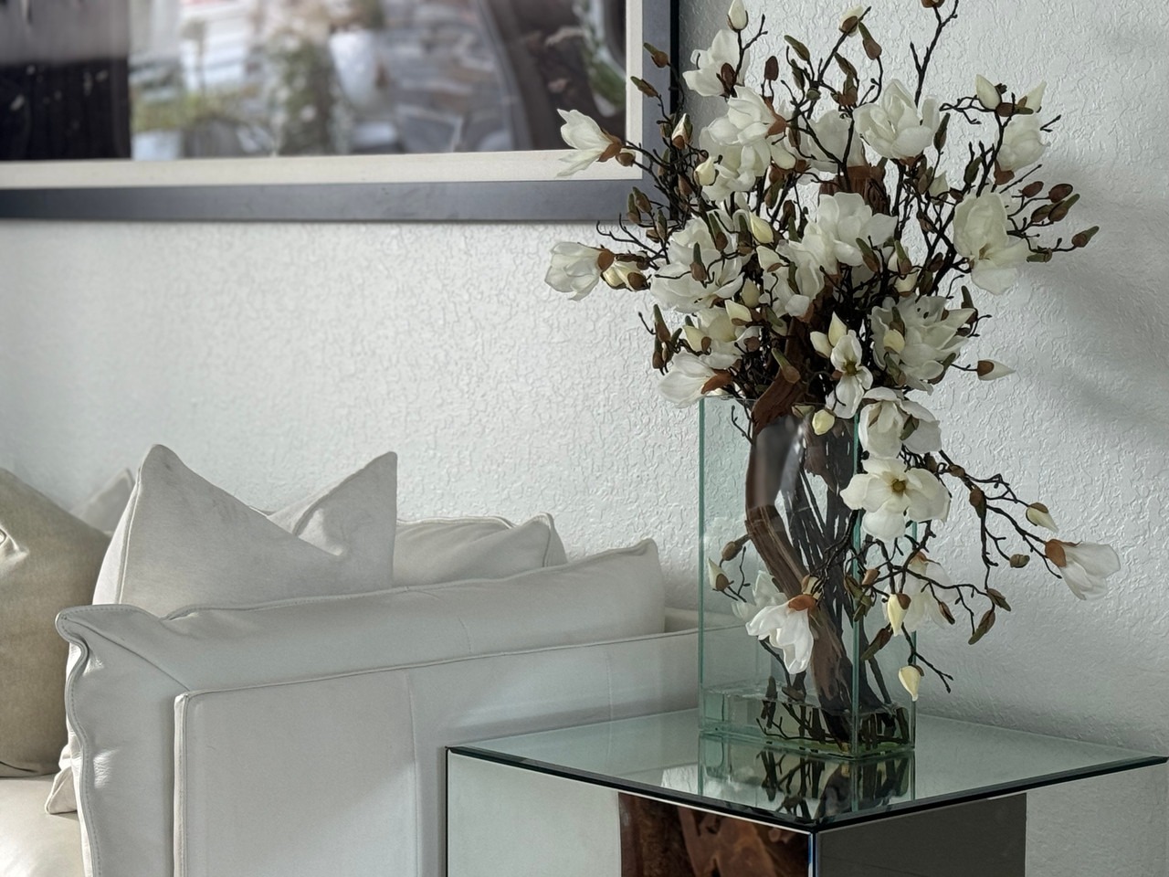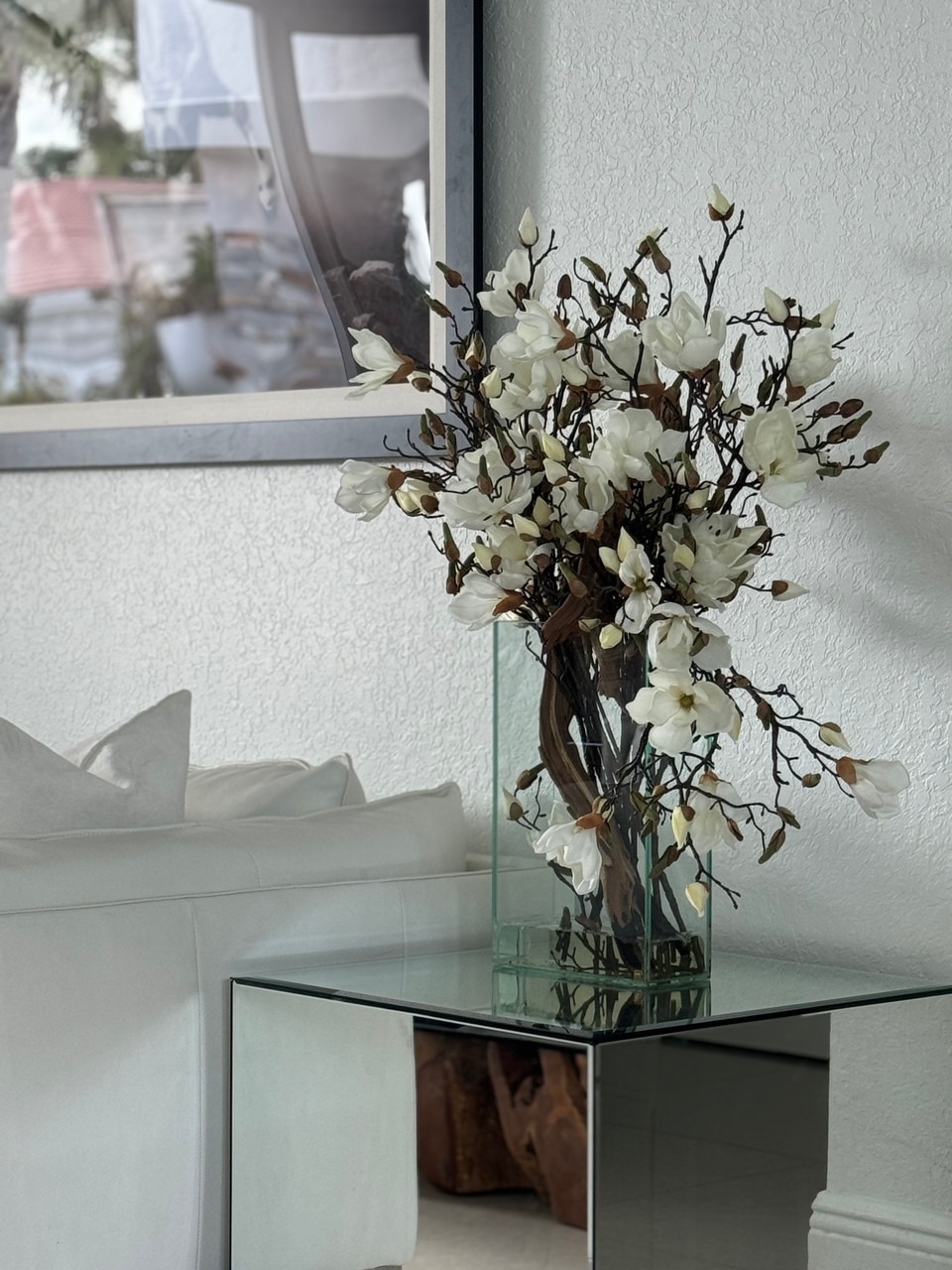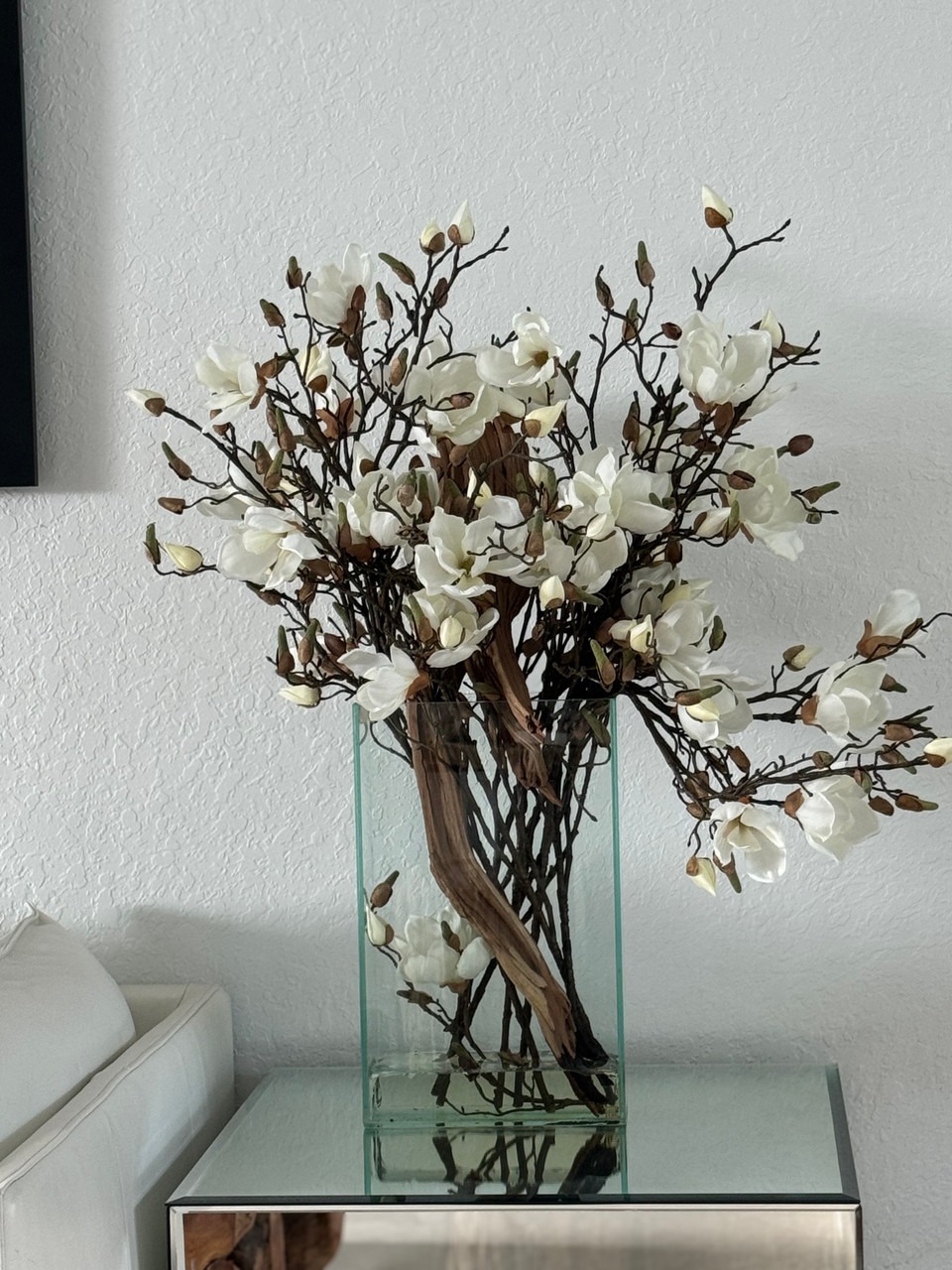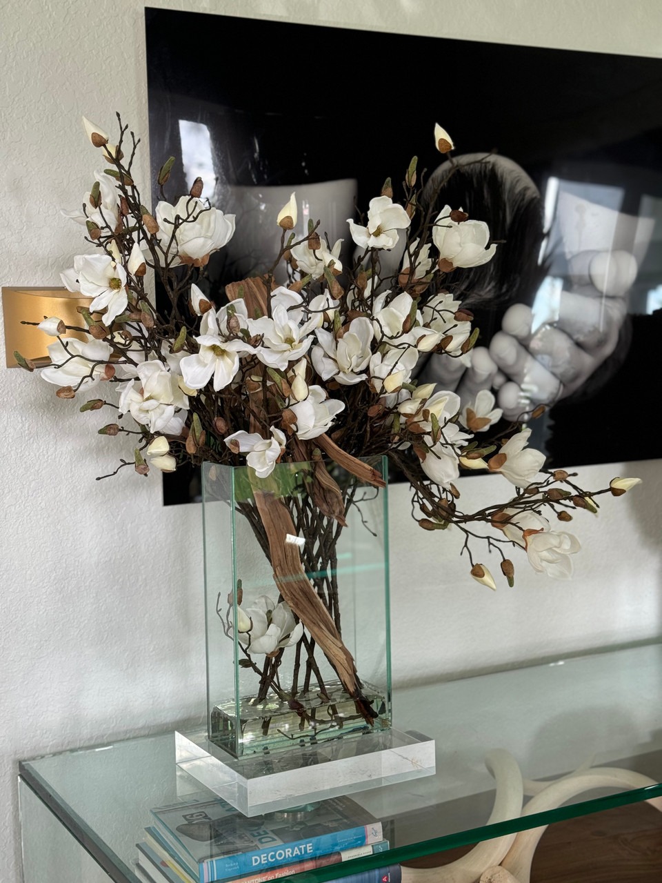 16″ tall Casa Moderna glass planter with multiple stems of white magnolia blossoms, foliage and sand blasted grape wood anchored in our illusion water. Enjoy beautiful, lifelike magnolia tree branches that won’t fade after spring awakens. Displayed here in a stylish clear glass planter, magnolia flowers are cheerful and elegant in any season. Each hand-placed blossom and leaf is crafted with vivid color and exceptional detail, a tribute to Mother Nature’s artistry. Showcase this lovely faux tree on your dining table or living room tabletop.