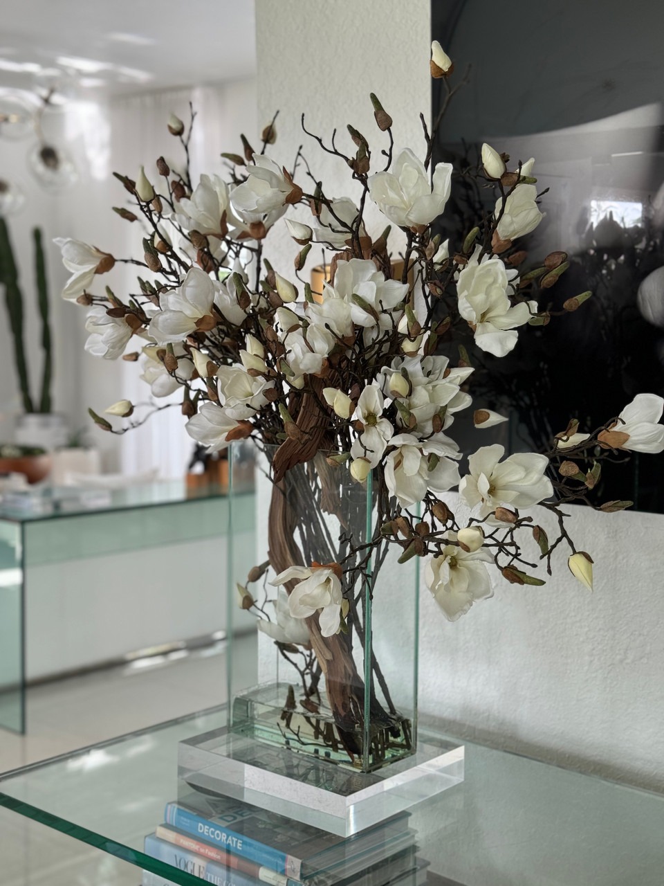 - Mix of faux white magnolia leaves and flowers in various stages of bloom, presented in a clear glass planter.