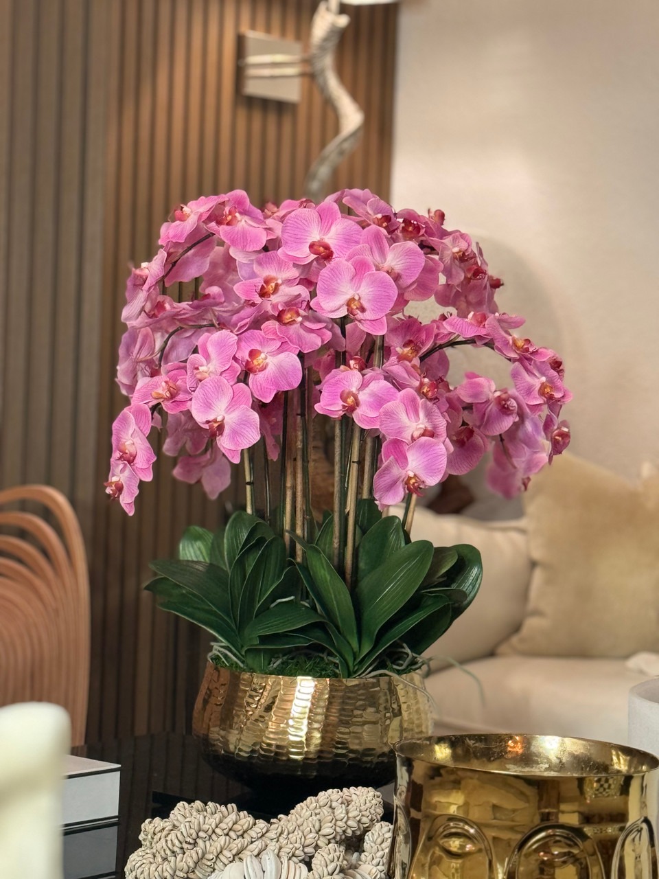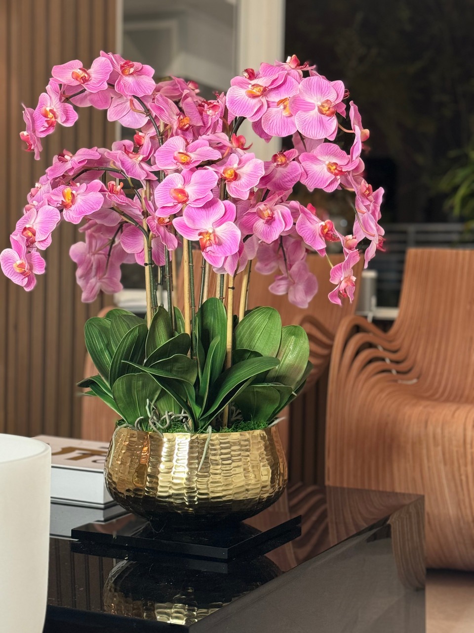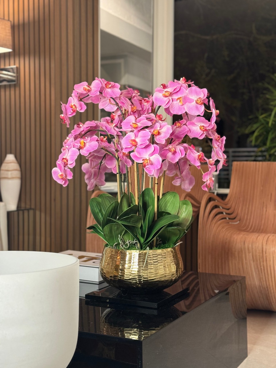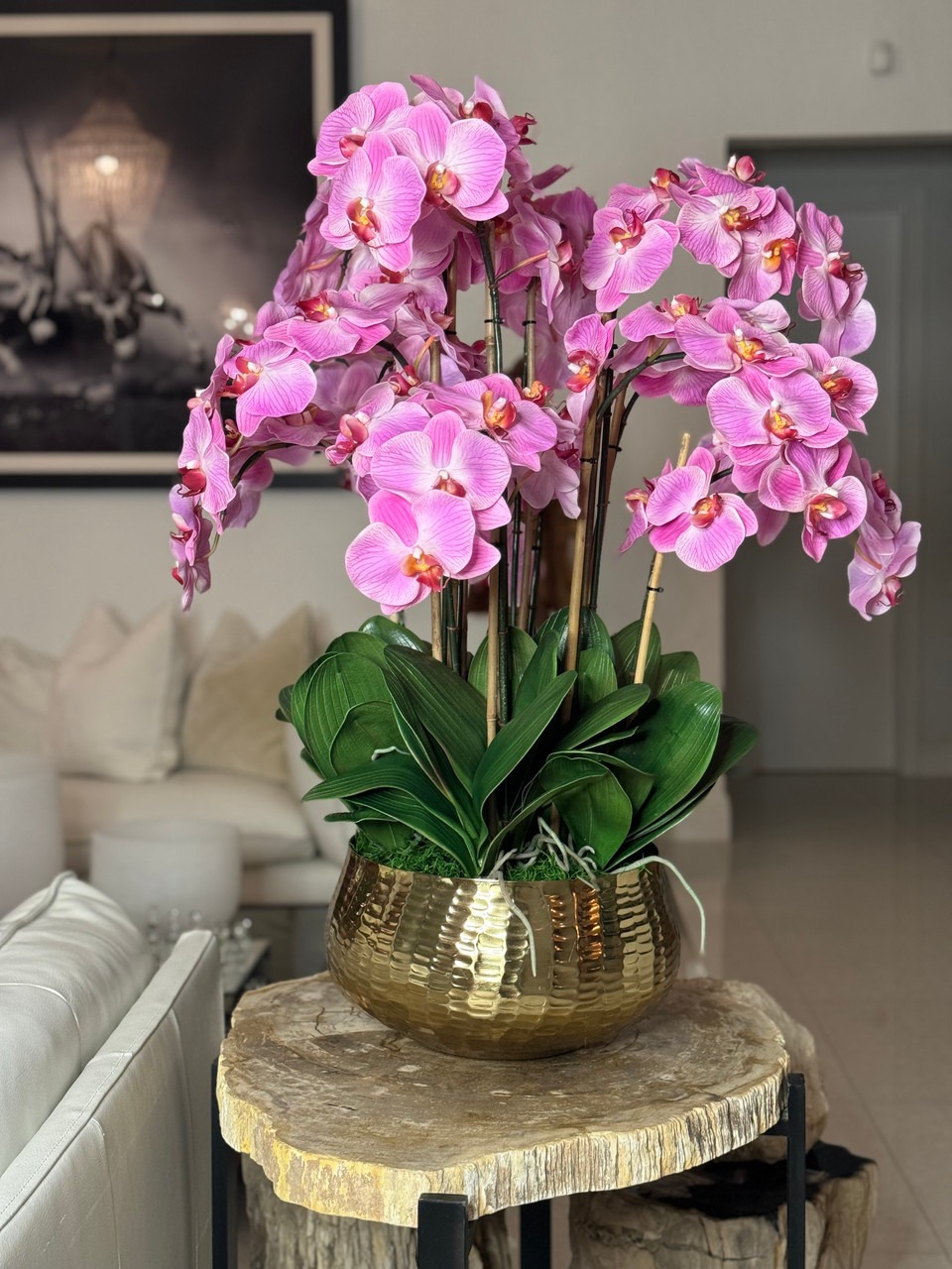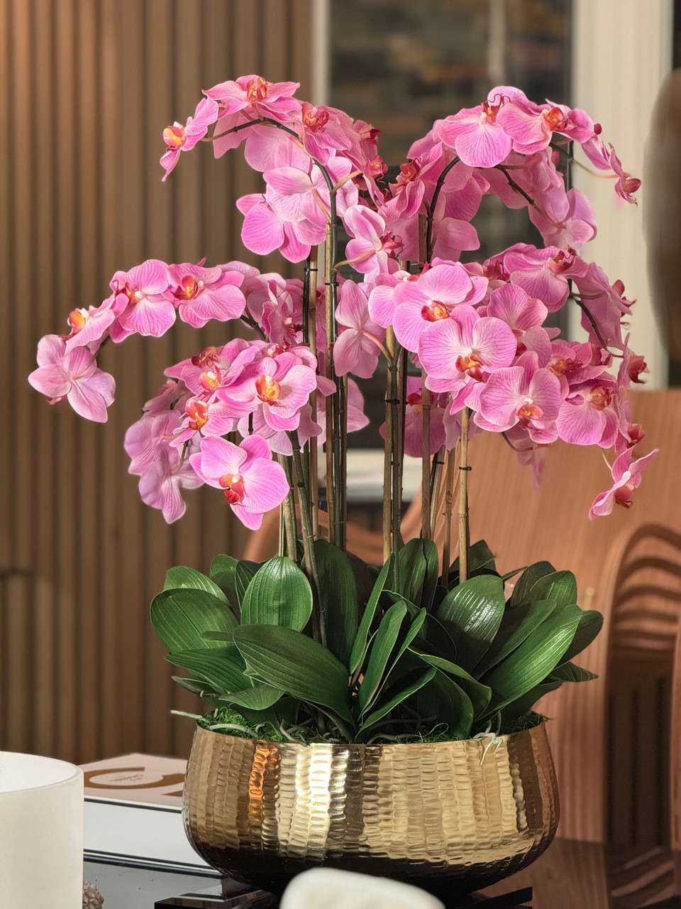 Graceful and exotic, the orchid has symbolized integrity, nobility, and luxury for centuries. Our enduring, light pink phalaenopsis arrangement captures the artistry and spirit of natural orchids. It’s prized for its profusion of perfect blooms. Vertical bamboo stakes, broad green leaves, and a genuine moss base add to the realism of this arrangement. Often called the “moth orchid,” the phalaenopsis is a favorite among our designers for its dense leaves, elegantly arching sprays and lovely blooms. Our remarkably lifelike arrangement is staked into a moss-covered base in an elegant gold planter for a timeless, authentic look that will endure for years to come. This arrangement is just the right size and is versatile enough to use as a coffee table centerpiece, a dining room or console table. It has a luscious tropical feel that will add vibrancy, color and elegance to any room. Available in medium or large Roberi Bowl.