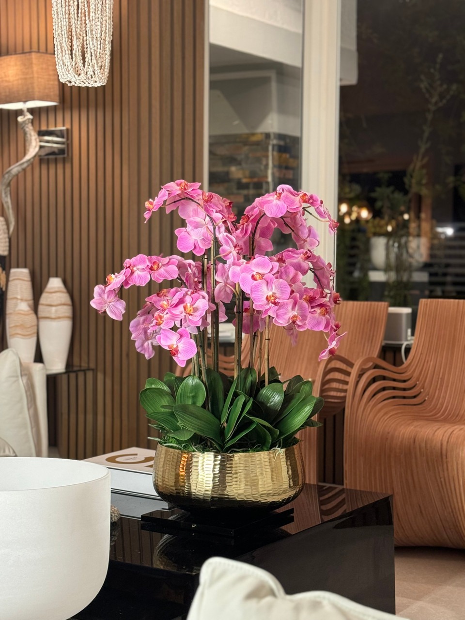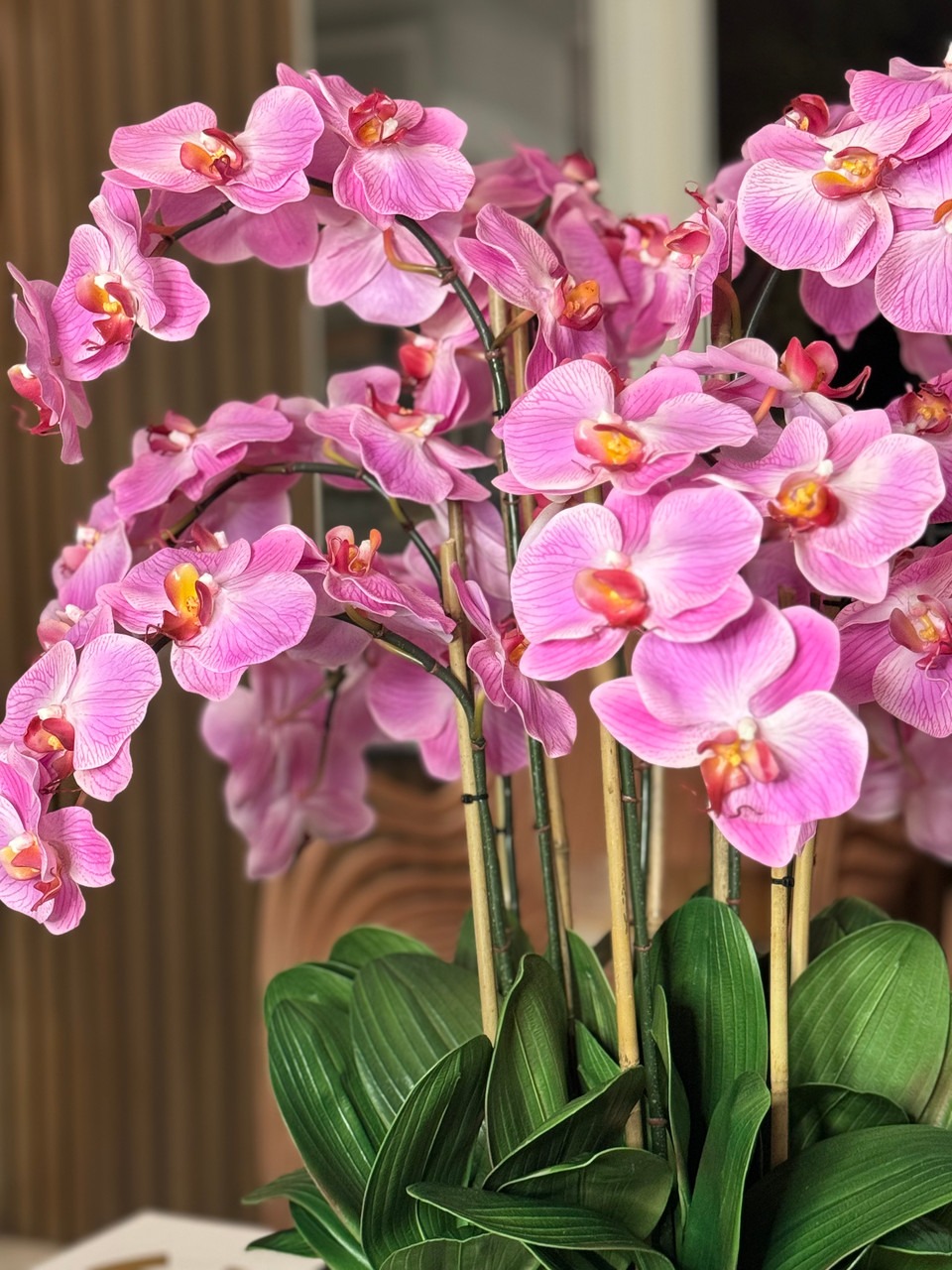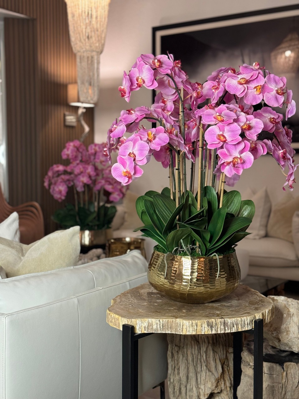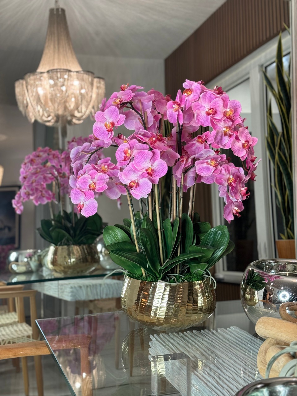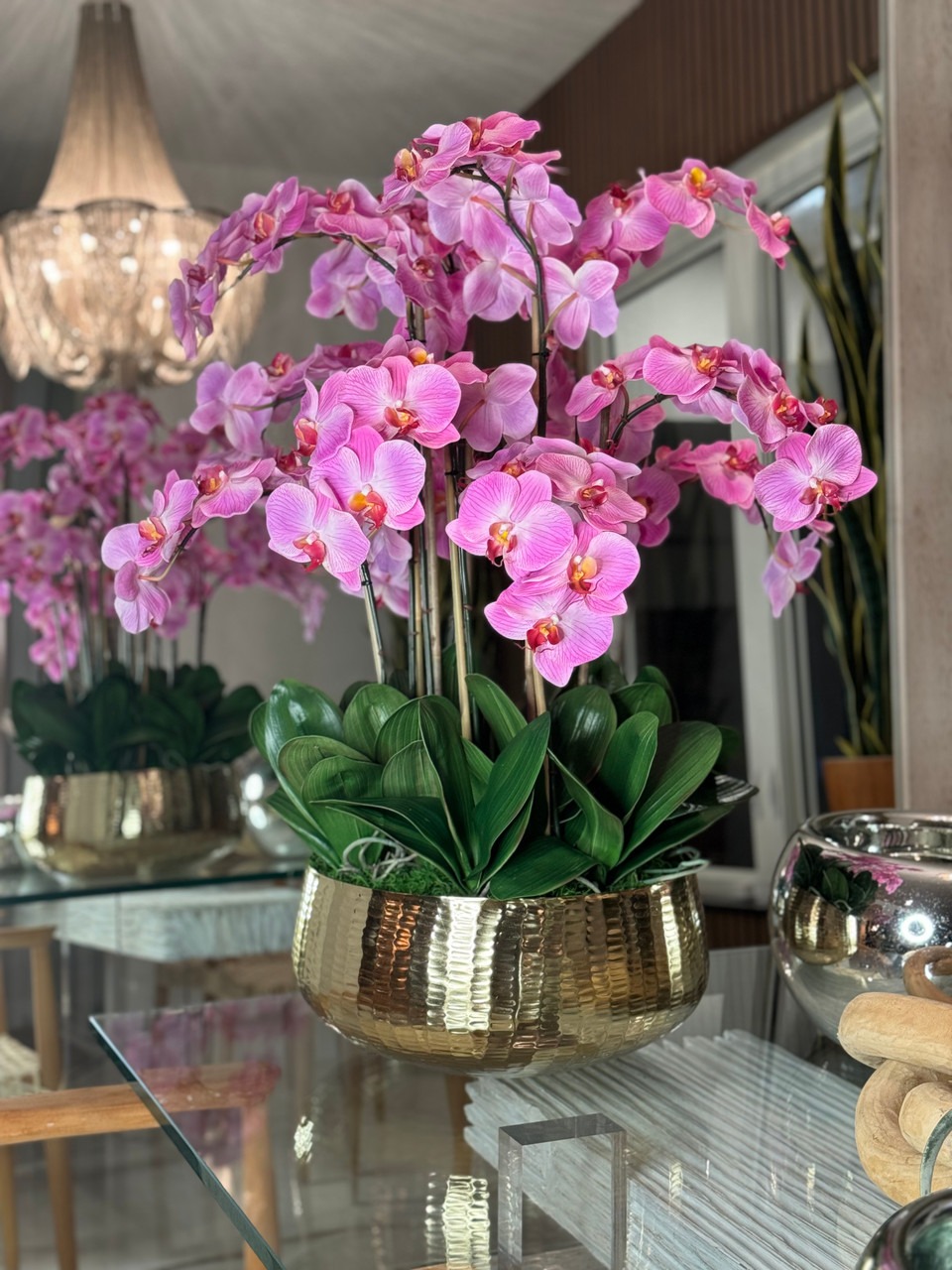 Graceful and exotic, the orchid has symbolized integrity, nobility, and luxury for centuries. Our enduring, light pink phalaenopsis arrangement captures the artistry and spirit of natural orchids. It’s prized for its profusion of perfect blooms. Vertical bamboo stakes, broad green leaves, and a genuine moss base add to the realism of this arrangement. Often called the “moth orchid,” the phalaenopsis is a favorite among our designers for its dense leaves, elegantly arching sprays and lovely blooms. Our remarkably lifelike arrangement is staked into a moss-covered base in an elegant gold planter for a timeless, authentic look that will endure for years to come. This arrangement is just the right size and is versatile enough to use as a coffee table centerpiece, a dining room or console table. It has a luscious tropical feel that will add vibrancy, color and elegance to any room. Available in medium or large Roberi Bowl.