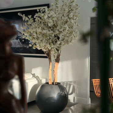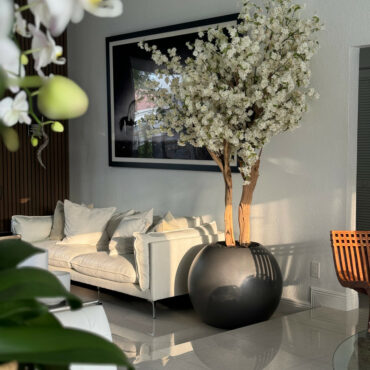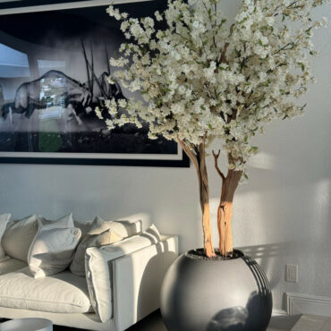 Cherry blossoms are a symbolic flower of the spring, a time of renewal, and the fleeting nature of life. Anchored in our matte gun metal 30″ globe vase which showcases a basic spherical shape, only with a modern twist. The full globe shape is the quintessential mix of traditional and contemporary styles as the round planters easily compliment any space around the home, garden or office. Its size and shape provide a perfect canvas for a our large white cherry blossom tree. Each tree is a one of a kind, flowers are placed by hand by our skilled artisans onto large wood trunks of California mountain wood. This bouquet of elegant white cherry  adds a fresh and stylish touch to any room.