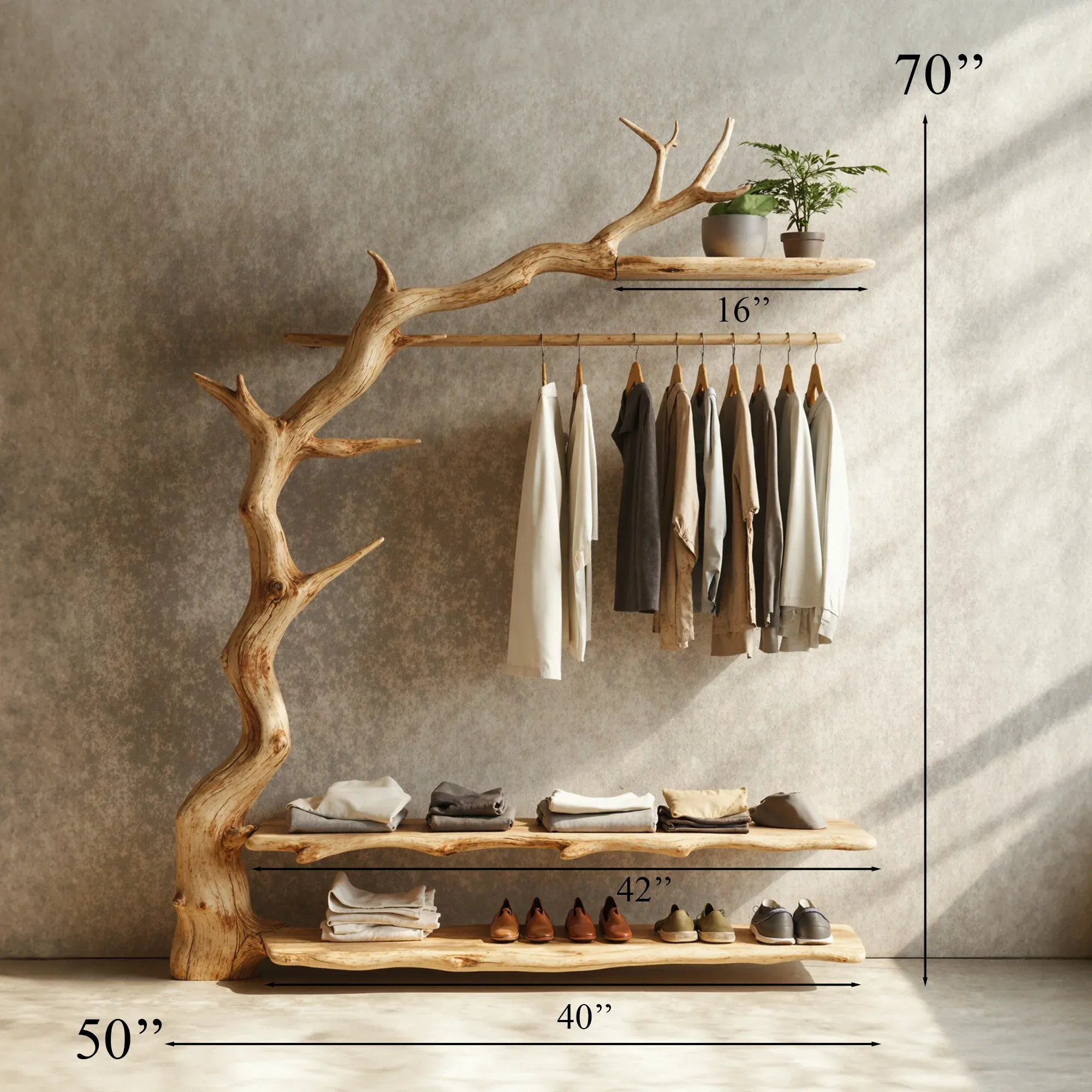 Bring a fresh and creative touch to your living space with a one-of-a-kind tree-shaped clothes and shoe rack. This product mimics the natural form of a tree, featuring soft, curving branches that add a stunning, unique element to any room.