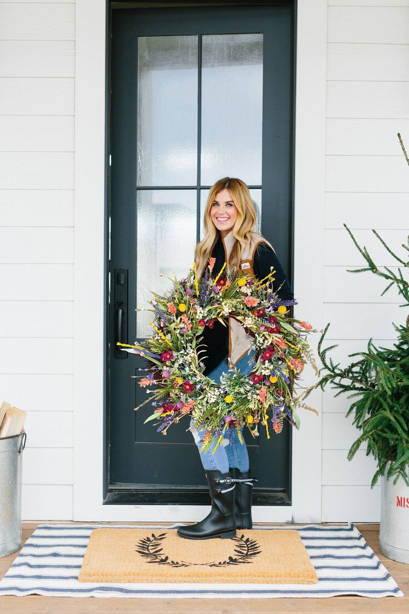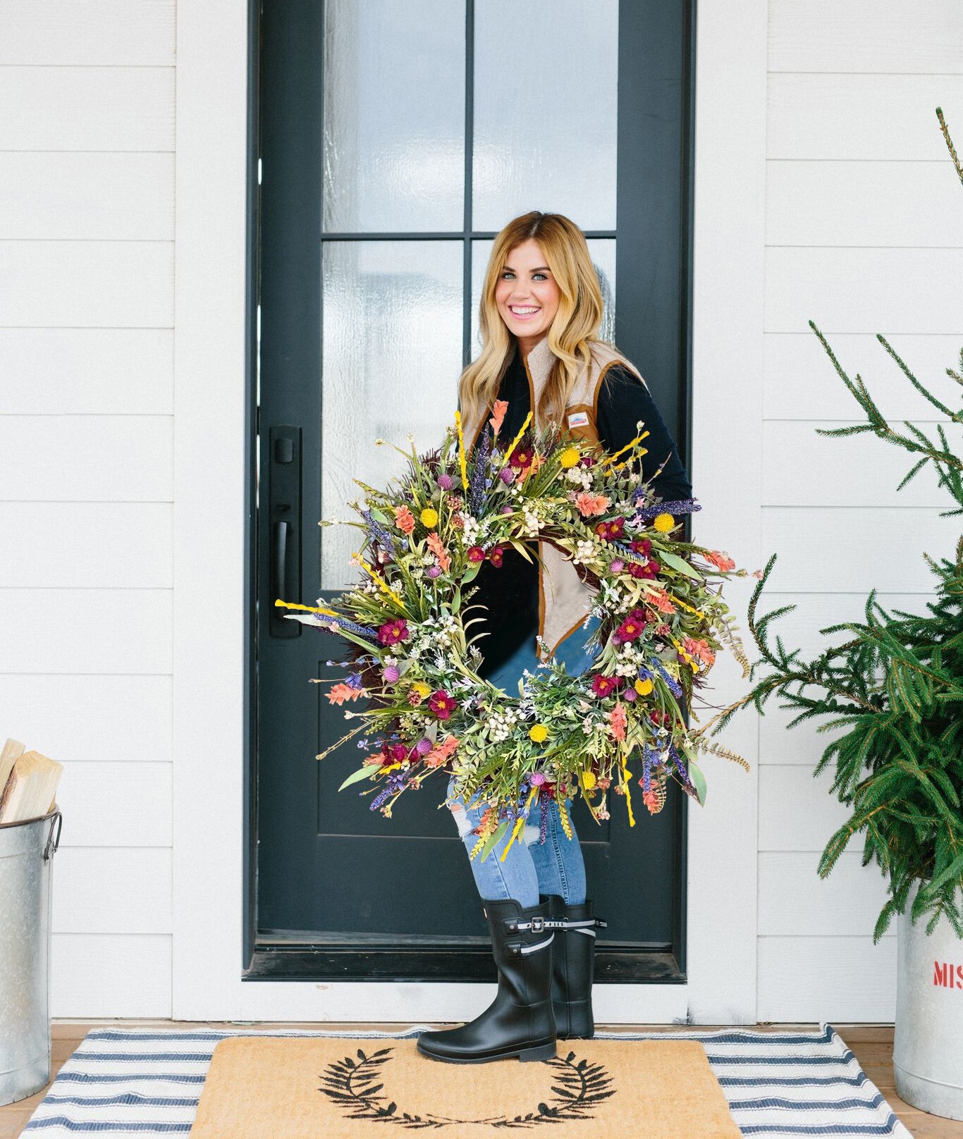 Vibrant and Elegant Designer Spring Wreath, featuring an abundance of florals and botanicals, that is exquisitely detailed for a stunning finishing touch to your Spring and Easter front door.