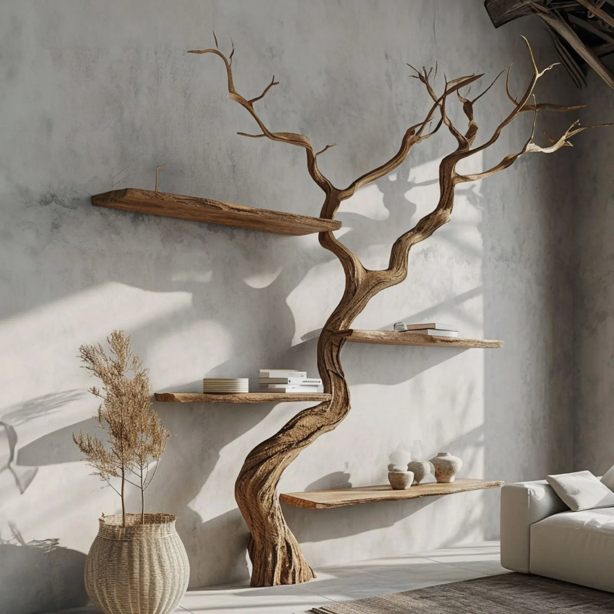 Harmonizing with the intimacy of nature and the flexibility of bookshelves, Spry Interior has created an artistic masterpiece - Treebook shelves. It offers an enhancement in the quality of living spaces, providing versatility to display various items and instilling complete confidence in its sturdiness.