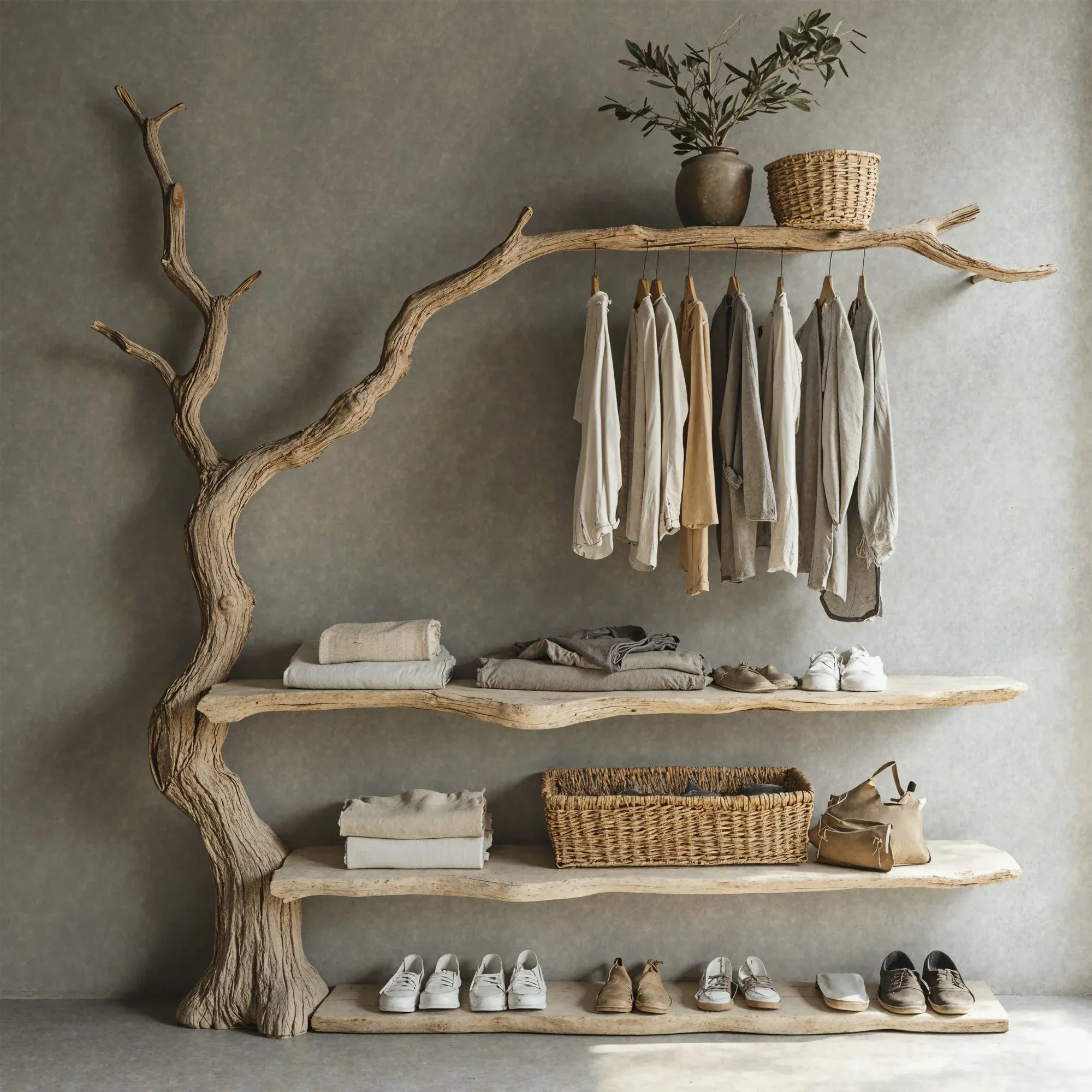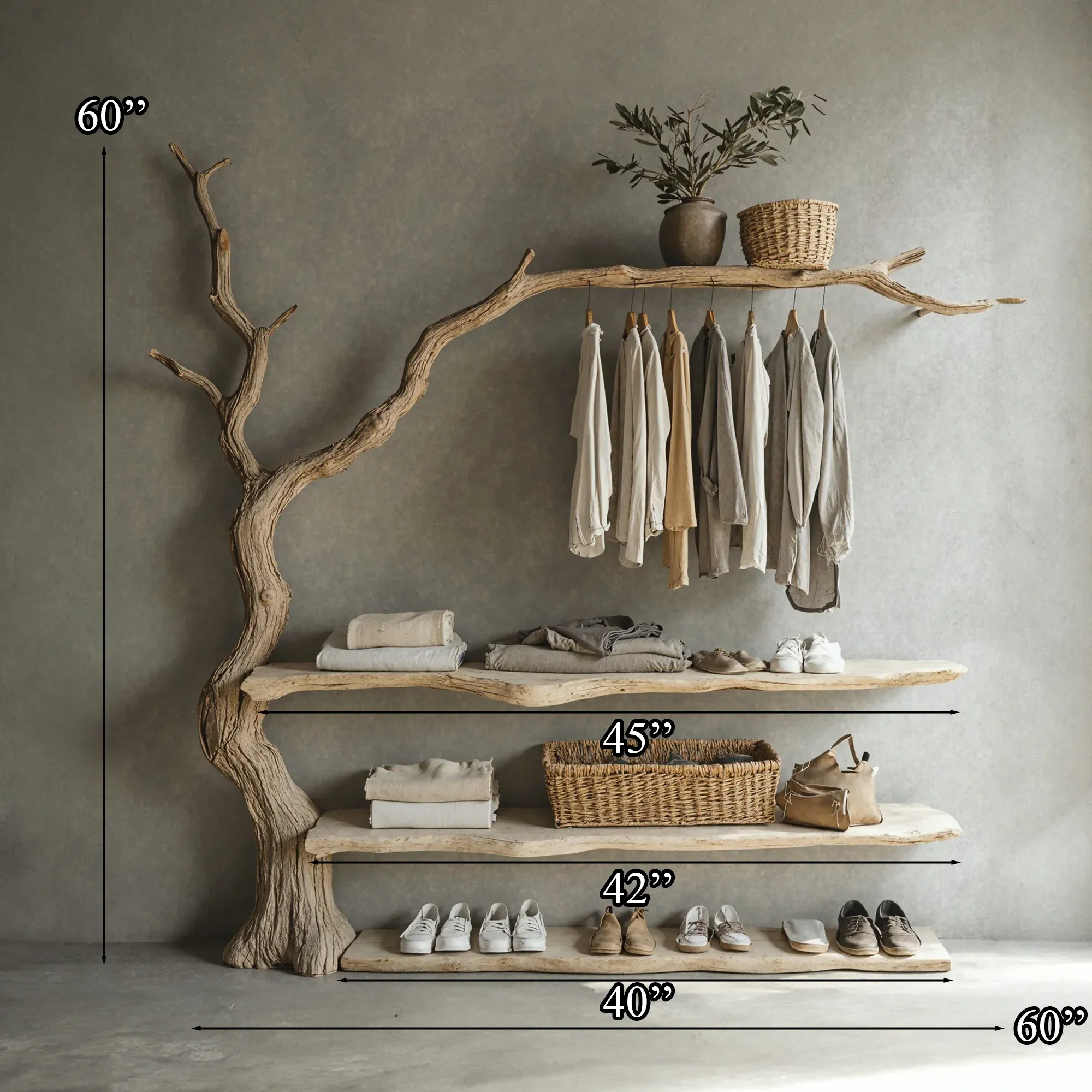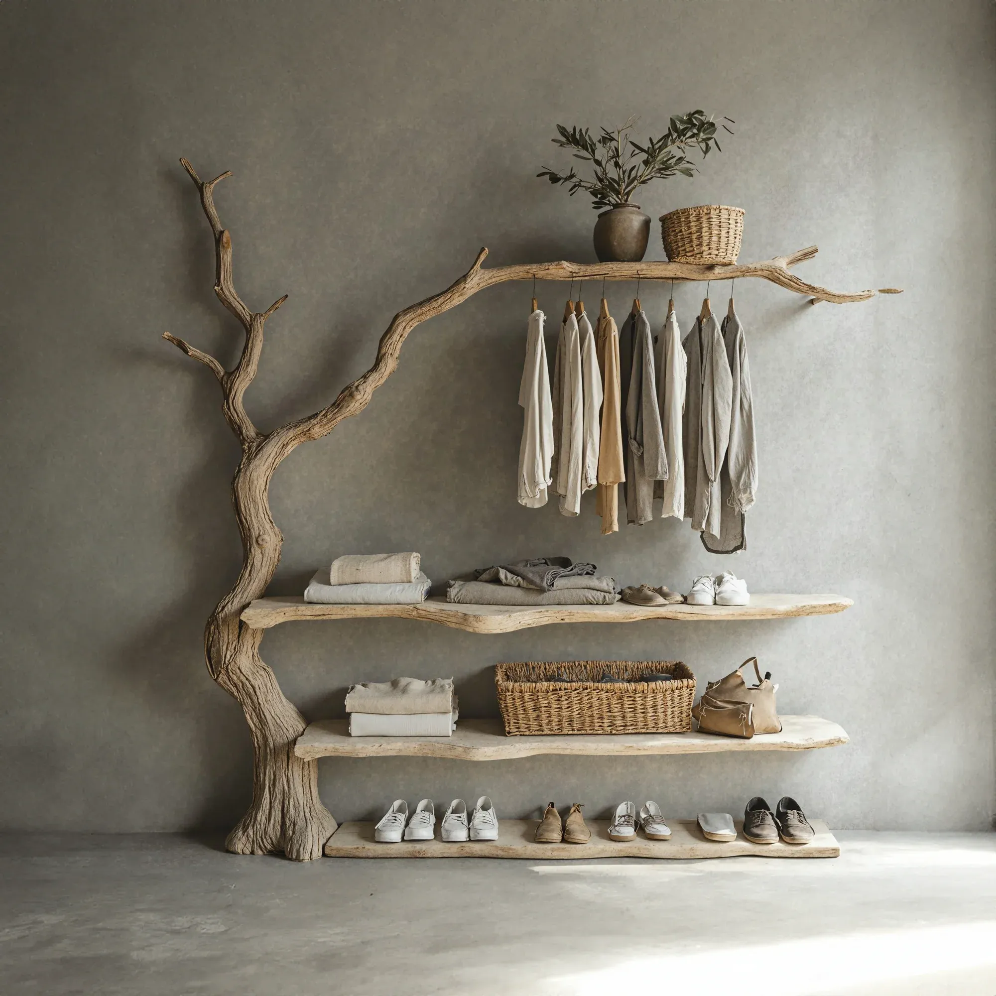 Bring a fresh and creative touch to your living space with a one-of-a-kind tree-shaped clothes and shoe rack. This product mimics the natural form of a tree, featuring soft, curving branches that add a stunning, unique element to any room.