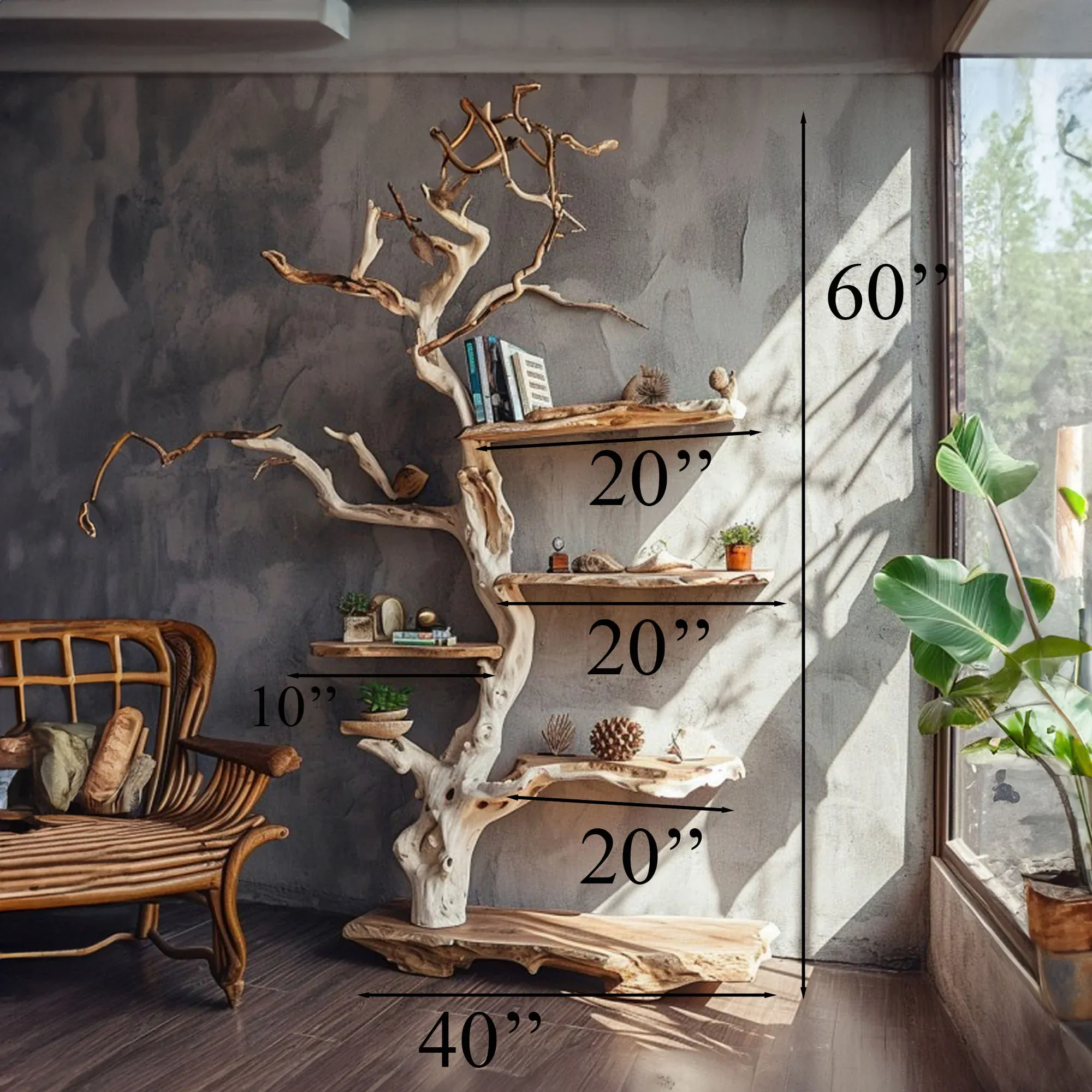 Tree branch standing corner shelf is an ordinary storage solution and a unique work of art. With their floating design, they create a strong impression and add a focal point to any room. You can easily customize the placement and number of shelves to create a space that is personal and reflects your own style.