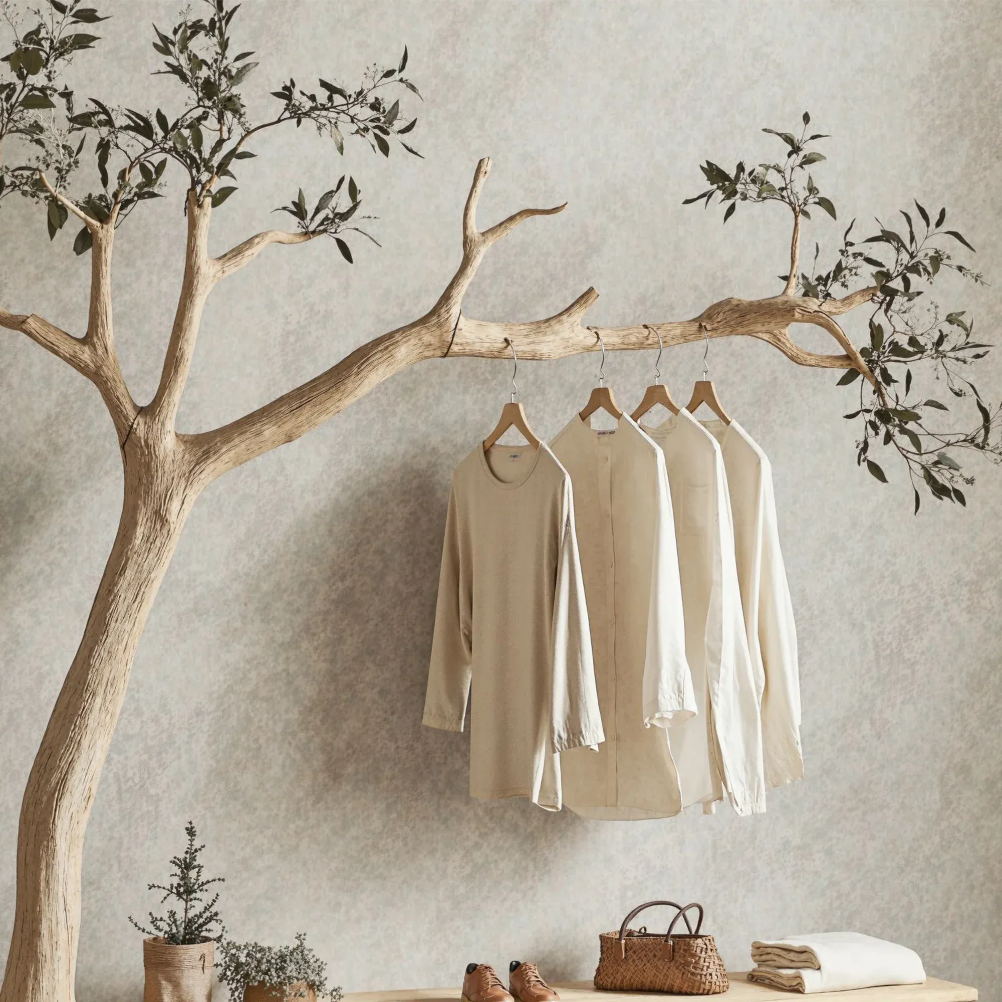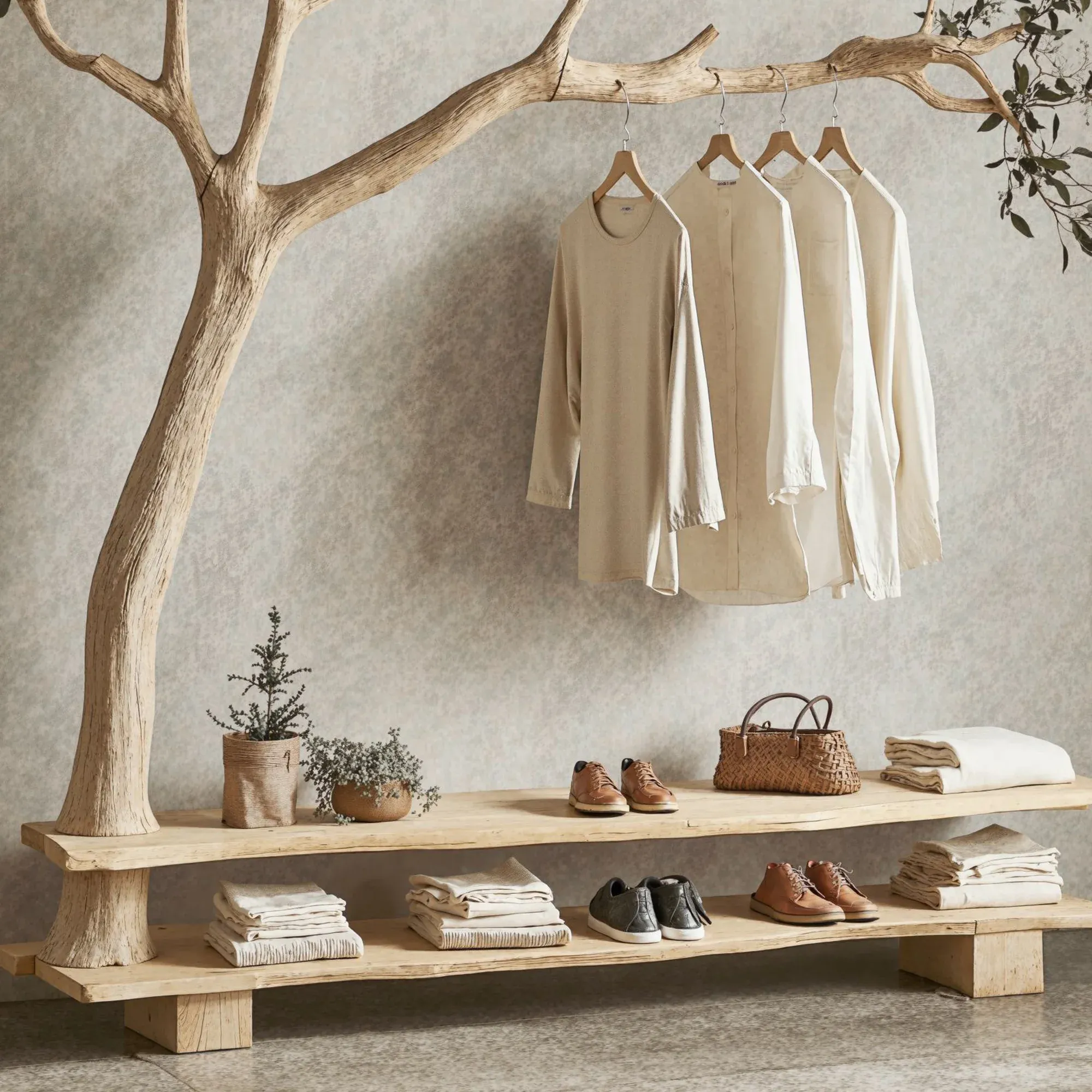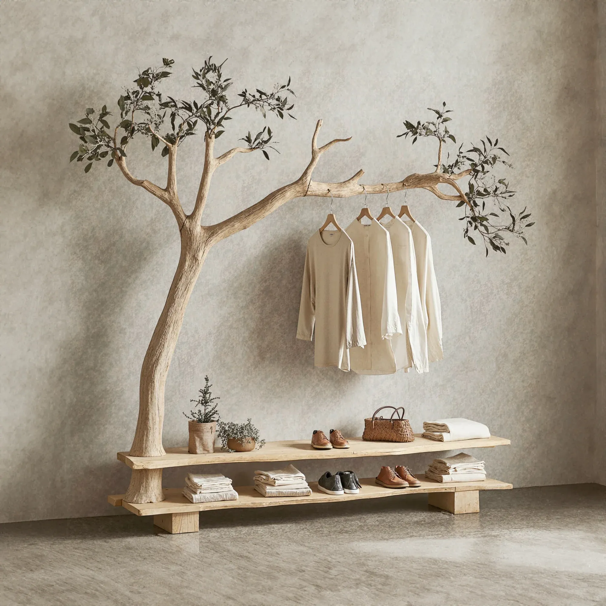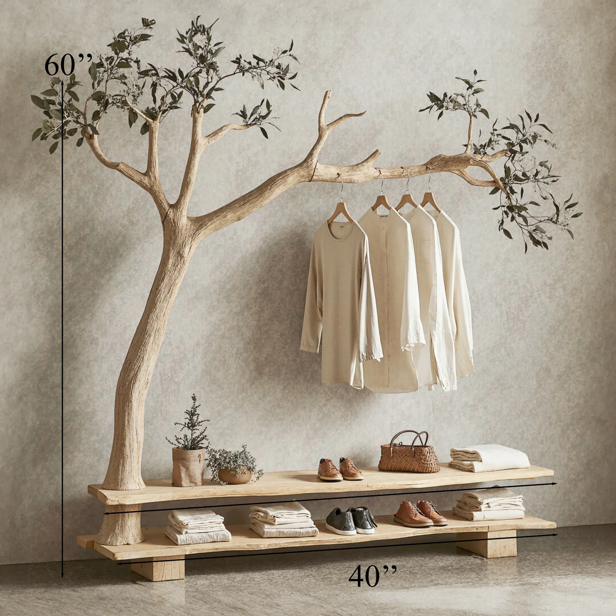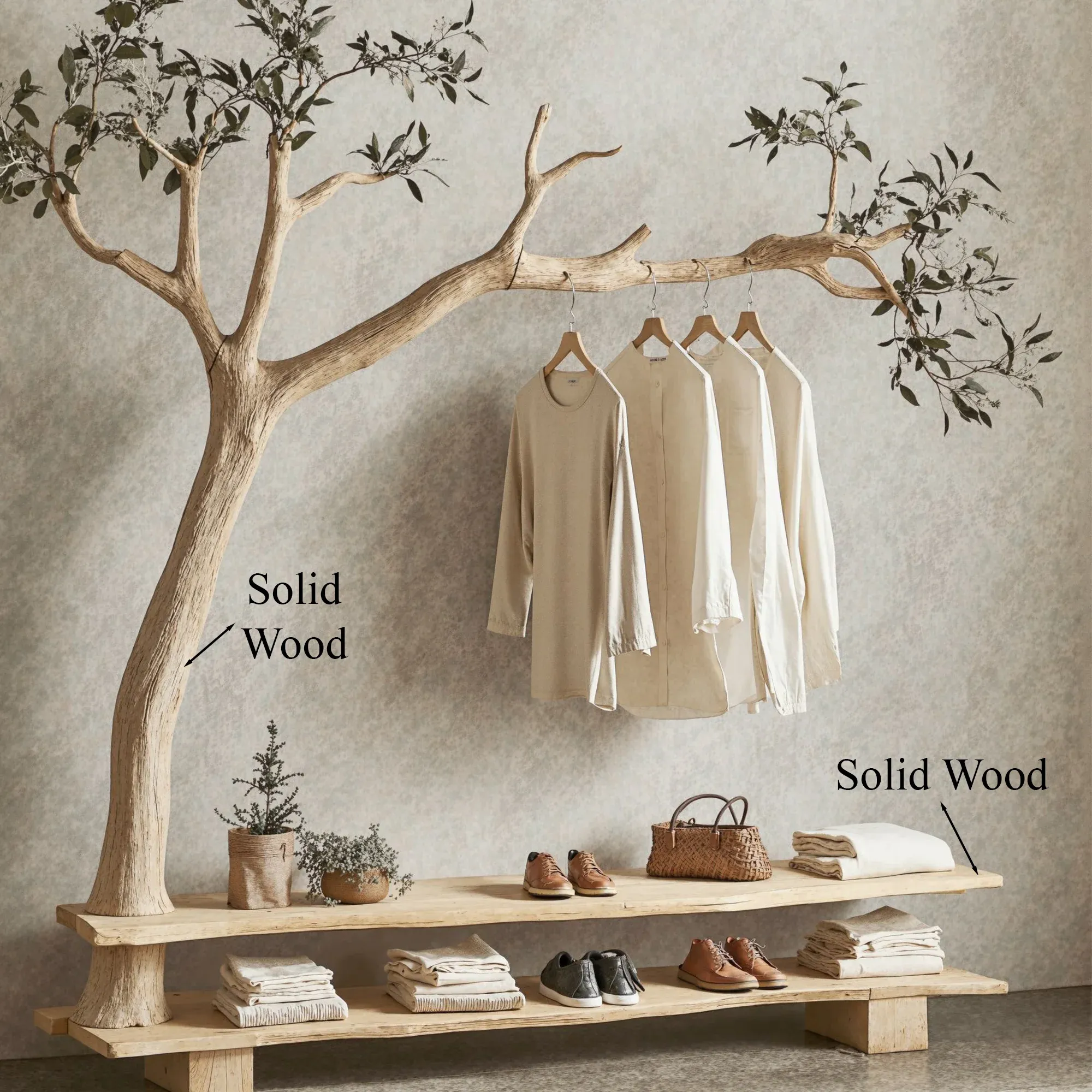 Bring a fresh and creative touch to your living space with a one-of-a-kind tree-shaped clothes and shoe rack. This product mimics the natural form of a tree, featuring soft, curving branches that add a stunning, unique element to any room.